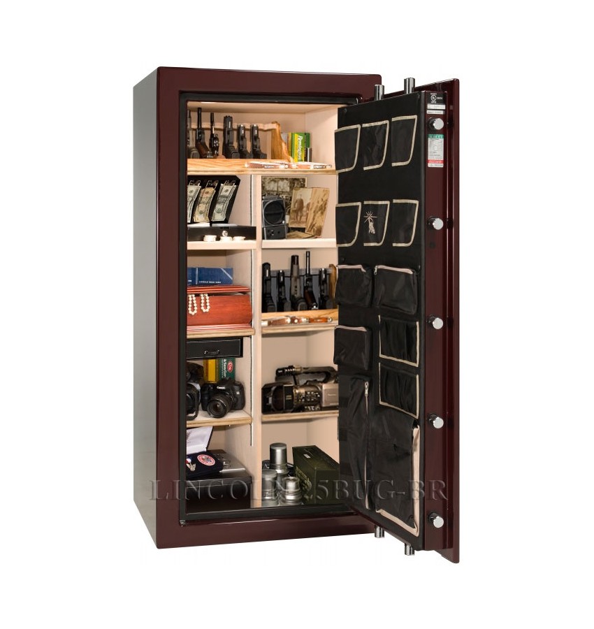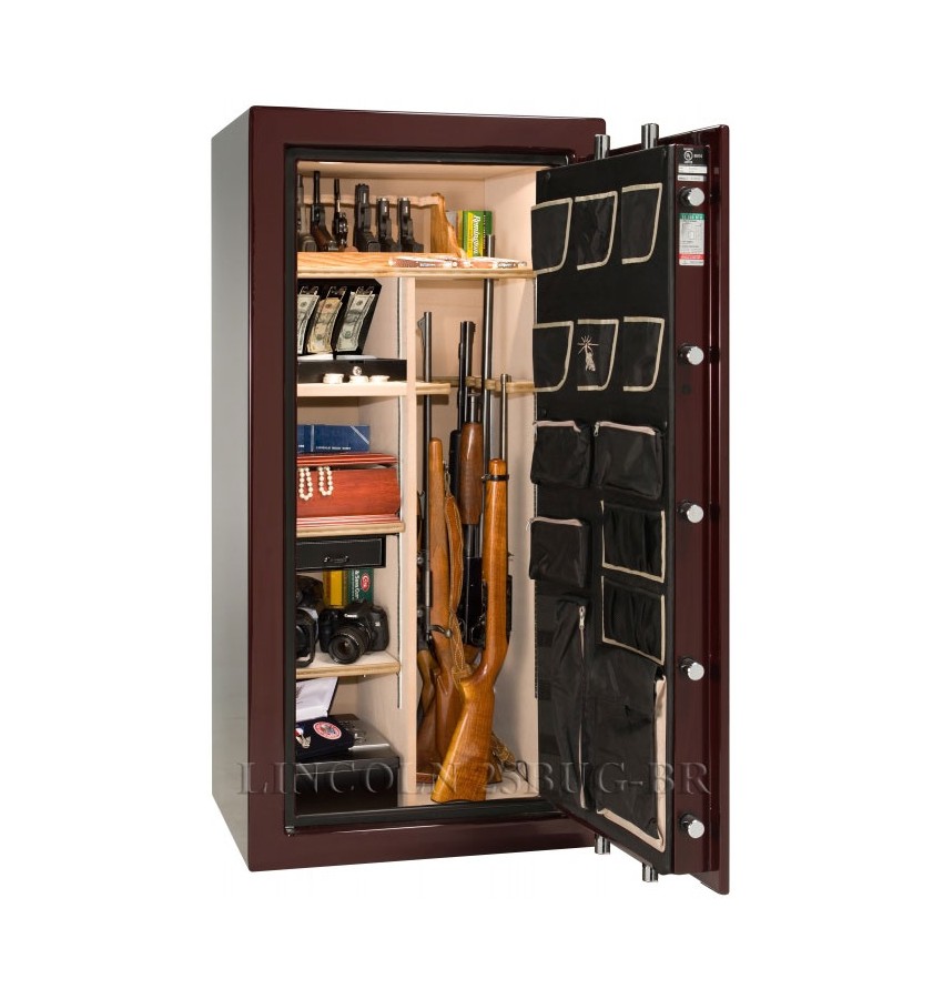 Внешняя отделка:Декоративное покрытие Высота ружей:1375мм Покрытие: Глянцевый бордо. Универсальный сейф, может использоваться как в качестве оружейного сейфа, так и в качестве личного сейфа. Производство Liberty Safe and Security Products, Inc (США, штат Юта). Сейфы Liberty сертифицированы на взломостойкость и огнестойкость в США. Полностью удовлетворяют требованиям МВД. Великолепный дизайн! Сейфы изготавливаются непосредственно в США. Замок Сейф оборудован высокосекретным электронным кодовым замком Sargent & Greenleaf (США). Этот замок вы можете по вашему желанию эксплуатировать как в режиме одного кода, так и в режимах используя от 2-х до 9-и кодов. Можно использовать иерархическую систему кодов: мастер-код – код руководителя – пользовательские коды. Инновационная защита замка – закалённой пластиной с вращающимися шариками. Шарики вращаются если в них упирается сверло. New! Кодовая панель замка теперь имеет удобную светодиодную подсветку. Защита Усиленный корпус. Дверь усиленная коробчатой конструкции. Дополнительное усиление двери внутренним стальным листом. Дверь оборудована мощной многосторонней ригельной запирающей системой, 14 активных ригелей диаметром 32мм. Специальные пластины внутри двери на рейках с ригелями для усиления защиты при попытке вскрытия монтировкой, рычагом и т.п. Инновационный поворотный запирающий механизм DX-90 MONSTER MECH с усиленной защитой. Увеличенный выход ригелей по сравнению с традиционными запирающими механизмами. Тип запирающего механизма - со смещенным центром, эксцентриковый, прямого привода. Этот запирающий механизм имеет лучшую защиту от бокового выбивания ригелей (по сравнению с традиционными запирающими механизмами). Инновационный привод поворотного запирающего механизма «SURETIGHT» с муфтой скольжения для защиты замка при приложении крутящего мышечного усилия при попытке взлома. Устойчивость к взлому сейфа не менее 30Ес. Система внутренних и внешних Fail-Safe™ relocker для блокировки замка или/и запирающего механизма при механических и термических воздействиях на замок. Security Level (взомостойкость по шкале Liberty Safe) – 24. Fire Rating 1200°F (огнестойкость при температуре в испытательной печи 649°C, заданный предел огнестойкости 177°C) – 1,5H. BTU Heat Rating (огнестойкость в Британских единицах тепловой мощности) – 95,000 BTUs. Внутреннее устройство Внутри сейфа ложементы и полки, съёмные с регулируемой высотой установки. Внутренняя поверхность корпуса, а также внутренние элементы имеют мягкую отделку. Сейф имеет удобный выдвижной ящик для хранения драгоценностей. Внутренняя поверхность двери сейфа имеет держатели для пистолетов, карманы, держатели для ножей и т.п., удобные закрывающиеся сумки. Так же имеются два специальных закрывающихся пакета COOL POCKET™ для хранения особо важных документов. Они изготовлены из специальных материалов и обеспечивают дополнительную тепловую защиту. Сейф имеет электрическую светодиодную подсветку с датчиком движения. Подсветка включается автоматически при открывании двери сейфа. Сейф укомплектован внутренним электрическим осушителем. Для подключения сейфа к Российской электрической сети необходим специальный понижающий трансформатор, который приобретается дополнительно. Установка Конструкцией сейфа предусмотрена возможность его крепления к полу. Дополнительная информация В сейфе ружья можно хранить к