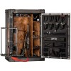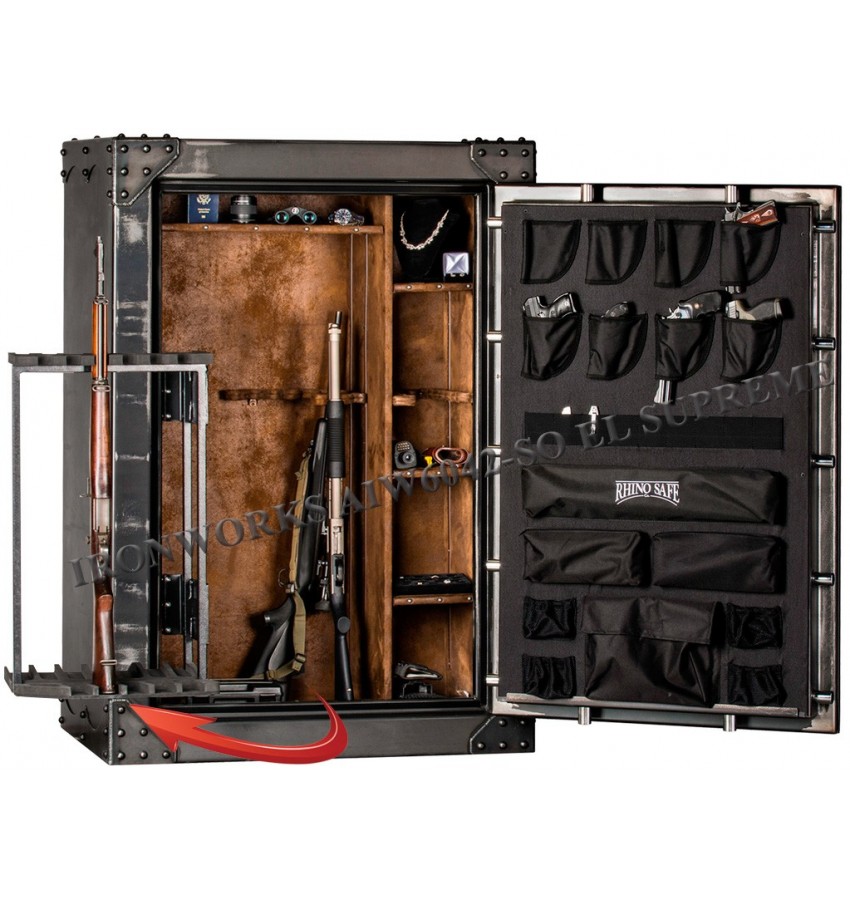 Современный американский сейф, изготовленный в старинном дизайне. Эти сейфы хорошо сочетаются как с современными интерьерами жилых помещений и офисов, а так же с такими интерьерами, как лофт, индастриал, винтаж, кантри и т.д. Производство Rhino Safe (США). Сейфы Rhino сертифицированы на взломостойкость и огнестойкость в США. Сейфы этой серии соответствуют или превосходят требования стандарта Департамента Юстиции штата Калифорния, предъявляемые к оружейным сейфам. Полностью удовлетворяют требованиям МВД к хранению оружия. Сейфы изготавливаются непосредственно в США. Замок Сейф оборудован высокосекретным электронным кодовым замком KABA La Gard (США). Защита замка - запатентованной бронепластиной RhinoPlate™ из карбида вольфрама. Имеется система relocker для блокировки замка или/и запирающего механизма при несанкционированных воздействиях на замок. Защита Усиленный корпус. Дополнительное усиление угловых граней корпуса специальными приварными накладками. Дверь усиленная коробчатой конструкции. Дополнительное усиление двери стальной пластиной толщиной 6,35 мм. Крупные заклёпки на двери и на корпусе имеют не только декоративную, но и дополнительную защитную функцию. Дверь сейфа оборудована мощной четырёхсторонней запирающей системой типа F-4 (запатентована) с увеличенной защитой от сверления и ударных воздействий. Четырнадцать активных ригелей диаметром 32мм. Увеличенный выход ригелей по сравнению с традиционными запирающими механизмами. Межстеночное пространство сейфа имеет многослойный огнестойкий наполнитель. Fire Rating 1200°F (огнестойкость при температуре в испытательной печи 649°C, заданный предел огнестойкости 177°C) – 1,5H. Для дополнительной защиты от проникновения при пожаре раскалённых газов и дыма внутрь сейфа – предусмотрен уплотнительный контур на двери и на корпусе сейфа. Эти уплотнительные прокладки выполнены из специального термостойкого материала и расширяются при пожаре, обеспечивая дополнительную герметичность. Внутреннее устройство Внутри сейфа ложементы и полки, съёмные с регулируемой высотой установки. Шаг перестановки 13мм. Так же в сейфе имеется удобный выдвижной лафет, обеспечивающий комфортный доступ к оружию. На лафет ружья можно устанавливать не только прикладом вниз, но и прикладом вверх. Пространство под лафетом можно использовать для хранения коробок с патронами и т.п. Внутренняя поверхность корпуса, а также внутренние элементы имеют мягкую отделку. Для внутренней отделки используется современная экозамша с эффектом потёртой буйволиной кожи. Внутренняя поверхность двери сейфа имеет держатели для пистолетов, карманы, держатели для ножей и т.п., удобные закрывающиеся сумки. Сейф имеет электрическую светодиодную подсветку с датчиком движения. Подсветка включается автоматически при открывании двери сейфа. В сейфе ружья можно хранить как по одну сторону от перегородки, так и по обе стороны от перегородки а так же и в выдвижном лафете. Установка Конструкцией сейфа предусмотрена возможность его крепления к полу. Дополнительная информация Дизайн этих современных американских сейфов выполнен в стиле сейфов второй половины 19 века. Потёртости покрытия и внутренней отделки не являются дефектом или браком, а являются элементами дизайна сейфов Rhino Ironworks®. Дизайн сейфов запатентован в США. Дверь сейфа открывает