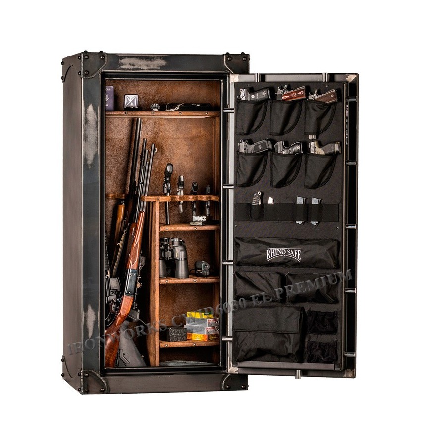 Современный американский сейф изготовленный в старинном дизайне. Эти сейфы хорошо сочетаются как с современными интерьерами жилых помещений и офисов, а так же с такими интерьерами, как лофт, индастриал, винтаж, кантри и т.д. Производство Rhino Safe (США). Сейфы Rhino сертифицированы на взломостойкость и огнестойкость в США. Сейфы этой серии соответствуют или превосходят требования стандарта Департамента Юстиции штата Калифорния, предъявляемые к оружейным сейфам. Полностью удовлетворяют требованиям МВД к хранению оружия. Сейфы изготавливаются непосредственно в США. Замок Сейф оборудован высокосекретным электронным кодовым замком KABA La Gard (США). Защита замка - запатентованной бронепластиной RhinoPlate™ из карбида вольфрама. Имеется система relocker для блокировки замка или/и запирающего механизма при несанкционированных воздействиях на замок. Защита Усиленный корпус. Дополнительное усиление угловых граней корпуса специальными приварными накладками. Дверь усиленная коробчатой конструкции. Дополнительное усиление двери стальной пластиной толщиной 4,8 мм. Крупные заклёпки на двери и на корпусе имеют не только декоративную, но и дополнительную защитную функцию. Дверь сейфа оборудована мощной четырёхсторонней запирающей системой типа F-4 (запатентована) с увеличенной защитой от сверления и ударных воздействий. Тринадцать ригелей (из них 8 активных) диаметром 25мм. Увеличенный выход ригелей по сравнению с традиционными запирающими механизмами. Межстеночное пространство сейфа имеет многослойный огнестойкий наполнитель. Fire Rating 1200°F (огнестойкость при температуре в испытательной печи 649°C, заданный предел огнестойкости 177°C) – 1,25H. Для дополнительной защиты от проникновения при пожаре раскалённых газов и дыма внутрь сейфа – предусмотрен уплотнительный контур между дверью и корпусом сейфа. Эти уплотнительные прокладки выполнены из специального термостойкого материала и расширяются при пожаре, обеспечивая дополнительную герметичность. Внутреннее устройство Внутри сейфа ложементы и полки, съёмные с регулируемой высотой установки. Шаг перестановки 13мм. Внутренняя поверхность корпуса, а также внутренние элементы имеют мягкую отделку. Для внутренней отделки используется современная экозамша с эффектом потёртой буйволиной кожи. Внутренняя поверхность двери сейфа имеет держатели для пистолетов, карманы, держатели для ножей и т.п., удобные закрывающиеся сумки. В сейфе ружья можно хранить как по одну сторону от перегородки, так и по обе стороны от перегородки. Установка Конструкцией сейфа предусмотрена возможность его крепления к полу. Дополнительная информация Дизайн этих современных американских сейфов выполнен в стиле сейфов второй половины 19 века. Потёртости покрытия и внутренней отделки не являются дефектом или браком, а являются элементами дизайна сейфов Rhino Ironworks®. Дизайн сейфов запатентован в США. Дверь сейфа открывается полностью на 180°, что обеспечивает более удобный доступ к хранимым в сейфе предметам. Имеются три серии сейфов Rhino Ironworks®, отличающихся огнестойкостью и взломостойкостью. В порядке увеличения огнестойкости и взломостойкости эти серии располагаются так: PSIW Home; SWID Premium; AIW Supreme.