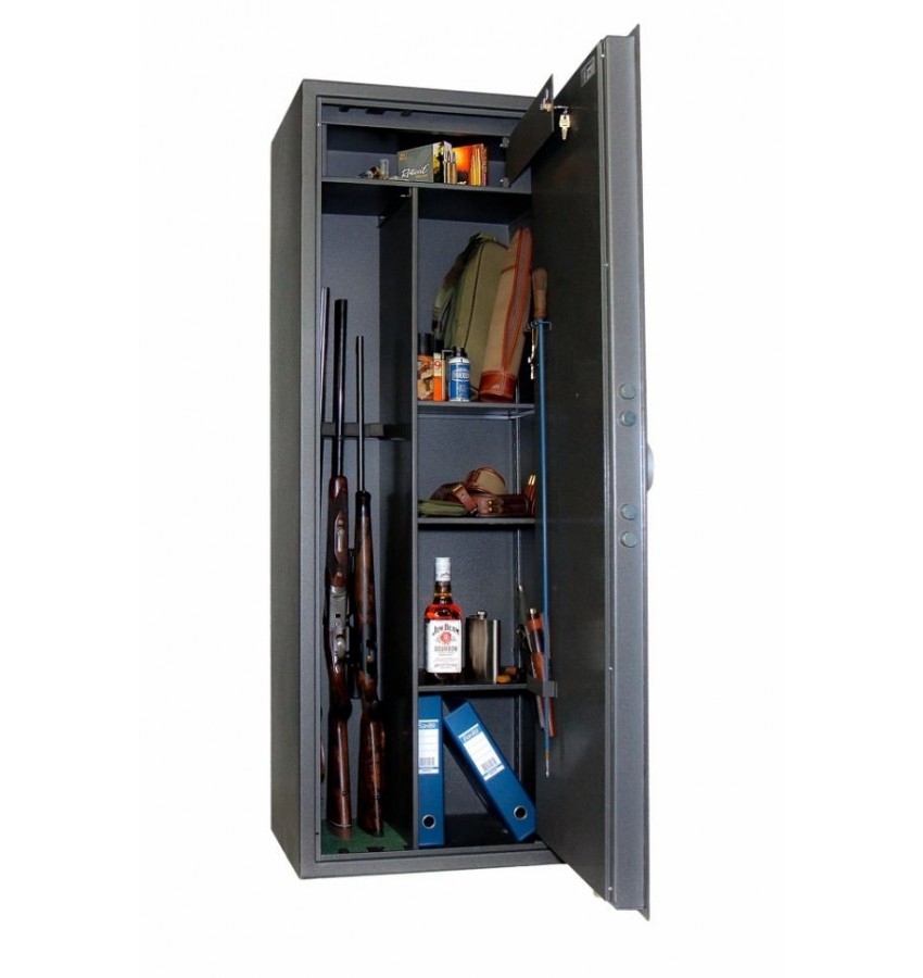 ОписаниеЭто вместительный взломостойкий сейф для хранения гладкоствольного и нарезного оружия вместе с ценностями и документами. В отличие от большинства оружейных шкафов, серия TSS изготавливается в полном соответствии с технологией 1 класса, благодаря чему вам обеспечена защита не только от доступа к оружию нежелательных лиц, но и от взломщиков-профессионалов. Первый уровень устойчивости к взлому подтверждён европейскими стандартами: EuroVDS (Германия) и CSN-9160010 (Чехия), а также ГОСТ Р 50862-2005. Модель целиком отвечает требованиям МВД РФ к хранению огнестрельного оружия (заключение НИЦ «Охрана» МВД РФ) и гарантирует вам безопасное содержание не менее трёх стволов длиной до 1,4 метра, холодного оружия и боеприпасов, а также умеренного количества денег и ценных вещей. Сейф снабжён качественным электронным замком производства SAFEtronics (Словакия) и зависимым ключевым замком. Чтобы предотвратить высверливание, в область замка встроены твердосплавные пластины из марганцовистой стали. Корпус модели 160EM/K3 состоит из двух стальных листов по 3 мм и находящегося между ними десятимиллиметрового слоя специального материала SMREKOLIT. Дверь сейфа усилена пятимиллиметровой стальной пластиной; её общая толщина равна 80 мм. Для запирания применяется трёхсторонний ригельный механизм. В верхней части сейфа имеется встроенный трейзер – снабжённое ключом отделение, подходящее для патронов и ценностей некрупных размеров. Также в комплект входят три съёмные полочки, позволяющие оптимально распланировать внутреннее пространство сейфа. В целях повышения надёжности существует возможность анкерного крепления модели к полу и стенам. Корпус обработан защитным покрытием порошкового типа, придающим вашему сейфу благородный тёмно-серый цвет.