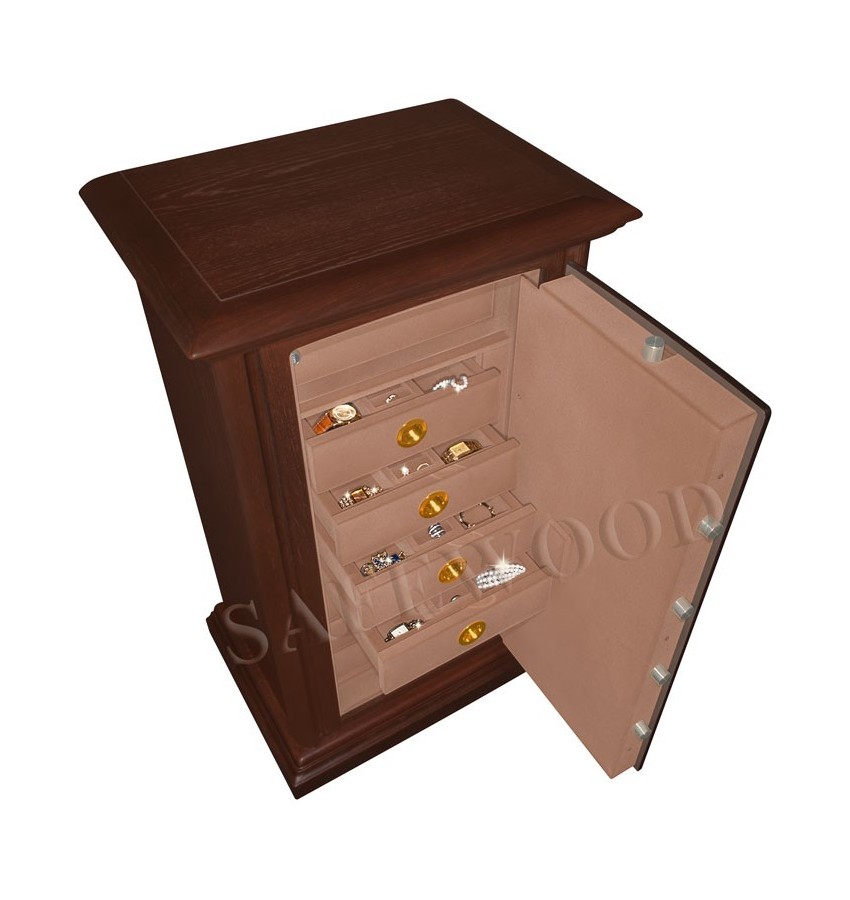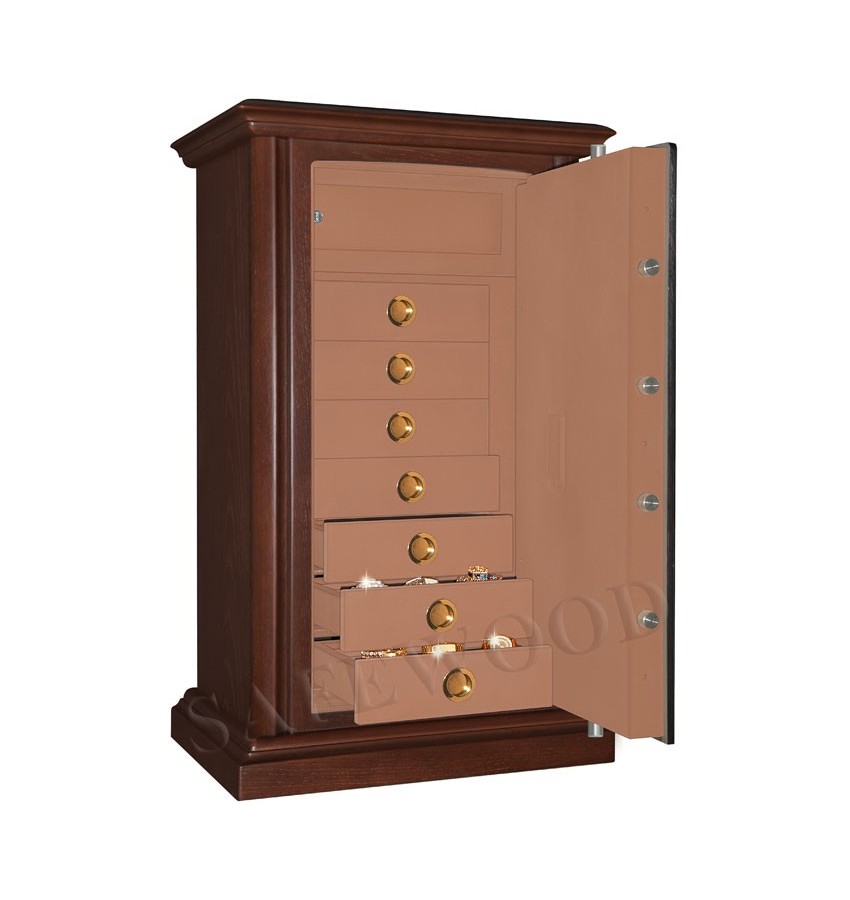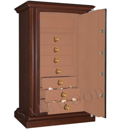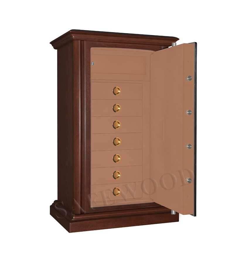 Элитный сейф с отделкой натуральным деревом. Вся внутренняя поверхность сейфа имеет престижное мягкое покрытие флокированием бархатом. Сейф сертифицирован на устойчивость к взлому – 1 класс. Умеренная огнестойкость – приблизительно 20Б. Корпус имеет двойные стальные стенки, межстеночный наполнитель – бетон. Металлические детали сейфа имеют гигиенически-безопасное, коррозионно-стойкое полимерно-порошковое покрытие на основе материалов производства ЕС. Замок Сейф оборудован электронным кодовым замком PS-300 либо высокосекретным электронным кодовым замком Mauer (Германия). Уточняйте при покупке. Такие замки Вы можете по Вашему выбору эксплуатировать в режиме одного пользовательского кода, либо в режиме двух кодов (мастер-код и рабочий код). Вы можете выбрать кодовую панель электронного замка – Хром либо Gold. Варианты кодовых панелей представлены на дополнительном фото. Стоимость сейфа и гарантия зависит от типа замка и кодовой панели. Цена приведена для случая поставки сейфа с замком PS-300 с кодовой панелью Хром. При поставке с замком PS-300 с кодовой панелью Gold доплата 16300 рублей. При поставке с замком Mauer (Германия) с кодовой панелью Хром доплата 10900 рублей. При поставке с замком Mauer (Германия) с кодовой панелью Gold доплата 22300 рублей. Кодовые панели Gold имеют покрытие золотом 24 карата. На кодовую панель Mauer Gold имеется европейский сертификат. При поставке сейфа с электронным кодовым замком замком PS-300 ( с любой кодовой панелью) - гарантия на сейф – 5 лет, гарантия на замок составляет 2 года. При поставке сейфа с электронным кодовым замком Mauer (Германия) ( с любой кодовой панелью) гарантия – 5 лет, как на замок, так и на сейф. Защита Сейф имеет усиленную коробчатую дверь, передний лист двери – сталь 10мм. Петли – внутренние. Имеется защита замка от высверливания твёрдосплавной пластиной. Мощная запирающая система с запиранием по всем сторонам. Вращающиеся ригели диаметром 25мм. Внутреннее устройство Внутри сейфа запираемое кассовое отделение и семь выдвижных лотков. Выдвижные лотки могут быть изготовлены с различными видами вставок (для хранения часов, ювелирных изделий и др.) либо без них. По желанию заказчика возможно изменение количества лотков и полок. Установка Предусмотрена возможность крепления сейфа к полу. Модификации По желанию заказчика возможно различное сочетание количества выдвижных лотков и съёмных полок либо полное заполнение внутреннего пространства сейфа лотками. Имеются различные варианты цвета деревянной отделки, а также возможность изготовления по образцу Вашей мебели. New! Для всех моделей сейфов SAFEWOOD теперь возможен новый дополнительный вариант наружной отделки: окрашенное дерево с патинированием. Возможны различные цвета окраски и патинирования. Некоторые примеры – на дополнительном фото. Возможно так же изготовление по образцу Вашей мебели. Имеются различные цвета внутренней отделки, некоторые примеры на дополнительном фото. Возможна поставка любых сейфов Safewood в исполнении NP. Такие сейфы имеют меньшие наружные габариты при сохранении тех же внутренних габаритов. Дополнительная информация Практически все модели сейфов SAFEWOOD с внутренней отделкой Flock - могут быть изготовлены с выдвижными лотками.