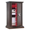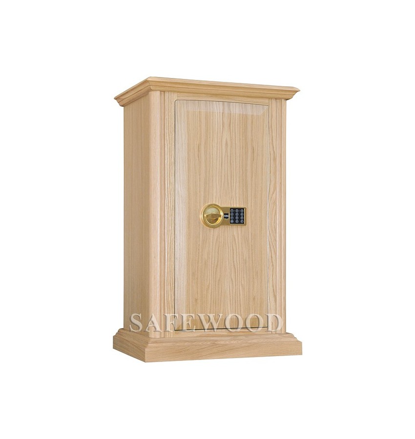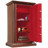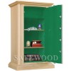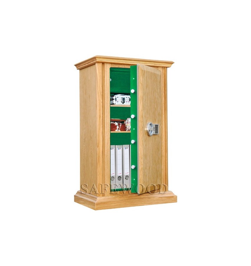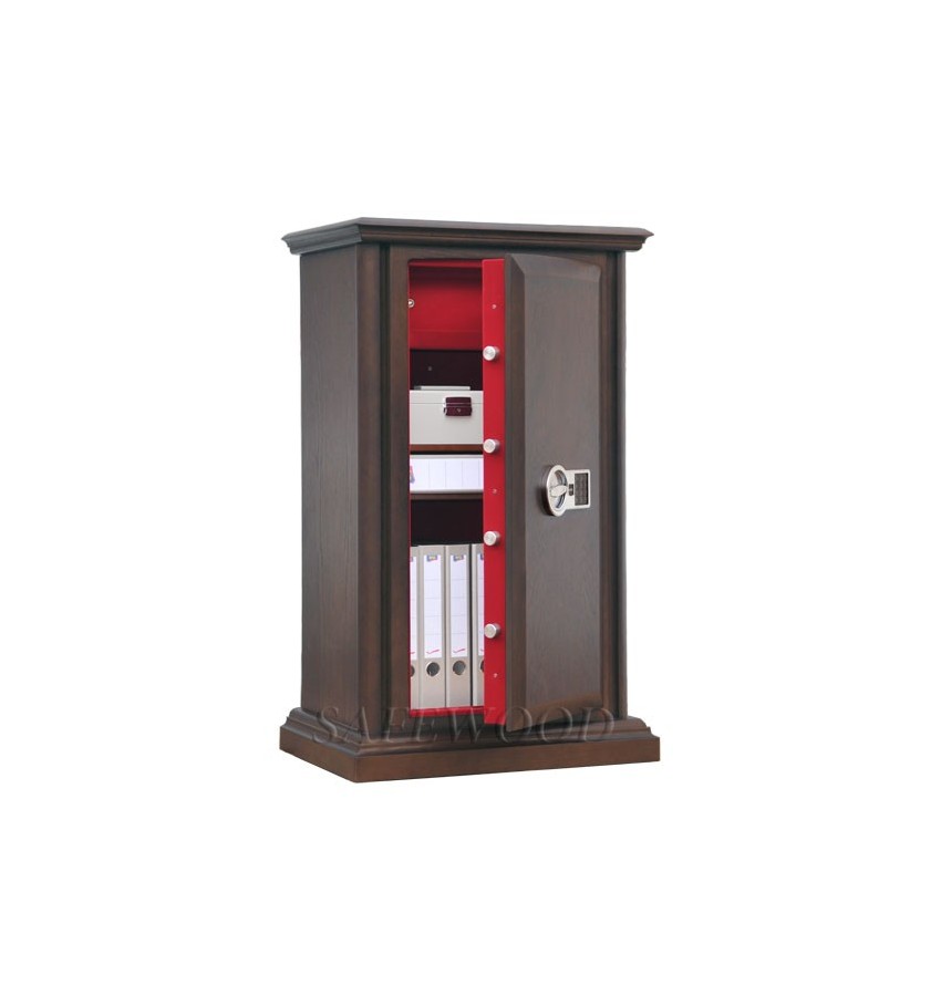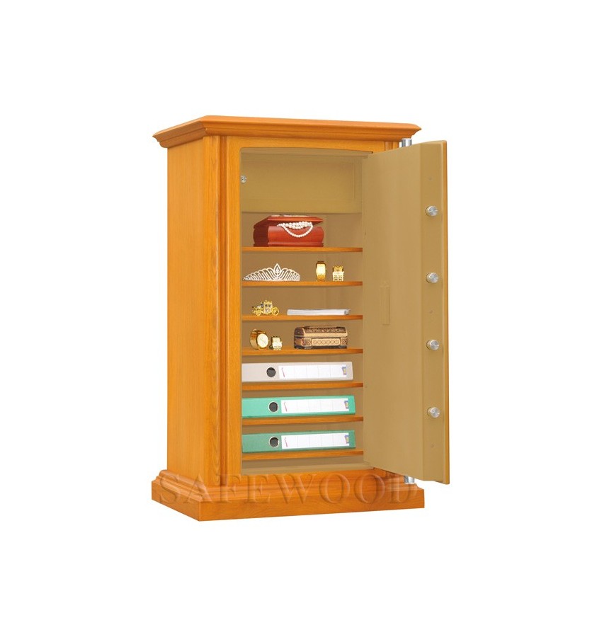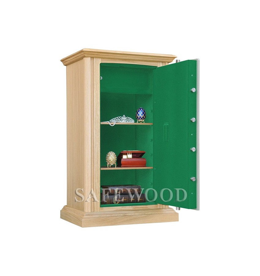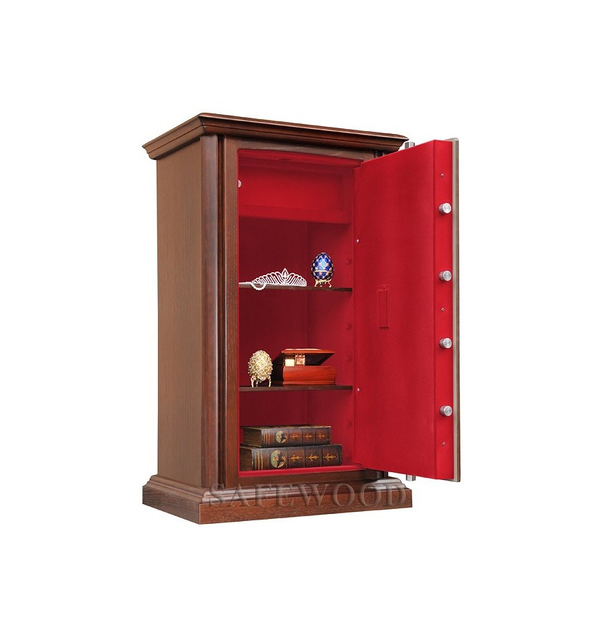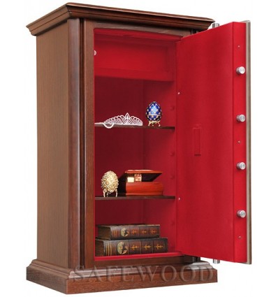 Элитный сейф с отделкой натуральным деревом. Вся внутренняя поверхность сейфа имеет престижное мягкое покрытие флокированием бархатом. Сейф сертифицирован на устойчивость к взлому – 1 класс. Умеренная огнестойкость – приблизительно 20Б. Корпус имеет двойные стальные стенки, межстеночный наполнитель – бетон. Металлические детали сейфа имеют гигиенически-безопасное, коррозионно-стойкое полимерно-порошковое покрытие на основе материалов производства ЕС. Замок Сейф оборудован электронным кодовым замком PS-300 либо высокосекретным электронным кодовым замком Mauer (Германия). Уточняйте при покупке. Такие замки Вы можете по Вашему выбору эксплуатировать в режиме одного пользовательского кода, либо в режиме двух кодов (мастер-код и рабочий код). Вы можете выбрать кодовую панель электронного замка – Хром либо Gold. Варианты кодовых панелей представлены на дополнительном фото. Стоимость сейфа и гарантия зависит от типа замка и кодовой панели. Цена приведена для случая поставки сейфа с замком PS-300 с кодовой панелью Хром. При поставке с замком PS-300 с кодовой панелью Gold доплата 16300 рублей. При поставке с замком Mauer (Германия) с кодовой панелью Хром доплата 10900 рублей. При поставке с замком Mauer (Германия) с кодовой панелью Gold доплата 22300 рублей. Кодовые панели Gold имеют покрытие золотом 24 карата. На кодовую панель Mauer Gold имеется европейский сертификат. При поставке сейфа с электронным кодовым замком замком PS-300 ( с любой кодовой панелью) - гарантия на сейф – 5 лет, гарантия на замок составляет 2 года. При поставке сейфа с электронным кодовым замком Mauer (Германия) ( с любой кодовой панелью) гарантия – 5 лет, как на замок, так и на сейф. Защита Сейф имеет усиленную коробчатую дверь, передний лист двери – сталь 10мм. Петли – внутренние. Имеется защита замка от высверливания твёрдосплавной пластиной. Мощная запирающая система с запиранием по всем сторонам. Вращающиеся ригели диаметром 25мм. Внутреннее устройство Внутри сейфа запираемое кассовое отделение и две деревянные съёмные полки с регулируемой высотой установки. Возможна комплектация дополнительными полками. Установка Предусмотрена возможность крепления сейфа к полу. Модификации Имеются различные варианты цвета деревянной отделки, а также возможность изготовления по образцу Вашей мебели. New! Для всех моделей сейфов SAFEWOOD теперь возможен новый дополнительный вариант наружной отделки: окрашенное дерево с патинированием. Возможны различные цвета окраски и патинирования. Некоторые примеры – на дополнительном фото. Возможно так же изготовление по образцу Вашей мебели. Имеются различные цвета внутренней отделки, некоторые примеры на дополнительном фото. Возможна поставка любых сейфов Safewood в исполнении NP. Такие сейфы имеют меньшие наружные габариты при сохранении тех же внутренних габаритов.