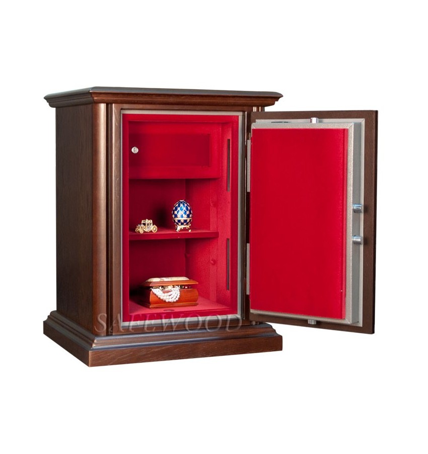 Уникальный, не имеющий мировых аналогов сейф. Элитный сейф с отделкой натуральным деревом. Сейф сертифицирован на устойчивость к взлому по I классу, а также имеет высокую огнестойкость – сертификат по классу огнестойкости 60Б. Вся внутренняя поверхность сейфа имеет престижное мягкое покрытие флокированием бархатом. Корпус и дверь сейфа имеют двойные стенки, между которыми находится специальный бетон с дополнительными огнестойкими свойствами. Металлические детали сейфа имеют гигиенически-безопасное, коррозионно-стойкое полимерно-порошковое покрытие на основе материалов производства ЕС. В отличие от других сейфов с отделкой деревом, сейфы Safewood являются Взломоогнестойкими сейфами Замок Сейф оборудован электронным кодовым замком PS-300 либо высокосекретным электронным кодовым замком Mauer (Германия). Уточняйте при покупке. Такие замки Вы можете по Вашему выбору эксплуатировать в режиме одного пользовательского кода, либо в режиме двух кодов (мастер-код и рабочий код). Вы можете выбрать кодовую панель электронного замка – Хром либо Gold. Варианты кодовых панелей представлены на дополнительном фото. Стоимость сейфа и гарантия зависит от типа замка и кодовой панели. Цена приведена для случая поставки сейфа с замком PS-300 с кодовой панелью Хром. При поставке с замком PS-300 с кодовой панелью Gold доплата 16300 рублей. При поставке с замком Mauer (Германия) с кодовой панелью Хром доплата 10900 рублей. При поставке с замком Mauer (Германия) с кодовой панелью Gold доплата 22300 рублей. Кодовые панели Gold имеют покрытие золотом 24 карата. На кодовую панель Mauer Gold имеется европейский сертификат. При поставке сейфа с электронным кодовым замком замком PS-300 ( с любой кодовой панелью) - гарантия на сейф – 5 лет, гарантия на замок составляет 2 года. При поставке сейфа с электронным кодовым замком Mauer (Германия) ( с любой кодовой панелью) гарантия – 5 лет, как на замок, так и на сейф. Защита Сейф имеет усиленную коробчатую дверь. Сейфы имеют защиту для препятствия выбиванию ригелей. Защита замка для препятствия высверливанию. Мощная запирающая система с запиранием по всем сторонам. Вращающиеся ригели. Имеется система блокировки ригельного запирающего механизма при механическом воздействии. Внутреннее устройство Внутри сейфа запираемое отделение и съёмная полка с регулируемой высотой установки. Установка Предусмотрена возможность крепления сейфа к полу. Модификации Имеются различные варианты цвета деревянной отделки, а также возможность изготовления по образцу Вашей мебели. New! Для всех моделей сейфов SAFEWOOD теперь возможен новый дополнительный вариант наружной отделки: окрашенное дерево с патинированием. Возможны различные цвета окраски и патинирования. Некоторые примеры – на дополнительном фото. Возможно так же изготовление по образцу Вашей мебели. Имеются различные цвета внутренней отделки. Возможна поставка любых сейфов Safewood в исполнении NP. Такие сейфы имеют меньшие наружные габариты при сохранении тех же внутренних габаритов. Имеются и другие типоразмеры.