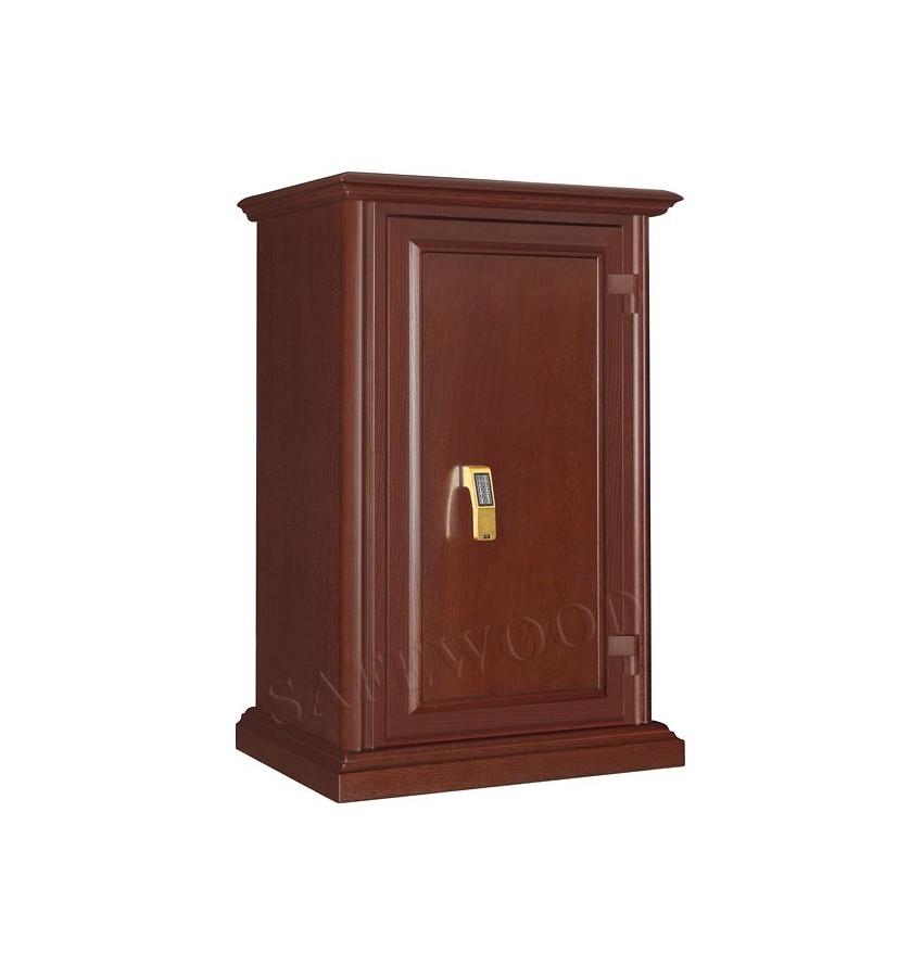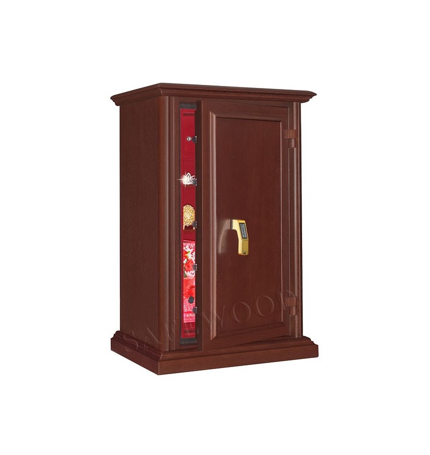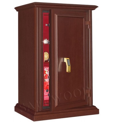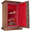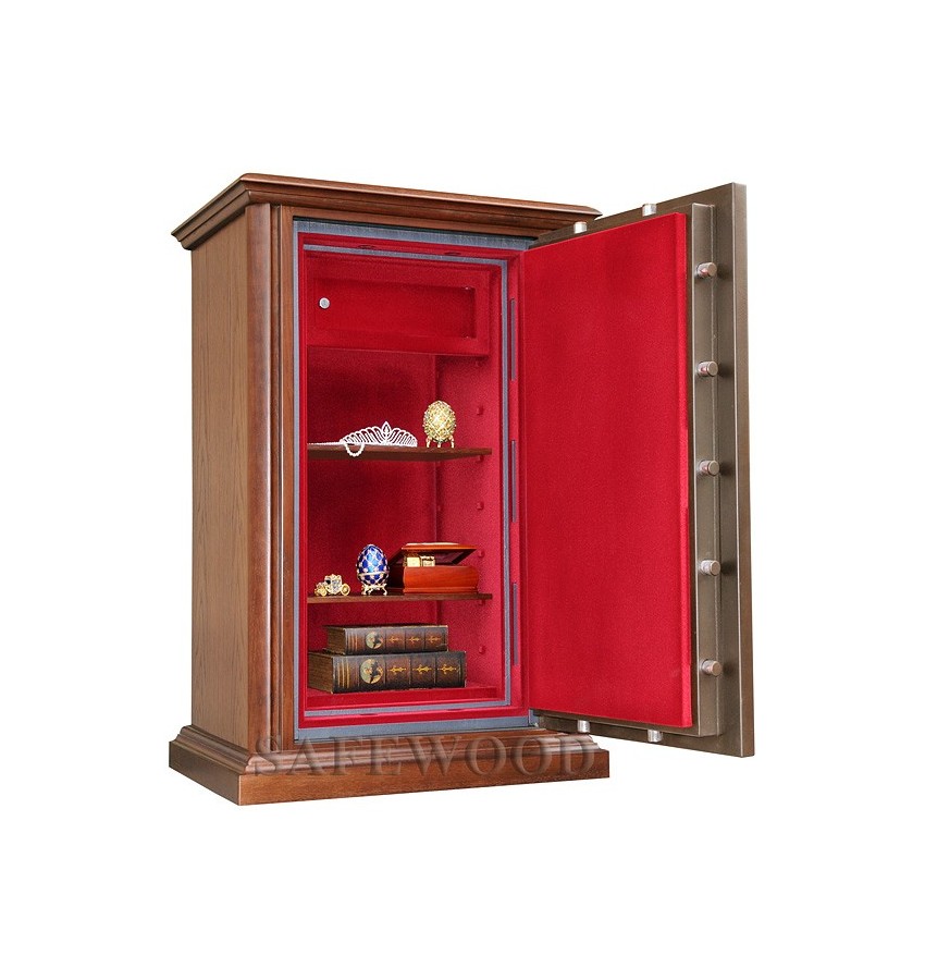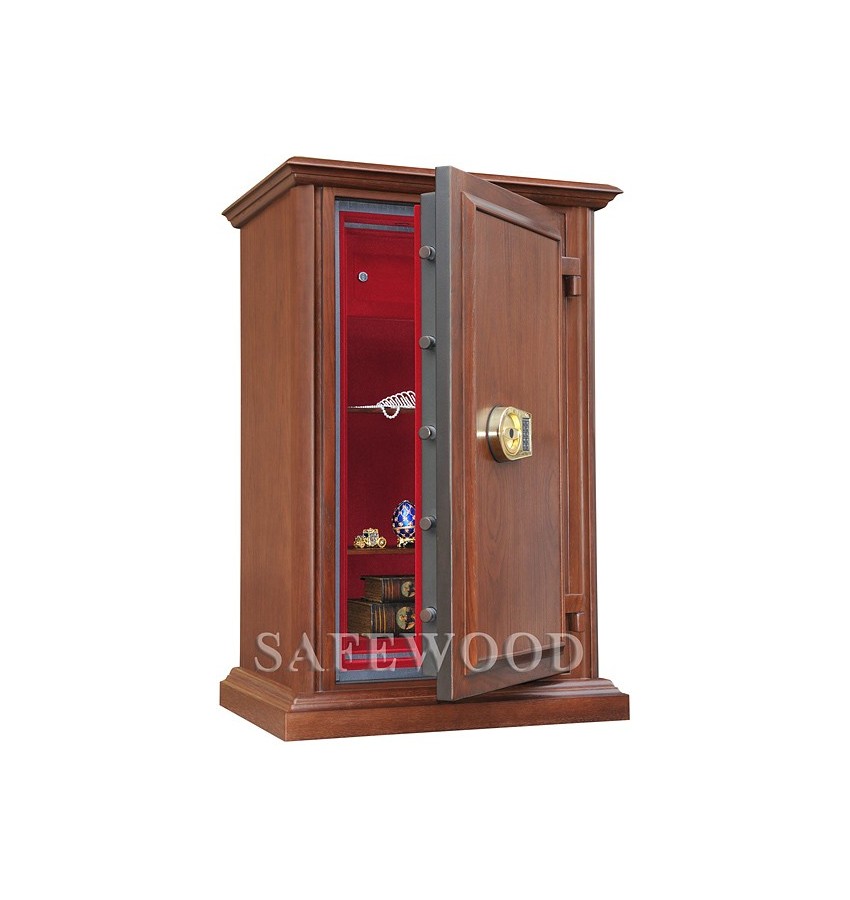 Уникальный, не имеющий мировых аналогов элитный сейф с отделкой натуральным деревом. Сейф сертифицирован на устойчивость к взлому по II классу, а также имеет высокую огнестойкость – сертификат по классу огнестойкости 90Б. Вся внутренняя поверхность сейфа имеет престижное мягкое покрытие флокированием бархатом. В отличие от других сейфов с отделкой деревом, сейфы Safewood являются Взломоогнестойкими элитными сейфами. Одобрено в Евросоюзе, сертификат ESSA(Германия). Замок Сейф оборудован высокосекретным электронным кодовым замком La Gard (США). Этот замок Вы можете по Вашему выбору эксплуатировать в режиме одного пользовательского кода, либо в режиме двух кодов (мастер-код и рабочий код). Защита Корпус и дверь сейфа имеют двойные стальные стенки, между которыми находится специальный армированный бетон с дополнительными огнестойкими свойствами. Сейф имеет усиленную дверь. Толщина защитного слоя двери более 30-и мм.. Дополнительная защита зоны замка от высверливания специальной твёрдосплавной пластиной. Мощная вертикальная и горизонтальная запирающая ригельная система с запиранием по всем сторонам. Всего 12 ригелей, из них девять активных. Активные ригели – вращающиеся, хромированные, диаметром 25мм. Сейфы имеют защиту для препятствия высверливанию и выбиванию ригелей и замка. Имеется система блокировки ригельного запирающего механизма при механическом воздействии на дверь или замок. Для дополнительной защиты от проникновения при пожаре раскалённых газов внутрь сейфа – предусмотрены два уплотнительных контура между дверью и корпусом сейфа. Эти уплотнительные прокладки выполнены из специального термостойкого материала. Внутреннее устройство Внутри сейфа запираемое кассовое отделение и две съёмные деревянные полки с регулируемой высотой установки. Возможна комплектация дополнительными полками. Установка Предусмотрена возможность крепления сейфа к полу. Модификации Сейфы Safewood любой модификации - изготавливаются c различными вариантами цвета деревянной отделки, под различную мебель. Кроме того, Вы можете заказать сейф Safewood по образцу Вашей мебели, либо по нашему каталогу образцов дерева – более 15 вариантов!!! New! Для всех моделей сейфов SAFEWOOD теперь возможен новый дополнительный вариант наружной отделки: окрашенное дерево с патинированием. Возможны различные цвета окраски и патинирования. Некоторые примеры – на дополнительном фото. Возможно так же изготовление по образцу Вашей мебели. По желанию заказчика возможна поставка сейфа с изменёнными наружными габаритами. Сейф Safewood 29112T EL Flock в базовом варианте поставляется с кодовой панелью Gold-design (как на фото). По желанию заказчика возможна так же поставка с кодовой панелью Chrom. Имеются различные цвета внутренней мягкой отделки. Возможна поставка любых сейфов Safewood в исполнении NP. Такие сейфы имеют меньшие наружные габариты при сохранении тех же внутренних габаритов. Дополнительная информация Полная внутренняя мягкая отделка защищает хранимые в сейфе ценные предметы от контакта с металлом, царапин, повреждений и т.п. Металлические детали сейфа имеют гигиенически-безопасное, коррозионно-стойкое полимерно-порошковое покрытие на основе материалов производства ЕС.