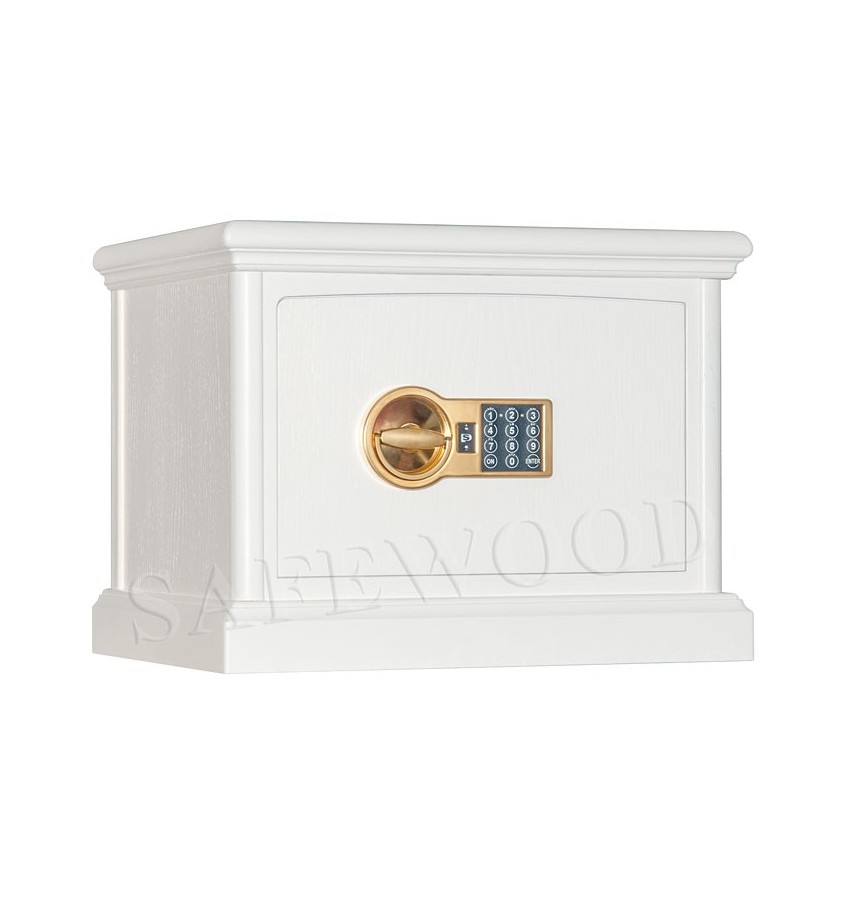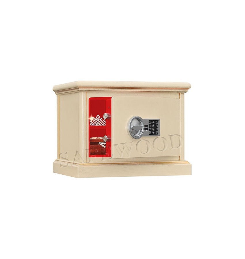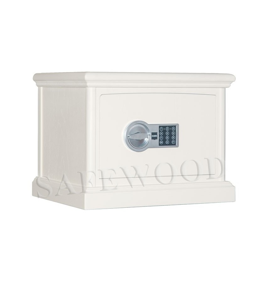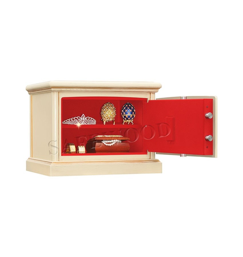 Элитный сейф с отделкой натуральным деревом. Окрашенное дерево (по каталогу RAL) с патинированием. Вся внутренняя поверхность сейфа имеет престижное мягкое покрытие флокированием бархатом. Сейф сертифицирован на устойчивость к взлому – 1 класс. Корпус имеет двойные стальные стенки, межстеночный наполнитель – бетон. Металлические детали сейфа имеют гигиенически-безопасное, коррозионно-стойкое полимерно-порошковое покрытие на основе материалов производства ЕС. Замок Сейф оборудован электронным кодовым замком PS-300 либо высокосекретным электронным кодовым замком Mauer (Германия). Уточняйте при покупке. Такие замки Вы можете по Вашему выбору эксплуатировать в режиме одного пользовательского кода, либо в режиме двух кодов (мастер-код и рабочий код). Вы можете выбрать кодовую панель электронного замка – Хром либо Gold. Стоимость сейфа и гарантия зависит от типа замка и кодовой панели. Цена приведена для случая поставки сейфа с замком PS-300 с кодовой панелью Хром. При поставке с замком PS-300 с кодовой панелью Gold стоимость сейфа увеличивается на 16300 рублей. При поставке с замком Mauer (Германия) с кодовой панелью Хром стоимость сейфа увеличивается на 10900 рублей. При поставке с замком Mauer (Германия) с кодовой панелью Gold стоимость сейфа увеличивается на 22300 рублей. Кодовые панели Gold имеют покрытие золотом 24 карата. На кодовую панель Mauer Gold имеется европейский сертификат. При поставке сейфа с электронным кодовым замком замком PS-300 ( с любой кодовой панелью) - гарантия на сейф – 5 лет, гарантия на замок составляет 2 года. При поставке сейфа с электронным кодовым замком Mauer (Германия) ( с любой кодовой панелью) гарантия – 5 лет, как на замок, так и на сейф. Защита Сейф имеет усиленную коробчатую дверь, передний лист двери – сталь 10мм. Петли – внутренние. Имеется защита замка от высверливания твёрдосплавной пластиной. Мощная запирающая система с запиранием по всем сторонам. Вращающиеся ригели диаметром 25мм. Внутреннее устройство Внутри сейфа съёмная полка. Установка Предусмотрена возможность крепления сейфа к полу. Модификации Имеются различные варианты цвета деревянной отделки, а также возможность изготовления по образцу Вашей мебели. Имеются различные цвета внутренней отделки ( например на фото – флок красный). Возможна поставка любых сейфов Safewood в исполнении NP. Такие сейфы имеют меньшие наружные габариты при сохранении тех же внутренних габаритов. Любые сейфы Safewood могут поставляться как с традиционной деревянной отделкой, так и в исполнении окрашенное дерево с патинированием либо окрашенное дерево без патинирования.