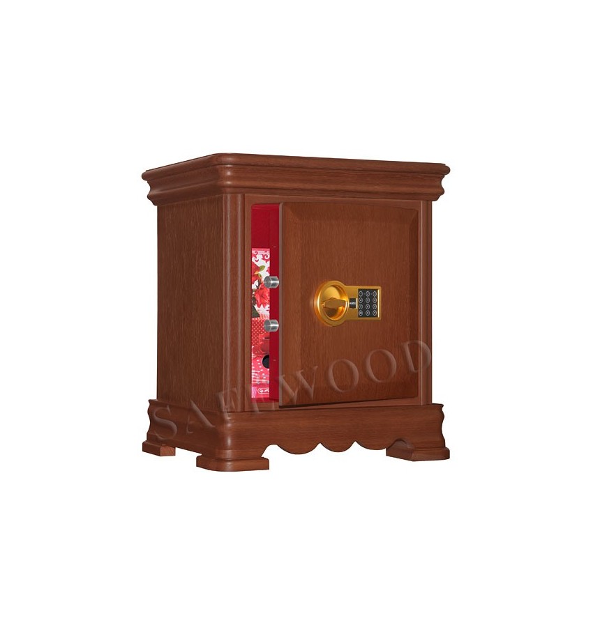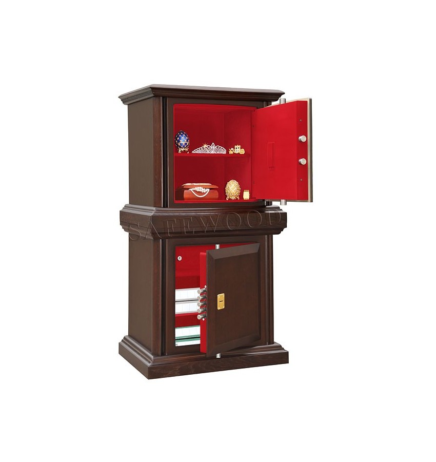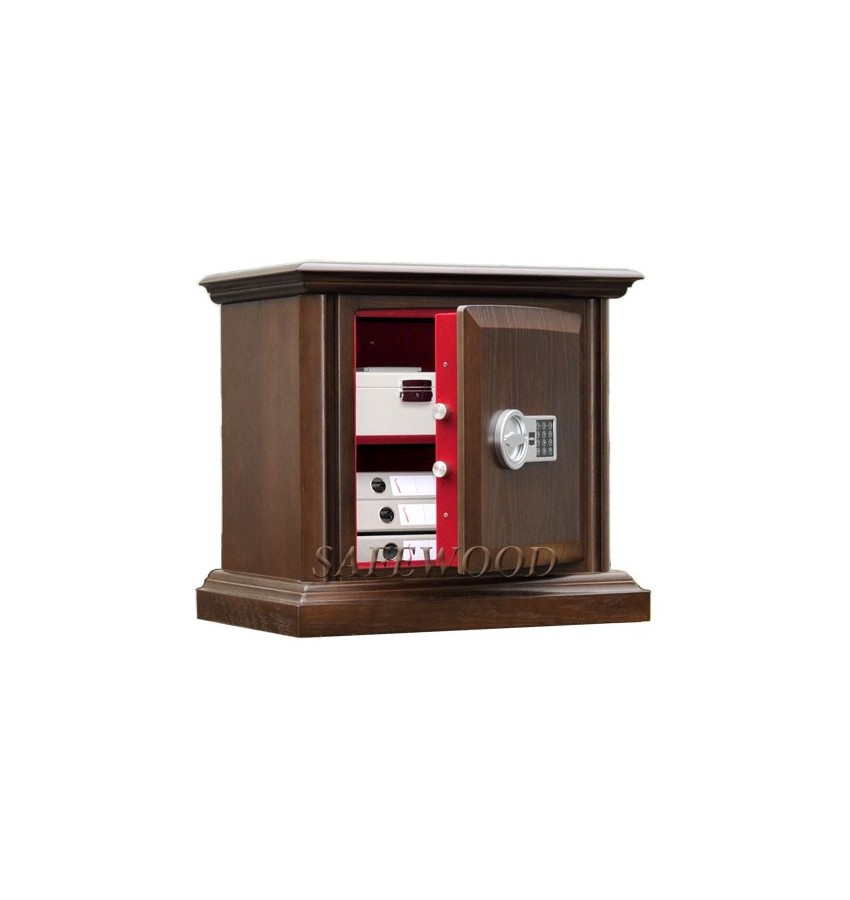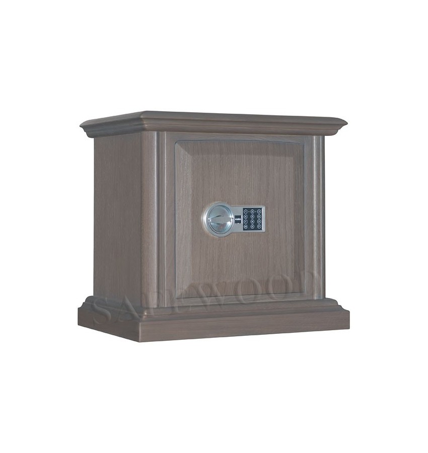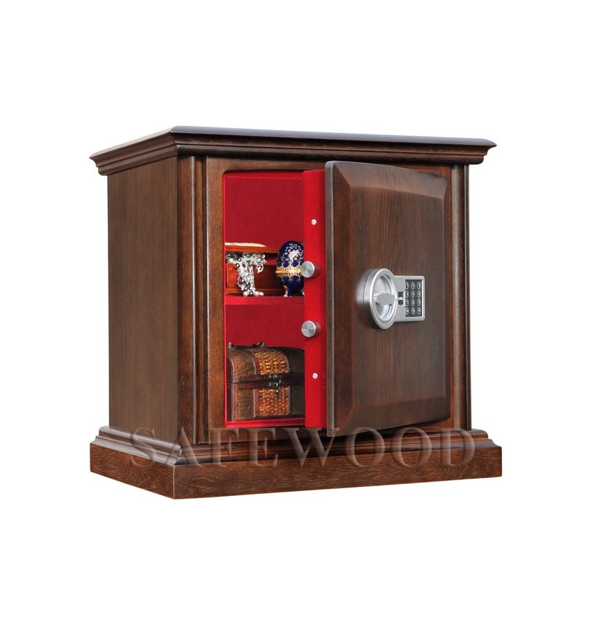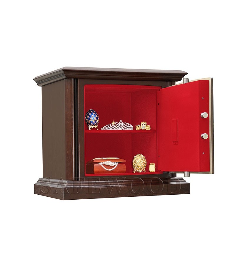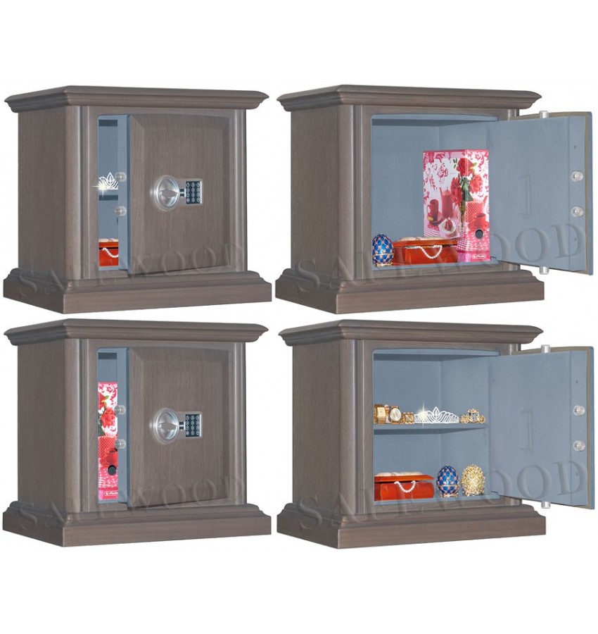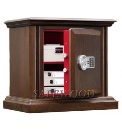 Элитный сейф с отделкой натуральным деревом. Вся внутренняя поверхность сейфа имеет престижное мягкое покрытие флокированием бархатом. Сейф сертифицирован на устойчивость к взлому – 1 класс. Корпус имеет двойные стальные стенки, межстеночный наполнитель – бетон. Металлические детали сейфа имеют гигиенически-безопасное, коррозионно-стойкое полимерно-порошковое покрытие на основе материалов производства ЕС. Замок Сейф оборудован электронным кодовым замком PS-300 либо высокосекретным электронным кодовым замком Mauer (Германия). Уточняйте при покупке. Такие замки Вы можете по Вашему выбору эксплуатировать в режиме одного пользовательского кода, либо в режиме двух кодов (мастер-код и рабочий код). Вы можете выбрать кодовую панель электронного замка – Хром либо Gold. Стоимость сейфа и гарантия зависит от типа замка и кодовой панели. Цена приведена для случая поставки сейфа с замком PS-300 с кодовой панелью Хром. При поставке с замком PS-300 с кодовой панелью Gold стоимость сейфа увеличивается на 16300 рублей. При поставке с замком Mauer (Германия) с кодовой панелью Хром стоимость сейфа увеличивается на 10900 рублей. При поставке с замком Mauer (Германия) с кодовой панелью Gold стоимость сейфа увеличивается на 22300 рублей. Кодовые панели Gold имеют покрытие золотом 24 карата. На кодовую панель Mauer Gold имеется европейский сертификат. При поставке сейфа с электронным кодовым замком замком PS-300 ( с любой кодовой панелью) - гарантия на сейф – 5 лет, гарантия на замок составляет 2 года. При поставке сейфа с электронным кодовым замком Mauer (Германия) ( с любой кодовой панелью) гарантия – 5 лет, как на замок, так и на сейф. Защита Сейф имеет усиленную коробчатую дверь, передний лист двери – сталь 10мм. Петли – внутренние. Имеется защита замка от высверливания твёрдосплавной пластиной. Мощная запирающая система с запиранием по всем сторонам. Вращающиеся ригели диаметром 25мм. Внутреннее устройство Внутри сейфа съёмная полка с регулируемой высотой установки. Возможна комплектация дополнительными полками. Установка Предусмотрена возможность крепления сейфа к полу. Модификации Имеются различные варианты цвета деревянной отделки, а также возможность изготовления по образцу Вашей мебели. Имеются различные цвета внутренней отделки ( например на фото – флок красный). New! Для всех моделей сейфов SAFEWOOD теперь возможен новый дополнительный вариант наружной отделки: окрашенное дерево с патинированием. Возможны различные цвета окраски и патинирования. Некоторые примеры – на дополнительном фото. Возможно так же изготовление по образцу Вашей мебели. Возможна поставка любых сейфов Safewood в исполнении NP. Такие сейфы имеют меньшие наружные габариты при сохранении тех же внутренних габаритов.