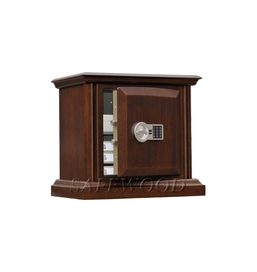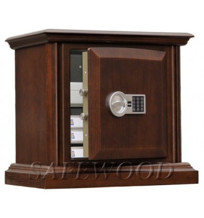 Элитный сейф с отделкой натуральным деревом. Сейф сертифицирован на устойчивость к взлому – 1 класс. Корпус имеет двойные стальные стенки, межстеночный наполнитель – бетон. Металлические детали сейфа имеют гигиенически-безопасное, коррозионно-стойкое полимерно-порошковое покрытие на основе материалов производства ЕС. Замок Сейф оборудован электронным кодовым замком PS-300 либо высокосекретным электронным кодовым замком Mauer (Германия). Уточняйте при покупке. Такие замки Вы можете по Вашему выбору эксплуатировать в режиме одного пользовательского кода, либо в режиме двух кодов (мастер-код и рабочий код). Вы можете выбрать кодовую панель электронного замка – Хром либо Gold. Стоимость сейфа и гарантия зависит от типа замка и кодовой панели. Цена приведена для случая поставки сейфа с замком PS-300 с кодовой панелью Хром. При поставке с замком PS-300 с кодовой панелью Gold стоимость сейфа увеличивается на 16300 рублей. При поставке с замком Mauer (Германия) с кодовой панелью Хром стоимость сейфа увеличивается на 10900 рублей. При поставке с замком Mauer (Германия) с кодовой панелью Gold стоимость сейфа увеличивается на 22300 рублей. Кодовые панели Gold имеют покрытие золотом 24 карата. На кодовую панель Mauer Gold имеется европейский сертификат. При поставке сейфа с электронным кодовым замком замком PS-300 ( с любой кодовой панелью) - гарантия на сейф – 5 лет, гарантия на замок составляет 2 года,. При поставке сейфа с электронным кодовым замком Mauer (Германия) ( с любой кодовой панелью) гарантия – 5 лет, как на замок, так и на сейф. Защита Сейф имеет усиленную коробчатую дверь, передний лист двери – сталь 10мм. Петли – внутренние. Имеется защита замка от высверливания твёрдосплавной пластиной. Мощная запирающая система с запиранием по всем сторонам. Вращающиеся ригели диаметром 25мм. Внутреннее устройство Внутри сейфа съёмная полка с регулируемой высотой установки. Установка Предусмотрена возможность крепления сейфа к полу. Модификации Имеются различные варианты цвета деревянной отделки, а также возможность изготовления по образцу Вашей мебели. New! Для всех моделей сейфов SAFEWOOD теперь возможен новый дополнительный вариант наружной отделки: окрашенное дерево с патинированием. Возможны различные цвета окраски и патинирования. Некоторые примеры – на дополнительном фото. Возможно так же изготовление по образцу Вашей мебели. Возможна поставка любых сейфов Safewood в исполнении NP. Такие сейфы имеют меньшие наружные габариты при сохранении тех же внутренних габаритов.