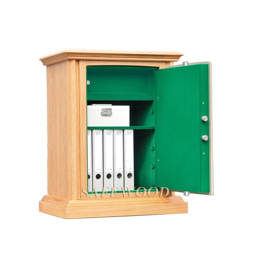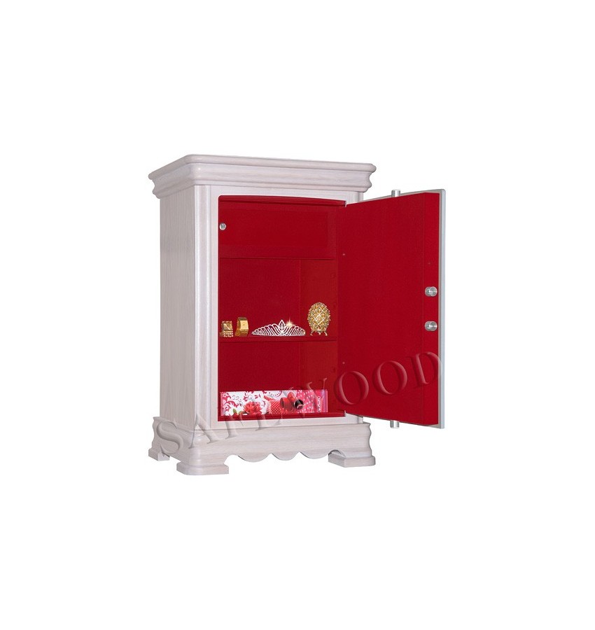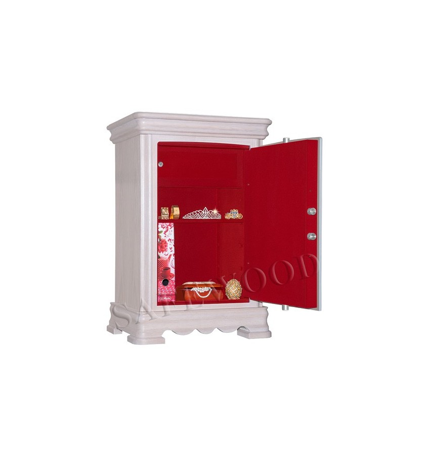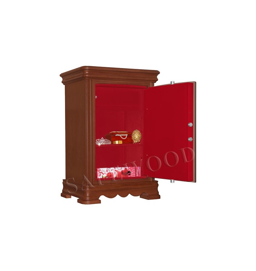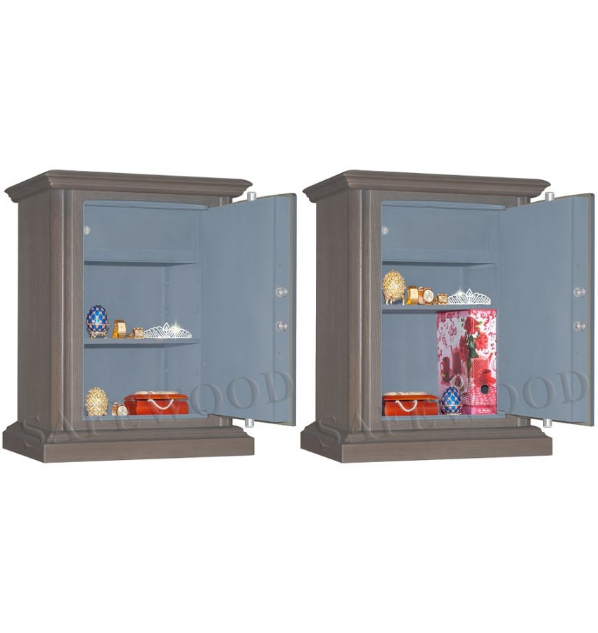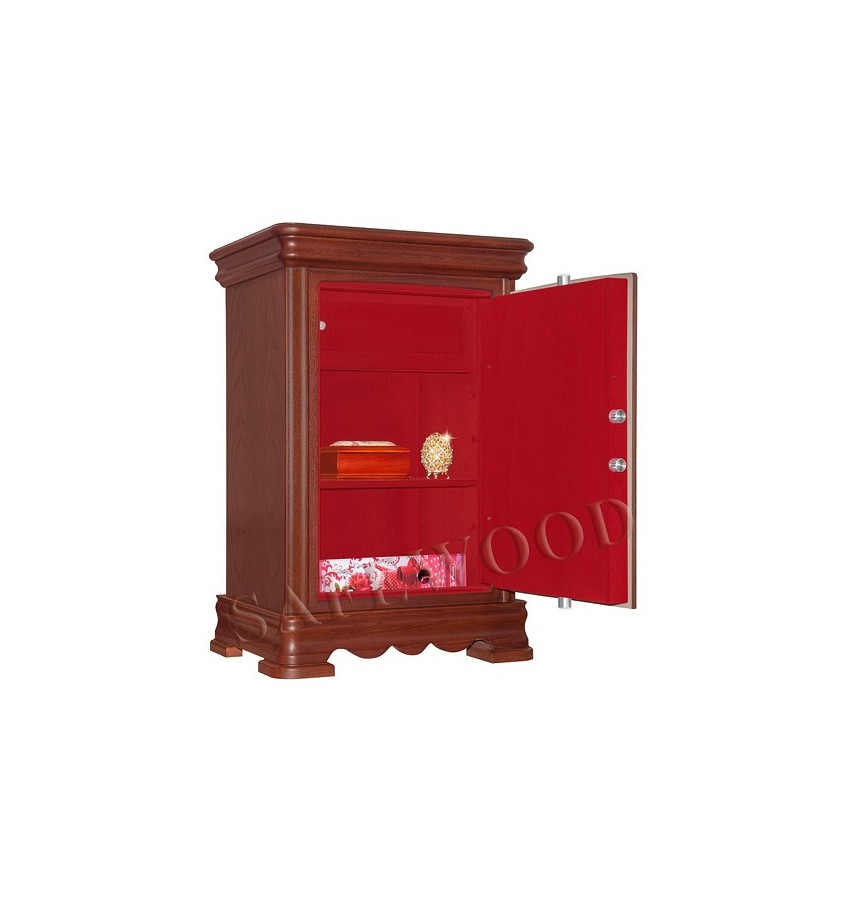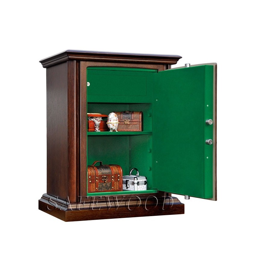 Элитный сейф с отделкой натуральным деревом. Вся внутренняя поверхность сейфа имеет престижное мягкое покрытие флокированием бархатом. Сейф сертифицирован на устойчивость к взлому – 1 класс. Корпус имеет двойные стальные стенки, межстеночный наполнитель – бетон. Металлические детали сейфа имеют гигиенически-безопасное, коррозионно-стойкое полимерно-порошковое покрытие на основе материалов производства ЕС. Замок Сейф оборудован высокосекретным ключевым замком Mauer (Германия). Защита замка от высверливания твёрдосплавной пластиной. Мощная запирающая система с запиранием по всем сторонам. Вращающиеся ригели диаметром 25мм. Защита Сейф имеет усиленную коробчатую дверь, передний лист двери – сталь 10мм. Петли – внутренние. Внутреннее устройство Внутри сейфа запираемое кассовое отделение и съёмная полка с регулируемой высотой установки. Возможна комплектация дополнительными полками. Установка Предусмотрена возможность крепления сейфа к полу. Модификации Имеются различные варианты цвета деревянной отделки, а также возможность изготовления по образцу Вашей мебели. New! Для всех моделей сейфов SAFEWOOD теперь возможен новый дополнительный вариант наружной отделки: окрашенное дерево с патинированием. Возможны различные цвета окраски и патинирования. Некоторые примеры – на дополнительном фото. Возможно так же изготовление по образцу Вашей мебели. Имеются различные цвета внутренней отделки ( например на основном фото – флок бордо). Возможна поставка любых сейфов Safewood в исполнении NP. Такие сейфы имеют меньшие наружные габариты при сохранении тех же внутренних габаритов.