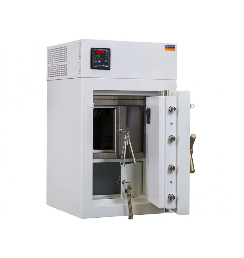 Сейф-термостат TS-4/12 предназначен для хранения наркотических средств, психотропных веществ и их прекурсоров, зарегистрированных в установленном порядке в РФ в качестве лекарственных средств медицинского применения. Медицинское изделие TS-4/12 обеспечивает порядок хранения лекарственных средств, определенный Правилами, утвержденными постановлением Правительства РФ от 31.12.2009 года № 1148. Сейф-термостат медицинский TS-4/12 имеет следующие потребительские свойства: • Выполняет условия хранения лекарственных средств, определенные Фармакопеей РФ: - или как в холодильнике и при температуре воздуха окружающей среды; - или как в прохладном месте и при температуре воздуха окружающей среды; - или при температуре воздуха окружающей среды. • Имеет возможность одновременного и раздельного хранения термолабильных и иных лекарственных средств - для инъекций, внутреннего или наружного медицинского применения. • Обеспечивает устойчивость к взлому при помощи: - многослойной защиты стенок и двери сейфа; - усиленной ригельной системы запирания; - защиты от высверливания и выбивания замков KABA MAUER и ригелей и т.д. • Реализует утвержденные Правила хранения лекарственных средств: - в изолированных помещениях первой или второй категории с климатическими условиями УХЛ 4.1; - при прикреплении TS-4/12 к полу и т.д. • Обладает: 1. Рабочей камерой, выполненной из нержавеющей стали и оснащенной: - светодиодным освещением; - звуковой сигнализацией открывания двери; 2. Дополнительным отсеком без обеспечения тепловых режимов хранения емкостью 23 литра и оснащенным: - дверью с замком. • Оборудуется измерителем-регулятором, осуществляющим: - регулирование установленного значения температуры хранения; - одновременную индикацию текущего значения регулируемой и заданной температуры хранения; - выход в информационную сеть стандарта RS-485; - корректировку значения температуры хранения в процессе работы изделия; - защиту настроек прибора; - конфигурирование с лицевой панели прибора. • Оснащается полупроводниковыми термоэлектрическими модулями, которые обеспечивают: - заданные тепловые условия хранения; - низкий уровень шумов и энергопотребления; - минимизацию габаритов и веса изделия; - повышение экологической безопасности. • Комплектуется электронным счетчиком открывания двери сейфа, а также выходным разъемом RJ-45 категории 5е, который позволяет: 1. Организовывать аварийную сигнализацию: - открывания двери рабочей камеры; - отключения напряжения сети электропитания; - отключения кабеля связи. 2. Применять в информационной сети RS-485: - приборы учета значений температуры хранения; - конфигурирование изделия с ПК; - архивирование измеряемых значений температуры хранения; - интегрирование изделия в АСУ и т.д. • Медицинское изделие TS-4/12 оснащается дополнительными узлами в любом варианте комплектации под заказ: - преобразователем сигналов интерфейса USB - RS-485; - преобразователем сигналов интерфейса Ethernet - RS-485; - Wi-Fi модулем; - EL-кодовым электронным замком LA GARD (class B, ECB-S) или PS 600 (ПРОМЕТ, класс В, ГОСТ, ECB-S). • Сейфы-термостаты медицинскиеTS-4/12 имеются в наличии на складе или изготавливаются под заказ. • Сейф-термостат медицинский TS-4/12 cоответсвует ТУ 9452-004-72063897-2013