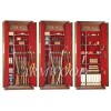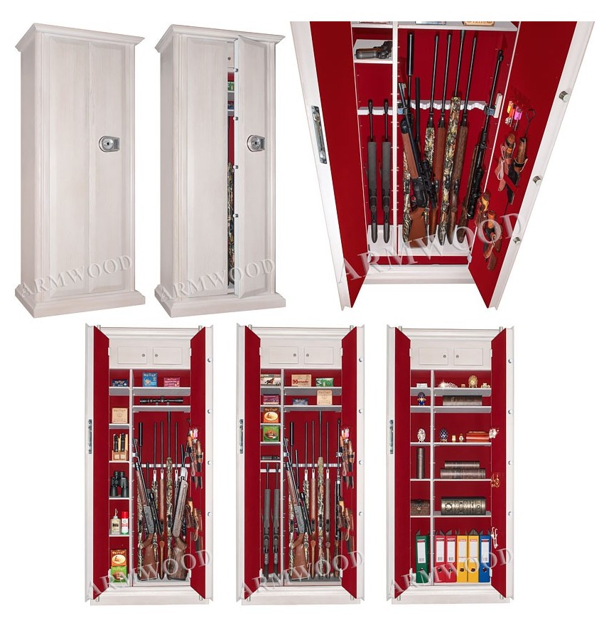 Элитный оружейный сейф с отделкой натуральным деревом. Сейфы полностью удовлетворяют требованиям МВД к хранению оружия. Универсальный сейф, может использоваться как оружейный сейф либо как личный (офисный) сейф. Замок Сейф оборудован высокосекретным сертифицированным электронным кодовым замком La Gard (США). Этот замок Вы можете использовать с одним пользовательским кодом либо с двумя кодами: код руководителя (мастер-код) и рабочий код. Подробная и понятная инструкция на русском языке прилагается. Питание электронного замка от стандартной батарейки. Долгий срок службы батарейки. Простая смена разряженной батарейки. Сейф имеет мощные ригельные системы (две вертикальные и горизонтальную) с запиранием по всем сторонам. Защита Двери сейфа имеют коробчатую конструкцию для дополнительного усиления. Петли внутренние из стали 6мм. Усиленный корпус. Внутреннее устройство Внутри сейфа два запираемых (патронных) отделения и вертикальная перегородка которая делит внутреннее пространство сейфа на две области. Внутри «широкой» области 5 съёмных полок и деревянные ложементы на семь стволов. Также в «широкой» области имеются два боковых роликовых зажима с регулируемой высотой установки (для хранения в широкой области восьмого и девятого ствола либо для дополнительной фиксации оружия с оптикой). Внутри «узкой» области 5 съёмных полок и деревянные ложементы на два ствола. Все полки с регулируемой высотой установки. Все ложементы - съёмные. Ружья можно хранить как по одну сторону от перегородки, так и по обе стороны от перегородки. По желанию заказчика возможна поставка с дополнительными полками. На внутренней поверхности одной из дверей сейфа имеются удобные крючки и два держателя для хранения ножей и пр. Внутренняя отделка Сейфы ARMWOOD модификации FLOCK+ имеют престижную полную внутреннюю мягкую отделку флокированием бархатом (различных цветов по нашему каталогу), например на фото – флок бордо. Полная внутренняя мягкая отделка защищает Ваше оружие от контакта с металлом, царапин повреждений и т.п. Некоторые варианты флока представлены на дополнительном фото. В модификации FLOCK+ фасады внутренних запираемых отделений имеют отделку деревом. Внутренняя перегородка и полки также выполнены из дерева. Установка Предусмотрена возможность крепления сейфа к стене. По желанию заказчика возможна поставка в исполнении, предусматривающем также крепление к полу. Модификации В зависимости от типа внутренней отделки имеются пять модификаций этих оружейных сейфов. Модификация Primary (базовая) имеет деревянные ложементы, отделанные бархатом либо винилискожей либо ложементы «премиум». Модификации Lux и Lux+ имеют дополнительно к базовой - мягкую полную внутреннюю отделку винилискожей или бархатом. Различные варианты цвета бархата и винилискожи по нашему каталогу. Модификация Lux+ отличается от модификации Lux следующим: дополнительная отделка фасадов внутренних запираемых отделений деревом. Модификации Flock и Flock+ - имеют полную внутреннюю мягкую отделку флокированием бархатом (различных цветов по нашему каталогу) и ложементы «премиум». Модификация Flock+ отличается от модификации Flock следующим: 1) дополнительная отделка фасадов внутренних запираемых отделений деревом, 2) перегородка и полки – деревянные (в модификации Flock – они металлические флокирован