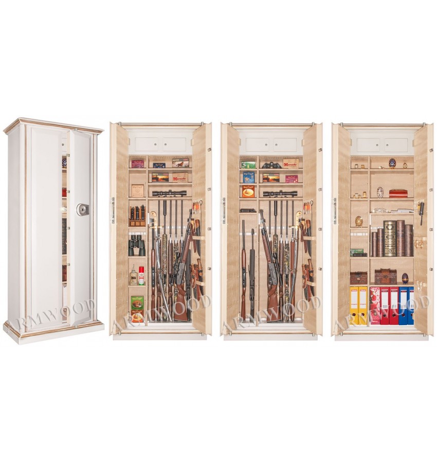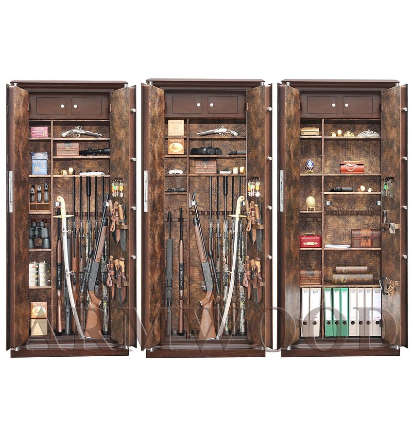 Элитный оружейный сейф с отделкой натуральным деревом. Сейфы полностью удовлетворяют требованиям МВД к хранению оружия. Универсальный сейф, может использоваться как оружейный сейф либо как личный (офисный) сейф. Замок Сейф оборудован высокосекретным сертифицированным электронным кодовым замком La Gard (США). Этот замок Вы можете использовать с одним пользовательским кодом либо с двумя кодами: код руководителя (мастер-код) и рабочий код. Подробная и понятная инструкция на русском языке прилагается. Питание электронного замка от стандартной батарейки. Долгий срок службы батарейки. Простая смена разряженной батарейки. Сейф имеет мощные ригельные системы (две вертикальные и горизонтальную) с запиранием по всем сторонам. Защита Двери сейфа имеют коробчатую конструкцию для дополнительного усиления. Петли внутренние из стали 6мм. Усиленный корпус. Внутреннее устройство Внутри сейфа два запираемых (патронных) отделения и вертикальная перегородка которая делит внутреннее пространство сейфа на две области. Внутри «широкой» области 5 съёмных полок и деревянные ложементы на семь стволов. Также в «широкой» области имеются два боковых роликовых зажима с регулируемой высотой установки (для хранения в широкой области восьмого и девятого ствола либо для дополнительной фиксации оружия с оптикой). Внутри «узкой» области 5 съёмных полок и деревянные ложементы на два ствола. Все полки с регулируемой высотой установки. Все ложементы - съёмные. Ружья можно хранить как по одну сторону от перегородки, так и по обе стороны от перегородки. По желанию заказчика возможна поставка с дополнительными полками. На внутренней поверхности одной из дверей сейфа имеются три держателя для хранения ножей и пр. Внутренняя отделка Сейфы ARMWOOD модификации Lux Plus имеют полную внутреннюю мягкую отделку искусственной кожей (различных цветов и рисунков по нашему каталогу). Дополнительная отделка фасадов внутренних запираемых отделений деревом. NEW! Поступила искусственная кожа, имитирующая кожу крокодилов, змей и т.п. Тоже различных цветов! На основном фото пример сейфа с внутренней отделкой «бронзовый крокодил». Полная внутренняя мягкая отделка защищает Ваше оружие от контакта с металлом, царапин повреждений и т.п. Установка Предусмотрена возможность крепления сейфа к стене. По желанию заказчика возможна поставка в исполнении, предусматривающем также крепление к полу. Модификации В зависимости от типа внутренней отделки имеются пять модификаций этих оружейных сейфов. Модификация Primary (базовая) имеет деревянные ложементы, отделанные бархатом либо винилискожей либо ложементы «премиум». Модификации Lux и Lux+ имеют дополнительно к базовой - мягкую полную внутреннюю отделку винилискожей или бархатом. Различные варианты цвета бархата и винилискожи по нашему каталогу. Модификация Lux+ отличается от модификации Lux следующим: дополнительная отделка фасадов внутренних запираемых отделений деревом. Модификации Flock и Flock+ - имеют полную внутреннюю мягкую отделку флокированием бархатом (различных цветов по нашему каталогу) и ложементы «премиум». Модификация Flock+ отличается от модификации Flock следующим: 1) дополнительная отделка фасадов внутренних запираемых отделений деревом, 2) перегородка и полки – деревянные (в модификации Flock – они металлические флокированные). Пол