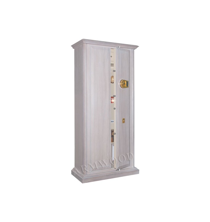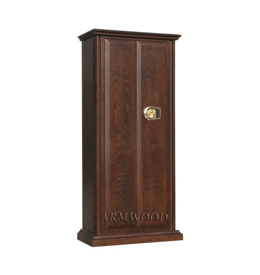 Элитный оружейный сейф с отделкой натуральным деревом. Сейфы полностью удовлетворяют требованиям МВД к хранению оружия. Универсальный сейф, может использоваться как оружейный сейф либо как личный (офисный) сейф. Замок Сейф оборудован высокосекретным сертифицированным электронным кодовым замком La Gard (США). Этот замок Вы можете использовать с одним пользовательским кодом либо с двумя кодами: код руководителя (мастер-код) и рабочий код. Подробная и понятная инструкция на русском языке прилагается. Питание электронного замка от стандартной батарейки. Долгий срок службы батарейки. Простая смена разряженной батарейки. Сейф имеет мощные ригельные системы (две вертикальные и горизонтальную) с запиранием по всем сторонам. Защита Двери сейфа имеют коробчатую конструкцию для дополнительного усиления. Петли внутренние из стали 6мм. Усиленный корпус. Внутреннее устройство Внутри сейфа два запираемых (патронных) отделения и вертикальная перегородка которая делит внутреннее пространство сейфа на две области. Внутри «широкой» области 5 съёмных полок и деревянные ложементы на семь стволов. Также в «широкой» области имеются два боковых роликовых зажима с регулируемой высотой установки (для хранения в широкой области восьмого и девятого ствола либо для дополнительной фиксации оружия с оптикой). Внутри «узкой» области 5 съёмных полок и деревянные ложементы на два ствола. Все полки с регулируемой высотой установки. Все ложементы - съёмные. Ружья можно хранить как по одну сторону от перегородки, так и по обе стороны от перегородки. По желанию заказчика возможна поставка с дополнительными полками. Внутренняя отделка Для сейфов ARMWOOD модификации PRIMARY имеется возможность выбрать различные варианты полимерно-порошковых покрытий. Имеются покрытия различных цветов и структур. Некоторые варианты полимерно-порошковых покрытий представлены на дополнительном фото. Установка Предусмотрена возможность крепления сейфа к стене. По желанию заказчика возможна поставка в исполнении, предусматривающем также крепление к полу. Модификации В зависимости от типа внутренней отделки имеются пять модификаций этих оружейных сейфов. Модификация Primary (базовая) имеет деревянные ложементы, отделанные бархатом либо винилискожей либо ложементы «премиум». Модификации Lux и Lux+ имеют дополнительно к базовой - мягкую полную внутреннюю отделку винилискожей или бархатом. Различные варианты цвета бархата и винилискожи по нашему каталогу. Модификация Lux+ отличается от модификации Lux следующим: дополнительная отделка фасадов внутренних запираемых отделений деревом. Модификации Flock и Flock+ - имеют полную внутреннюю мягкую отделку флокированием бархатом (различных цветов по нашему каталогу) и ложементы «премиум». Модификация Flock+ отличается от модификации Flock следующим: 1) дополнительная отделка фасадов внутренних запираемых отделений деревом, 2) перегородка и полки – деревянные (в модификации Flock – они металлические флокированные). Полная внутренняя мягкая отделка защищает Ваше оружие от контакта с металлом, царапин, повреждений и т.п. Металлические детали сейфа имеют гигиенически безопасное износо- и коррозионно-устойчивое полимерно-порошковое покрытие на основе материалов производства Италии или Франции. Имеются покрытия различных цветов и структур: металлик