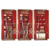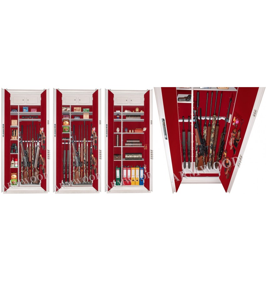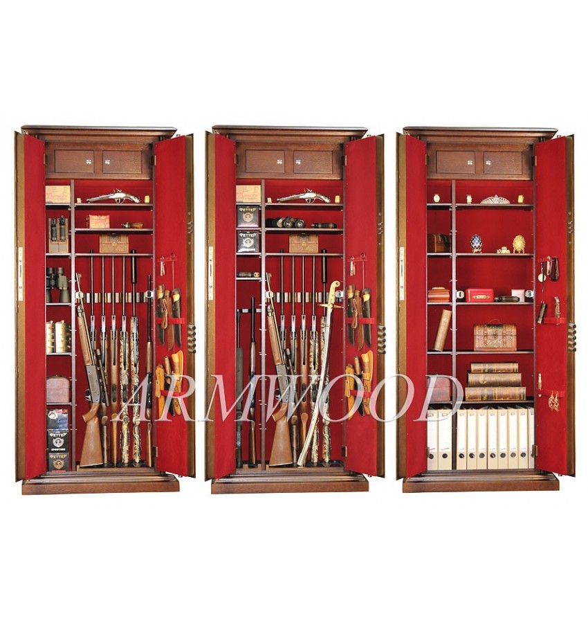 Элитный оружейный сейф с отделкой натуральным деревом. Сейфы полностью удовлетворяют требованиям МВД к хранению оружия. Универсальный сейф, может использоваться как оружейный сейф либо как личный (офисный) сейф. Замок Сейф оборудован двумя сертифицированными ключевыми замками: замок 4-го класса!!! повышенной взломостойкости и секретности (1,5 миллиона комбинаций) плюс замок 3 класса. Замки разработаны Cisa (Италия). По желанию заказчика возможна поставка сейфов с замками производства Германии: Mauer или Wittkopp. Сейф имеет мощные ригельные системы (две вертикальные и горизонтальную) с запиранием по всем сторонам. Защита Двери сейфа имеют коробчатую конструкцию для дополнительного усиления. Петли внутренние из стали 6мм. Усиленный корпус. Внутреннее устройство Внутри сейфа два запираемых (патронных) отделения и вертикальная перегородка которая делит внутреннее пространство сейфа на две области. Внутри «широкой» области 5 съёмных полок и деревянные ложементы на семь стволов. Также в «широкой» области имеются два боковых роликовых зажима с регулируемой высотой установки (для хранения в широкой области восьмого и девятого ствола либо для дополнительной фиксации оружия с оптикой). Внутри «узкой» области 5 съёмных полок и деревянные ложементы на два ствола. Все полки с регулируемой высотой установки. Все ложементы - съёмные. Ружья можно хранить как по одну сторону от перегородки, так и по обе стороны от перегородки. По желанию заказчика возможна поставка с дополнительными полками. На внутренней поверхности одной из дверей сейфа имеются удобные крючки и два держателя для хранения ножей и пр. Внутренняя отделка Сейфы ARMWOOD модификации FLOCK+ имеют престижную полную внутреннюю мягкую отделку флокированием бархатом (различных цветов по нашему каталогу), например на фото – флок бордо. Полная внутренняя мягкая отделка защищает Ваше оружие от контакта с металлом, царапин повреждений и т.п. Некоторые варианты флока представлены на дополнительном фото. В модификации FLOCK+ фасады внутренних запираемых отделений имеют отделку деревом. Внутренняя перегородка и полки также выполнены из дерева. Установка Предусмотрена возможность крепления сейфа к стене. По желанию заказчика возможна поставка в исполнении, предусматривающем также крепление к полу. Модификации В зависимости от типа внутренней отделки имеются пять модификаций этих оружейных сейфов. Модификация Primary (базовая) имеет деревянные ложементы, отделанные бархатом либо винилискожей либо ложементы «премиум». Модификации Lux и Lux+ имеют дополнительно к базовой - мягкую полную внутреннюю отделку винилискожей или бархатом. Различные варианты цвета бархата и винилискожи по нашему каталогу. Модификация Lux+ отличается от модификации Lux следующим: дополнительная отделка фасадов внутренних запираемых отделений деревом. Модификации Flock и Flock+ - имеют полную внутреннюю мягкую отделку флокированием бархатом (различных цветов по нашему каталогу) и ложементы «премиум». Модификация Flock+ отличается от модификации Flock следующим: 1) дополнительная отделка фасадов внутренних запираемых отделений деревом, 2) перегородка и полки – деревянные (в модификации Flock – они металлические флокированные). На основном фото – пример сейфа в модификации Flock+, цвет флока – бордо. Полная внутренняя мягкая отделка защища