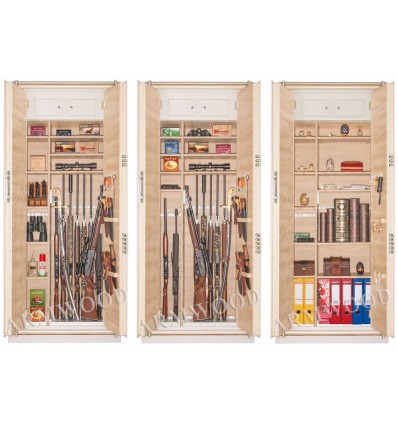 Элитный оружейный сейф с отделкой натуральным деревом. Окрашенное дерево (по каталогу RAL) с патинированием. Сейфы полностью удовлетворяют требованиям МВД к хранению оружия. Универсальный сейф, может использоваться как оружейный сейф либо как личный (офисный) сейф. Замок Сейф оборудован двумя сертифицированными ключевыми замками: замок 4-го класса!!! повышенной взломостойкости и секретности (1,5 миллиона комбинаций) плюс замок 3 класса. Замки разработаны Cisa (Италия). По желанию заказчика возможна поставка сейфов с замками производства Германии: Mauer или Wittkopp. Сейф имеет мощные ригельные системы (две вертикальные и горизонтальную) с запиранием по всем сторонам. Защита Двери сейфа имеют коробчатую конструкцию для дополнительного усиления. Петли внутренние из стали 6мм. Усиленный корпус. Внутреннее устройство Внутри сейфа два запираемых (патронных) отделения и вертикальная перегородка которая делит внутреннее пространство сейфа на две области. Внутри «широкой» области 5 съёмных полок и деревянные ложементы на семь стволов. Также в «широкой» области имеются два боковых роликовых зажима с регулируемой высотой установки (для хранения в широкой области восьмого и девятого ствола либо для дополнительной фиксации оружия с оптикой). Внутри «узкой» области 5 съёмных полок и деревянные ложементы на два ствола. Все полки с регулируемой высотой установки. Все ложементы - съёмные. Ружья можно хранить как по одну сторону от перегородки, так и по обе стороны от перегородки. По желанию заказчика возможна поставка с дополнительными полками. На внутренней поверхности одной из дверей сейфа имеются три держателя для хранения ножей и пр. Внутренняя отделка Сейфы ARMWOOD модификации Lux Plus имеют полную внутреннюю мягкую отделку искусственной кожей (различных цветов и рисунков по нашему каталогу). Дополнительная отделка фасадов внутренних запираемых отделений деревом. NEW! Поступила искусственная кожа, имитирующая кожу крокодилов, змей и т.п. Тоже различных цветов! На основном фото пример сейфа с внутренней отделкой «бежевый крокодил». Полная внутренняя мягкая отделка защищает Ваше оружие от контакта с металлом, царапин повреждений и т.п. Установка Предусмотрена возможность крепления сейфа к стене. По желанию заказчика возможна поставка в исполнении, предусматривающем также крепление к полу. Модификации В зависимости от типа внутренней отделки имеются пять модификаций этих оружейных сейфов. Модификация Primary (базовая) имеет деревянные ложементы, отделанные бархатом либо винилискожей либо ложементы «премиум». Модификации Lux и Lux+ имеют дополнительно к базовой - мягкую полную внутреннюю отделку винилискожей или бархатом. Различные варианты цвета бархата и винилискожи по нашему каталогу. Модификация Lux+ отличается от модификации Lux следующим: дополнительная отделка фасадов внутренних запираемых отделений деревом. Модификации Flock и Flock+ - имеют полную внутреннюю мягкую отделку флокированием бархатом (различных цветов по нашему каталогу) и ложементы «премиум». Модификация Flock+ отличается от модификации Flock следующим: 1) дополнительная отделка фасадов внутренних запираемых отделений деревом, 2) перегородка и полки – деревянные (в модификации Flock – они металлические флокированные). Полная внутренняя мягкая отделка защищает Ваше оружие от контакта с 