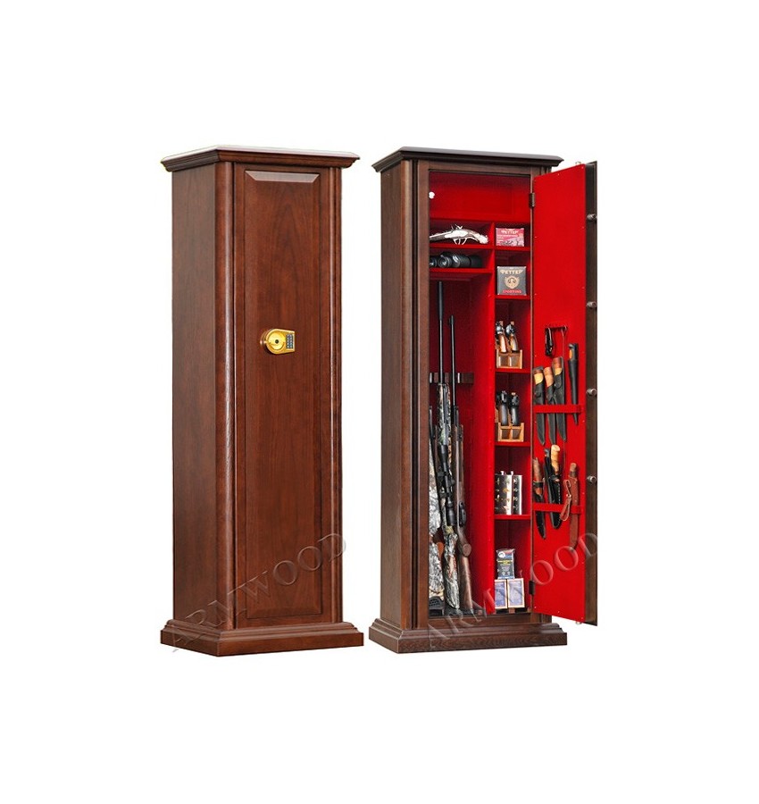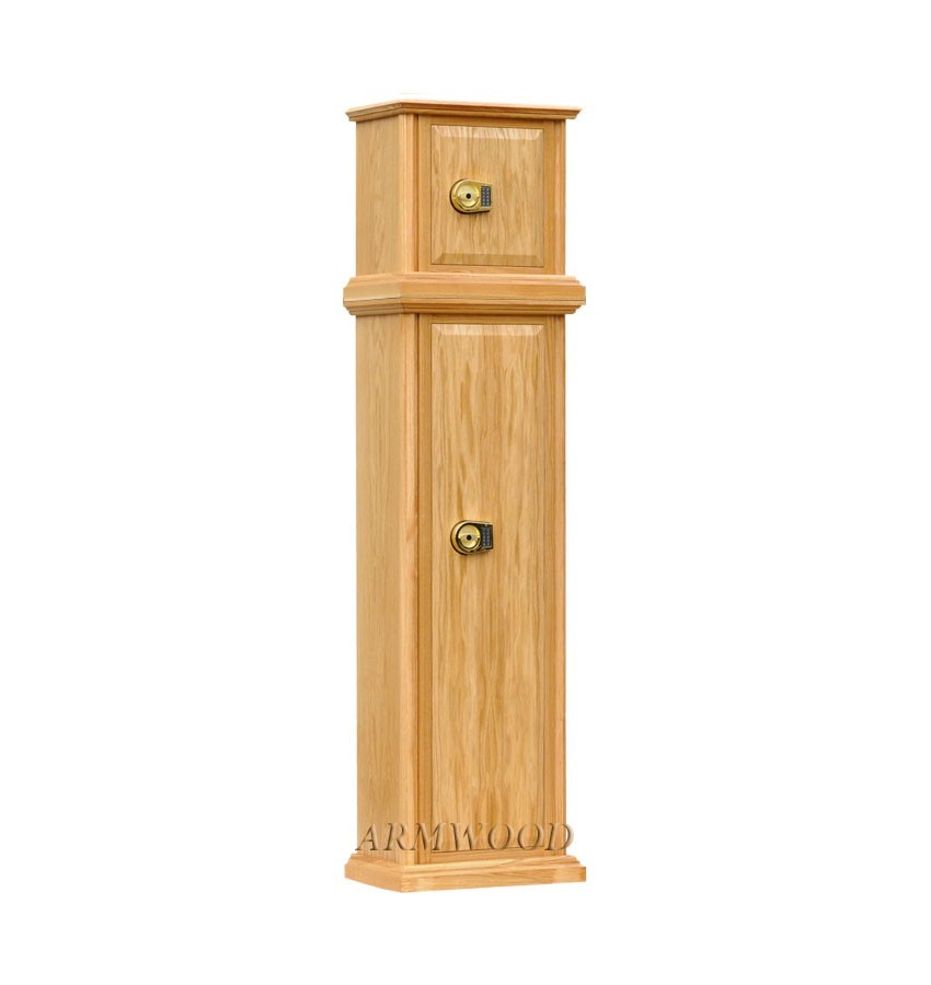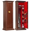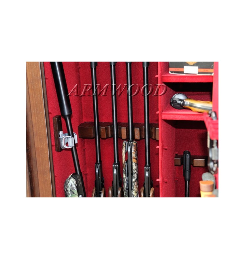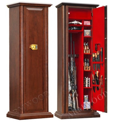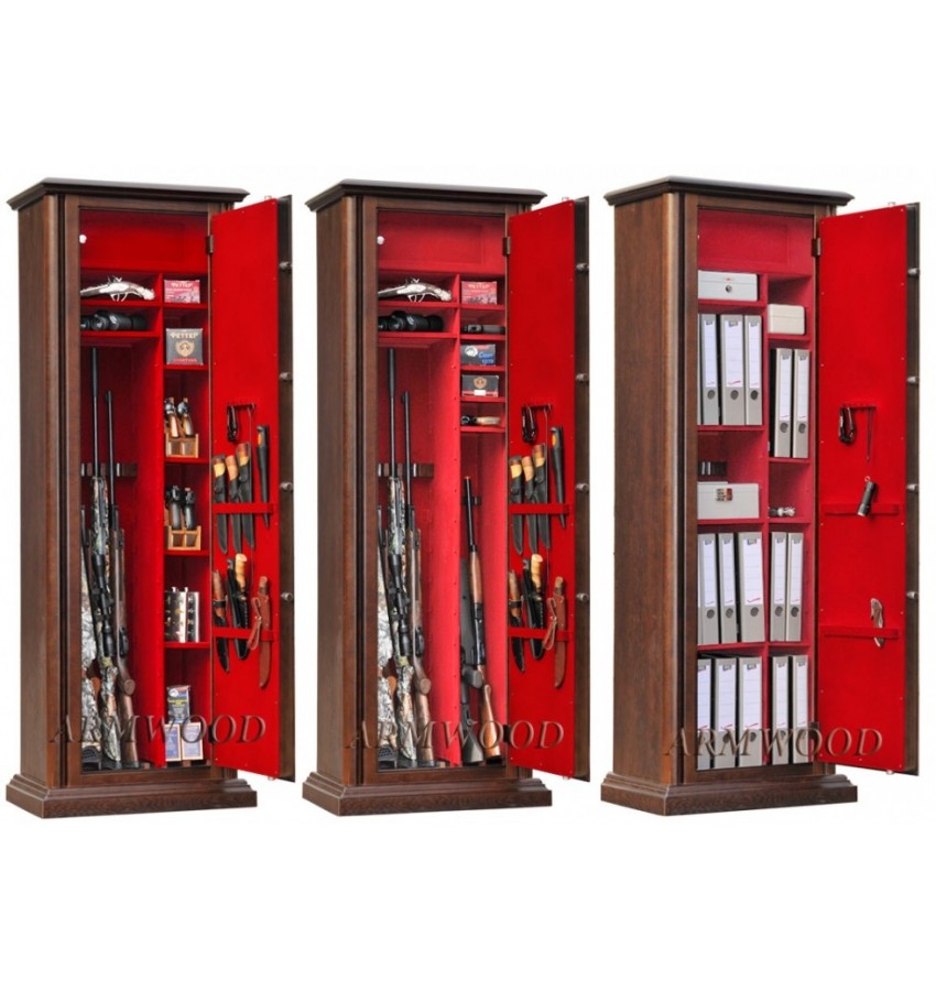 Элитный оружейный сейф с отделкой натуральным деревом. Сейфы полностью удовлетворяют требованиям МВД к хранению оружия. Универсальный сейф, может использоваться как оружейный сейф либо как личный (офисный) сейф. Замок Сейф оборудован высокосекретным сертифицированным электронным кодовым замком La Gard (США). Этот замок Вы можете использовать с одним пользовательским кодом либо с двумя кодами: код руководителя (мастер-код) и рабочий код. Подробная и понятная инструкция на русском языке прилагается. Питание электронного замка от стандартной батарейки. Долгий срок службы батарейки. Простая смена разряженной батарейки. Сейф имеет мощную вертикальную и горизонтальную ригельную систему с запиранием по всем сторонам. Защита Дверь сейфа имеет коробчатую конструкцию для дополнительного усиления. Петли внутренние из стали 6мм. Усиленный корпус. Внутреннее устройство Внутри сейфа запираемое (патронное) отделение и вертикальная перегородка, которая делит внутреннее пространство сейфа на два отделения. Внутри широкого отделения пять съёмных полок и съёмные деревянные ложементы на четыре ствола. Также в широком отделении имеется съёмный боковой роликовый ложемент-зажим (производства Германии) с регулируемой высотой установки (для хранения в широком отделении 5-го ствола, либо для дополнительной фиксации оружия с оптикой). Внутри узкого отделения пять коротких съёмных полок и съёмные деревянные ложементы на два ствола. Все полки с регулируемой высотой установки. По желанию заказчика возможна поставка с дополнительными полками. На внутренней поверхности двери сейфа имеются крючки, а так же держатели для удобного хранения ножей. Ружья можно хранить как в широком, так и в узком отделениях сейфа. На внутренней поверхности одной из дверей сейфа имеются удобные крючки и два держателя для хранения ножей и пр. Внутренняя отделка Сейфы ARMWOOD модификации FLOCK имеют престижную полную внутреннюю мягкую отделку флокированием бархатом (различных цветов по нашему каталогу), например на фото – флок бордо. Полная внутренняя мягкая отделка защищает Ваше оружие от контакта с металлом, царапин повреждений и т.п. Некоторые варианты флока представлены на дополнительном фото. Установка Предусмотрена возможность крепления сейфа к стене. По желанию заказчика возможна поставка в исполнении, предусматривающем также крепление к полу. Модификации В зависимости от типа внутренней отделки имеются пять модификаций этих оружейных сейфов. Модификация Primary (базовая) имеет деревянные ложементы, отделанные бархатом либо винилискожей либо ложементы «премиум». Модификации Lux и Lux+ имеют дополнительно к базовой - мягкую полную внутреннюю отделку винилискожей или бархатом. Различные варианты цвета бархата и винилискожи по нашему каталогу. Модификация Lux+ отличается от модификации Lux следующим: дополнительная отделка фасадов внутренних запираемых отделений деревом. Модификации Flock и Flock+ - имеют полную внутреннюю мягкую отделку флокированием бархатом (различных цветов по нашему каталогу) и ложементы «премиум». Модификация Flock+ отличается от модификации Flock следующим: 1) дополнительная отделка фасадов внутренних запираемых отделений деревом, 2) перегородка и полки – деревянные (в модификации Flock – они металлические флокированные). На основном фото – пример сейф