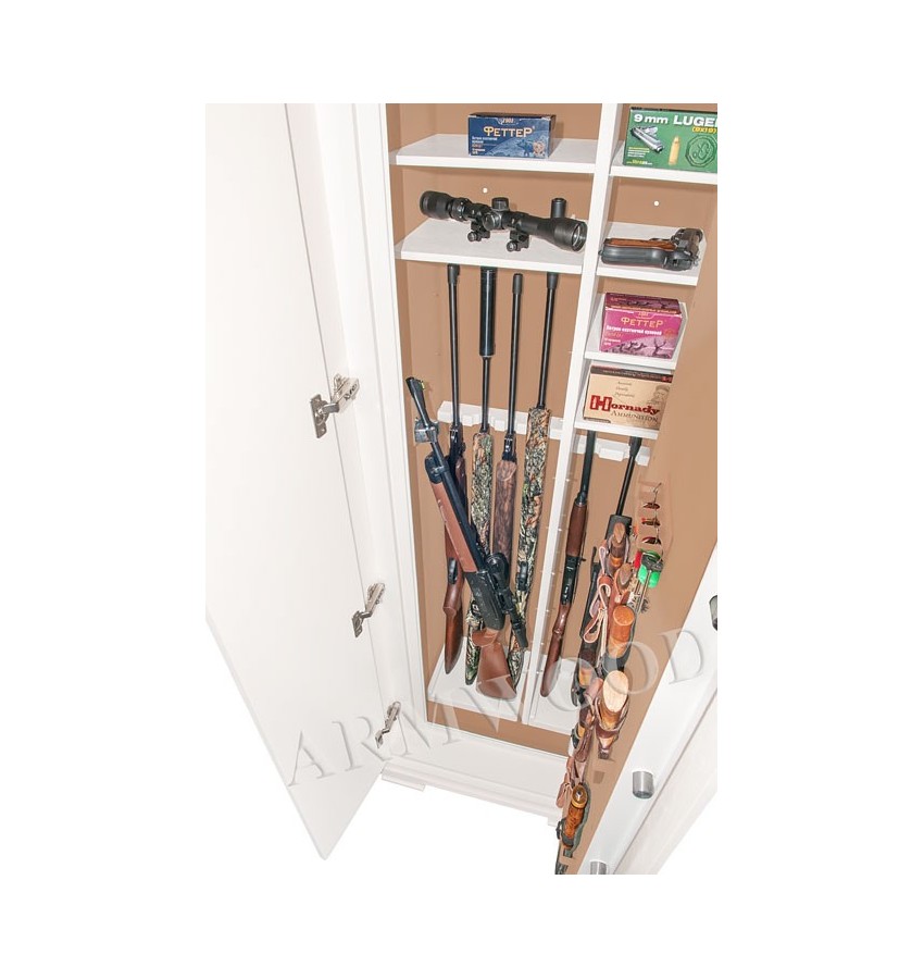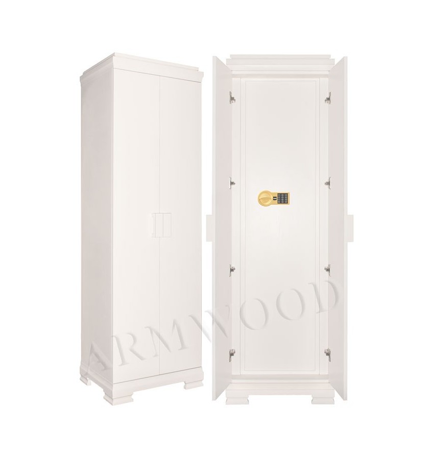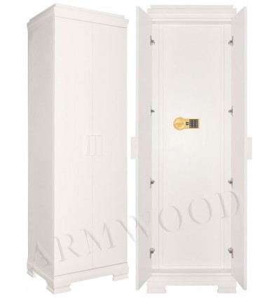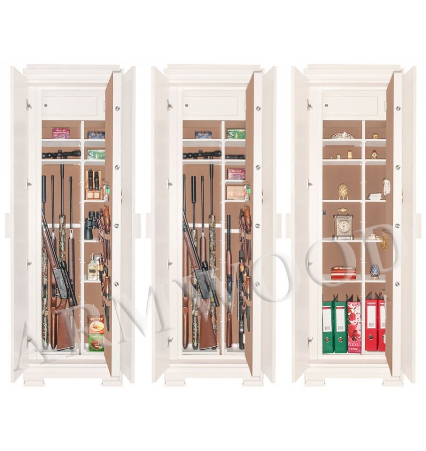 Сейф в скрытом исполнении. Имеет две наружные мебельные деревянные двери, за которыми скрыт непосредственно сам сейф. Снаружи изделие выглядит как деревянный мебельный шкаф. Сейфы полностью удовлетворяют требованиям МВД к хранению оружия. Наружная отделка - натуральное дерево, окрашенное по каталогу RAL. Универсальный сейф, может использоваться как оружейный сейф либо как личный (офисный) сейф. Замок Сейф оборудован высокосекретным сертифицированным электронным кодовым замком MAUER (Германия). Этот замок Вы можете использовать с одним пользовательским кодом либо с двумя кодами: код руководителя (мастер-код) и рабочий код. Подробная и понятная инструкция на русском языке прилагается. Питание электронного замка от стандартной батарейки. Долгий срок службы батарейки. Простая смена разряженной батарейки. Сейф имеет мощную вертикальную и горизонтальную ригельную систему с запиранием по всем сторонам. Защита Дверь сейфа имеет коробчатую конструкцию для дополнительного усиления. Петли внутренние из стали 6мм. Усиленный корпус. Внутреннее устройство Внутри сейфа запираемое (патронное) отделение и вертикальная перегородка, которая делит внутреннее пространство сейфа на два отделения. Внутри широкого отделения пять съёмных полок и съёмные деревянные ложементы на четыре ствола. Также в широком отделении имеется съёмный боковой роликовый ложемент-зажим (производства Германии) с регулируемой высотой установки (для хранения в широком отделении 5-го ствола, либо для дополнительной фиксации оружия с оптикой). Внутри узкого отделения пять коротких съёмных полок и съёмные деревянные ложементы на два ствола. Все полки с регулируемой высотой установки. По желанию заказчика возможна поставка с дополнительными полками. На внутренней поверхности двери сейфа имеются крючки, а так же держатели для удобного хранения ножей. Ружья можно хранить как в широком, так и в узком отделениях сейфа. Внутренняя отделка Сейфы ARMWOOD модификации FLOCK+ имеют престижную полную внутреннюю мягкую отделку флокированием бархатом (различных цветов по нашему каталогу), например на фото – флок кремовый. Полная внутренняя мягкая отделка защищает Ваше оружие от контакта с металлом, царапин повреждений и т.п. Некоторые варианты флока представлены на дополнительном фото. В модификации FLOCK+ фасады внутренних запираемых отделений имеют отделку деревом. Внутренняя перегородка и полки также выполнены из дерева. Установка Предусмотрена возможность крепления сейфа к стене. По желанию заказчика возможна поставка в исполнении, предусматривающем также крепление к полу. Модификации В зависимости от типа внутренней отделки имеются пять модификаций этих оружейных сейфов. Модификация Primary (базовая) имеет деревянные ложементы, отделанные бархатом либо винилискожей либо ложементы «премиум». Модификации Lux и Lux+ имеют дополнительно к базовой - мягкую полную внутреннюю отделку винилискожей или бархатом. Различные варианты цвета бархата и винилискожи по нашему каталогу. Модификация Lux+ отличается от модификации Lux следующим: дополнительная отделка фасадов внутренних запираемых отделений деревом. Модификации Flock и Flock+ - имеют полную внутреннюю мягкую отделку флокированием бархатом (различных цветов по нашему каталогу) и ложементы «премиум». Модификация Flock+ отличается от мо
