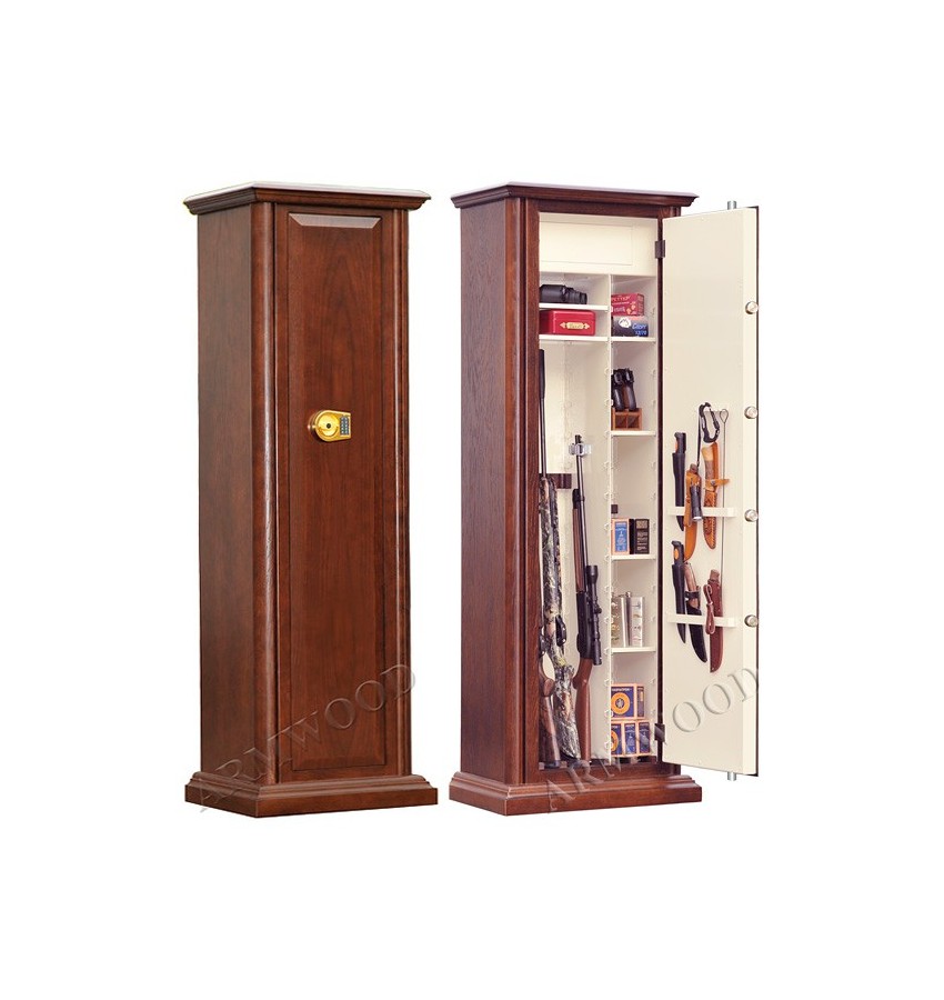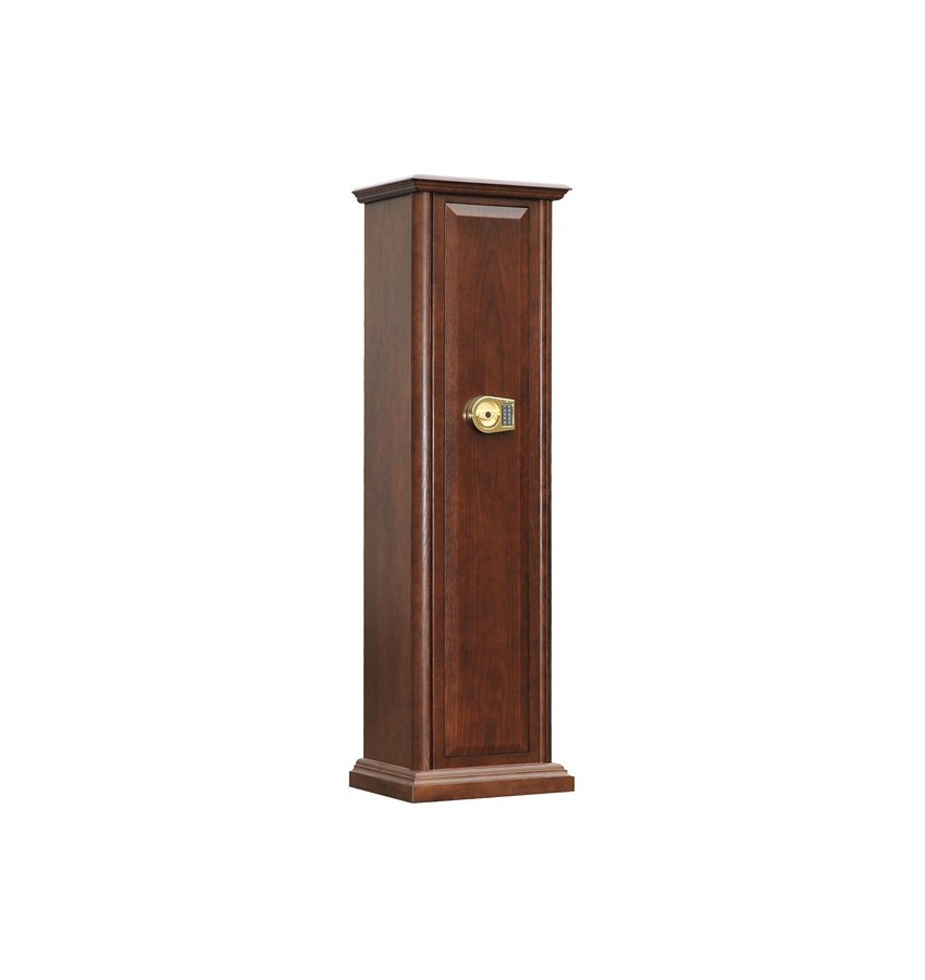 Элитный оружейный сейф с отделкой натуральным деревом. Сейфы полностью удовлетворяют требованиям МВД к хранению оружия. Универсальный сейф, может использоваться как оружейный сейф либо как личный (офисный) сейф. Замок Сейф оборудован высокосекретным сертифицированным электронным кодовым замком La Gard (США). Этот замок Вы можете использовать с одним пользовательским кодом либо с двумя кодами: код руководителя (мастер-код) и рабочий код. Подробная и понятная инструкция на русском языке прилагается. Питание электронного замка от стандартной батарейки. Долгий срок службы батарейки. Простая смена разряженной батарейки. Сейф имеет мощную вертикальную и горизонтальную ригельную систему с запиранием по всем сторонам. Защита Дверь сейфа имеет коробчатую конструкцию для дополнительного усиления. Петли внутренние из стали 6мм. Усиленный корпус. Внутреннее устройство Внутри сейфа запираемое (патронное) отделение и вертикальная перегородка, которая делит внутреннее пространство сейфа на два отделения. Внутри широкого отделения пять съёмных полок и съёмные деревянные ложементы на четыре ствола. Также в широком отделении имеется съёмный боковой роликовый ложемент-зажим (производства Германии) с регулируемой высотой установки (для хранения в широком отделении 5-го ствола, либо для дополнительной фиксации оружия с оптикой). Внутри узкого отделения пять коротких съёмных полок и съёмные деревянные ложементы на два ствола. Все полки с регулируемой высотой установки. По желанию заказчика возможна поставка с дополнительными полками. На внутренней поверхности двери сейфа имеются крючки, а так же держатели для удобного хранения ножей. Ружья можно хранить как в широком, так и в узком отделениях сейфа. Внутренняя отделка Для сейфов ARMWOOD модификации PRIMARY имеется возможность выбрать различные варианты полимерно-порошковых покрытий. Имеются покрытия различных цветов и структур. Некоторые варианты полимерно-порошковых покрытий представлены на дополнительном фото. Установка Предусмотрена возможность крепления сейфа к стене. По желанию заказчика возможна поставка в исполнении, предусматривающем также крепление к полу. Модификации В зависимости от типа внутренней отделки имеются пять модификаций этих оружейных сейфов. Модификация Primary (базовая) имеет деревянные ложементы, отделанные бархатом либо винилискожей либо ложементы «премиум». Модификации Lux и Lux+ имеют дополнительно к базовой - мягкую полную внутреннюю отделку винилискожей или бархатом. Различные варианты цвета бархата и винилискожи по нашему каталогу. Модификация Lux+ отличается от модификации Lux следующим: дополнительная отделка фасадов внутренних запираемых отделений деревом. Модификации Flock и Flock+ - имеют полную внутреннюю мягкую отделку флокированием бархатом (различных цветов по нашему каталогу) и ложементы «премиум». Модификация Flock+ отличается от модификации Flock следующим: 1) дополнительная отделка фасадов внутренних запираемых отделений деревом, 2) перегородка и полки – деревянные (в модификации Flock – они металлические флокированные). Полная внутренняя мягкая отделка защищает Ваше оружие от контакта с металлом, царапин, повреждений и т.п. Металлические детали сейфа имеют гигиенически безопасное износо- и коррозионно-устойчивое полимерно-порошковое покрытие на ос