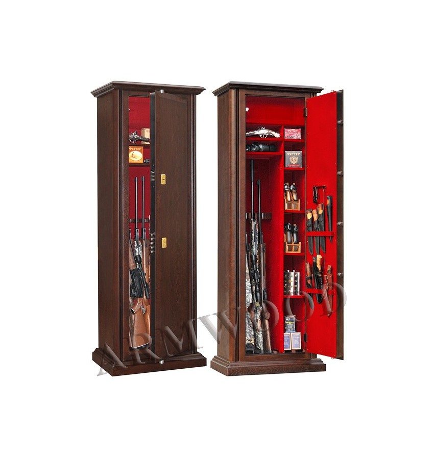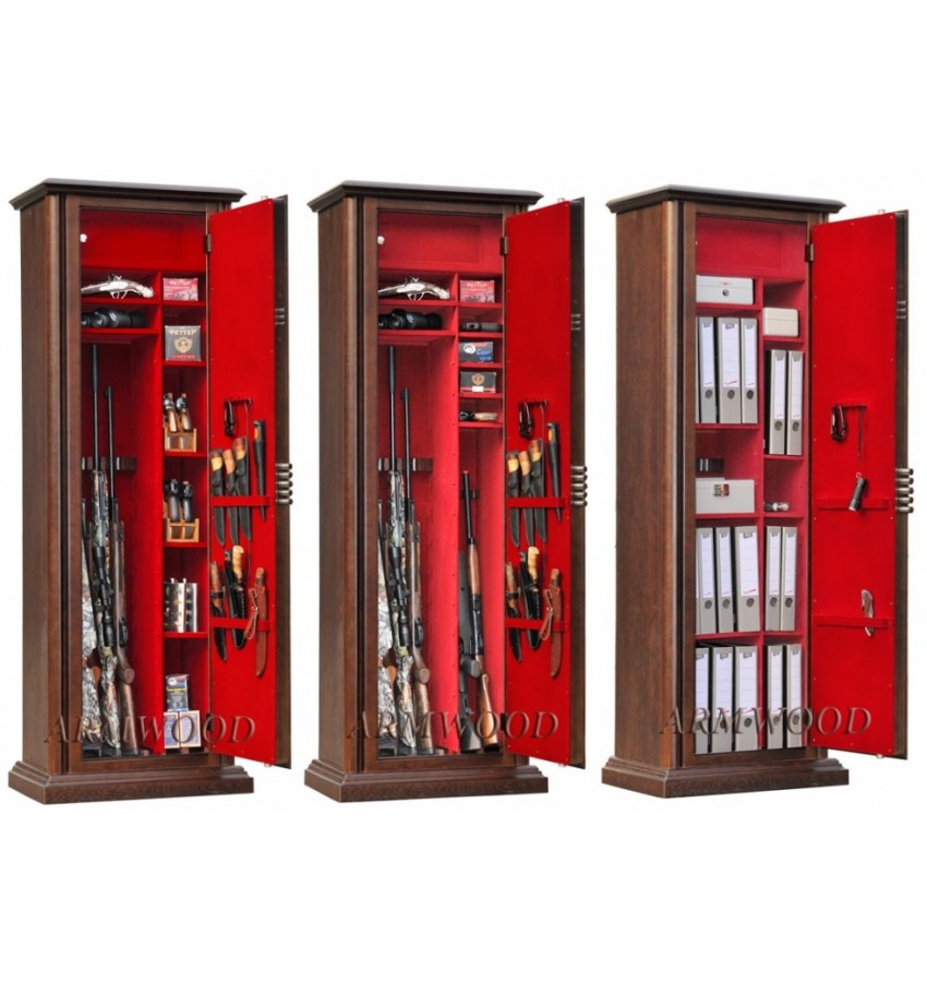Элитный оружейный сейф с отделкой натуральным деревом. Сейфы полностью удовлетворяют требованиям МВД к хранению оружия. Универсальный сейф, может использоваться как оружейный сейф либо как личный (офисный) сейф. Замок Сейф оборудован двумя сертифицированными ключевыми замками: замок 4-го класса!!! повышенной взломостойкости и секретности (1,5 миллиона комбинаций) плюс замок 3 класса. Замки разработаны Cisa (Италия). По желанию заказчика возможна поставка сейфов с замками производства Германии: Mauer или Wittkopp. Сейф имеет мощную вертикальную и горизонтальную ригельную систему с запиранием по всем сторонам. Защита Дверь сейфа имеет коробчатую конструкцию для дополнительного усиления. Петли внутренние из стали 6мм. Усиленный корпус. Внутреннее устройство Внутри сейфа запираемое (патронное) отделение и вертикальная перегородка, которая делит внутреннее пространство сейфа на два отделения. Внутри широкого отделения пять съёмных полок и съёмные деревянные ложементы на четыре ствола. Также в широком отделении имеется съёмный боковой роликовый ложемент-зажим (производства Германии) с регулируемой высотой установки (для хранения в широком отделении 5-го ствола, либо для дополнительной фиксации оружия с оптикой). Внутри узкого отделения пять коротких съёмных полок и съёмные деревянные ложементы на два ствола. Все полки с регулируемой высотой установки. По желанию заказчика возможна поставка с дополнительными полками. На внутренней поверхности двери сейфа имеются крючки, а так же держатели для удобного хранения ножей. Ружья можно хранить как в широком, так и в узком отделениях сейфа. На внутренней поверхности одной из дверей сейфа имеются удобные крючки и два держателя для хранения ножей и пр. Внутренняя отделка Сейфы ARMWOOD модификации FLOCK имеют престижную полную внутреннюю мягкую отделку флокированием бархатом (различных цветов по нашему каталогу), например на фото – флок бордо. Полная внутренняя мягкая отделка защищает Ваше оружие от контакта с металлом, царапин повреждений и т.п. Некоторые варианты флока представлены на дополнительном фото. Установка Предусмотрена возможность крепления сейфа к стене. По желанию заказчика возможна поставка в исполнении, предусматривающем также крепление к полу. Модификации В зависимости от типа внутренней отделки имеются пять модификаций этих оружейных сейфов. Модификация Primary (базовая) имеет деревянные ложементы, отделанные бархатом либо винилискожей либо ложементы «премиум». Модификации Lux и Lux+ имеют дополнительно к базовой - мягкую полную внутреннюю отделку винилискожей или бархатом. Различные варианты цвета бархата и винилискожи по нашему каталогу. Модификация Lux+ отличается от модификации Lux следующим: дополнительная отделка фасадов внутренних запираемых отделений деревом. Модификации Flock и Flock+ - имеют полную внутреннюю мягкую отделку флокированием бархатом (различных цветов по нашему каталогу) и ложементы «премиум». Модификация Flock+ отличается от модификации Flock следующим: 1) дополнительная отделка фасадов внутренних запираемых отделений деревом, 2) перегородка и полки – деревянные (в модификации Flock – они металлические флокированные). На основном фото – пример сейфа в модификации Flock+, цвет флока – бордо. Полная внутренняя мягкая отделка защищает Ваше оружие от контакта с металл