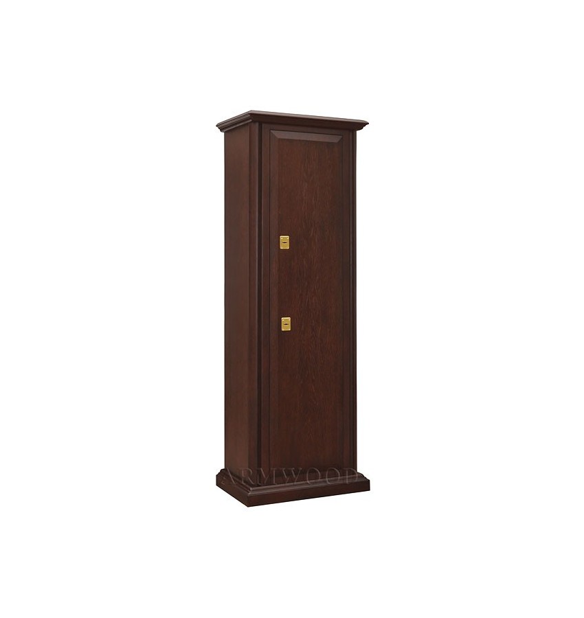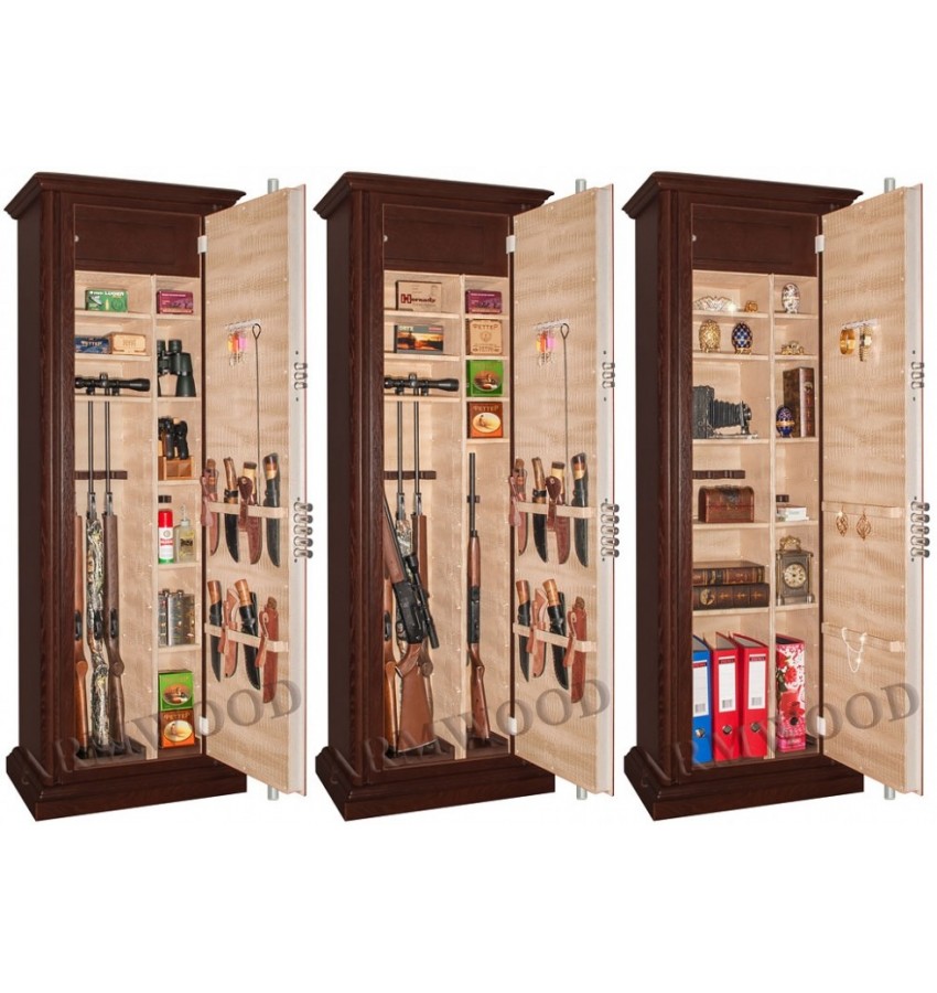 Элитный оружейный сейф с отделкой натуральным деревом. Сейфы полностью удовлетворяют требованиям МВД к хранению оружия. Универсальный сейф, может использоваться как оружейный сейф либо как личный (офисный) сейф. Замок Сейф оборудован двумя сертифицированными ключевыми замками: замок 4-го класса!!! повышенной взломостойкости и секретности (1,5 миллиона комбинаций) плюс замок 3 класса. Замки произведены совместно с Cisa (Италия). По желанию заказчика возможна поставка сейфов с замками производства Германии: Mauer или Wittkopp. Сейф имеет мощную вертикальную и горизонтальную ригельную систему с запиранием по всем сторонам. Защита Дверь сейфа имеет коробчатую конструкцию для дополнительного усиления. Петли внутренние из стали 6мм. Усиленный корпус. Внутреннее устройство Внутри сейфа запираемое (патронное) отделение и вертикальная перегородка, которая делит внутреннее пространство сейфа на два отделения. Внутри широкого отделения пять съёмных полок и съёмные деревянные ложементы на четыре ствола. Также в широком отделении имеется съёмный боковой роликовый ложемент-зажим (производства Германии) с регулируемой высотой установки (для хранения в широком отделении 5-го ствола, либо для дополнительной фиксации оружия с оптикой). Внутри узкого отделения пять коротких съёмных полок и съёмные деревянные ложементы на два ствола. Все полки с регулируемой высотой установки. По желанию заказчика возможна поставка с дополнительными полками. На внутренней поверхности двери сейфа имеются крючки, а так же держатели для удобного хранения ножей. Ружья можно хранить как в широком, так и в узком отделениях сейфа. На внутренней поверхности одной из дверей сейфа имеются три держателя для хранения ножей и пр. Внутренняя отделка Сейфы ARMWOOD модификации Lux Plus имеют полную внутреннюю мягкую отделку искусственной кожей (различных цветов и рисунков по нашему каталогу). Дополнительная отделка фасадов внутренних запираемых отделений деревом. NEW! Поступила искусственная кожа, имитирующая кожу крокодилов, змей и т.п. Тоже различных цветов! На основном фото пример сейфа с внутренней отделкой «бронзовый крокодил». Полная внутренняя мягкая отделка защищает Ваше оружие от контакта с металлом, царапин повреждений и т.п. Установка Предусмотрена возможность крепления сейфа к стене. По желанию заказчика возможна поставка в исполнении, предусматривающем также крепление к полу. Модификации В зависимости от типа внутренней отделки имеются пять модификаций этих оружейных сейфов. Модификация Primary (базовая) имеет деревянные ложементы, отделанные бархатом либо винилискожей либо ложементы «премиум». Модификации Lux и Lux+ имеют дополнительно к базовой - мягкую полную внутреннюю отделку винилискожей или бархатом. Различные варианты цвета бархата и винилискожи по нашему каталогу. Модификация Lux+ отличается от модификации Lux следующим: дополнительная отделка фасадов внутренних запираемых отделений деревом. Модификации Flock и Flock+ - имеют полную внутреннюю мягкую отделку флокированием бархатом (различных цветов по нашему каталогу) и ложементы «премиум». Модификация Flock+ отличается от модификации Flock следующим: 1) дополнительная отделка фасадов внутренних запираемых отделений деревом, 2) перегородка и полки – деревянные (в модификации Flock – они металлические флокированные). П