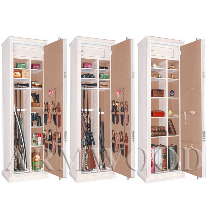 Элитный оружейный сейф с отделкой натуральным деревом. Сейфы полностью удовлетворяют требованиям МВД к хранению оружия. Универсальный сейф, может использоваться как оружейный сейф либо как личный (офисный) сейф. Замок Сейф оборудован двумя сертифицированными ключевыми замками: замок 4-го класса!!! повышенной взломостойкости и секретности (1,5 миллиона комбинаций) плюс замок 3 класса. Замки разработаны Cisa (Италия). По желанию заказчика возможна поставка сейфов с замками производства Германии: Mauer или Wittkopp. Сейф имеет мощную вертикальную и горизонтальную ригельную систему с запиранием по всем сторонам. Защита Дверь сейфа имеет коробчатую конструкцию для дополнительного усиления. Петли внутренние из стали 6мм. Усиленный корпус. Внутреннее устройство Внутри сейфа запираемое (патронное) отделение и вертикальная перегородка, которая делит внутреннее пространство сейфа на два отделения. Внутри широкого отделения пять съёмных полок и съёмные деревянные ложементы на четыре ствола. Также в широком отделении имеется съёмный боковой роликовый ложемент-зажим (производства Германии) с регулируемой высотой установки (для хранения в широком отделении 5-го ствола, либо для дополнительной фиксации оружия с оптикой). Внутри узкого отделения пять коротких съёмных полок и съёмные деревянные ложементы на два ствола. Все полки с регулируемой высотой установки. По желанию заказчика возможна поставка с дополнительными полками. На внутренней поверхности двери сейфа имеются крючки, а так же держатели для удобного хранения ножей. Ружья можно хранить как в широком, так и в узком отделениях сейфа. Внутренняя отделка Сейфы ARMWOOD модификации FLOCK+ имеют престижную полную внутреннюю мягкую отделку флокированием бархатом (различных цветов по нашему каталогу), например на фото – флок кремовый. Полная внутренняя мягкая отделка защищает Ваше оружие от контакта с металлом, царапин повреждений и т.п. Некоторые варианты флока представлены на дополнительном фото. В модификации FLOCK+ фасады внутренних запираемых отделений имеют отделку деревом. Внутренняя перегородка и полки также выполнены из дерева. Установка Предусмотрена возможность крепления сейфа к стене. По желанию заказчика возможна поставка в исполнении, предусматривающем также крепление к полу. Модификации В зависимости от типа внутренней отделки имеются пять модификаций этих оружейных сейфов. Модификация Primary (базовая) имеет деревянные ложементы, отделанные бархатом либо винилискожей либо ложементы «премиум». Модификации Lux и Lux+ имеют дополнительно к базовой - мягкую полную внутреннюю отделку винилискожей или бархатом. Различные варианты цвета бархата и винилискожи по нашему каталогу. Модификация Lux+ отличается от модификации Lux следующим: дополнительная отделка фасадов внутренних запираемых отделений деревом. Модификации Flock и Flock+ - имеют полную внутреннюю мягкую отделку флокированием бархатом (различных цветов по нашему каталогу) и ложементы «премиум». Модификация Flock+ отличается от модификации Flock следующим: 1) дополнительная отделка фасадов внутренних запираемых отделений деревом, 2) перегородка и полки – деревянные (в модификации Flock – они металлические флокированные). На основном фото – пример сейфа в модификации Flock+, цвет флока – кремовый. Полная внутренняя мягкая отделка защища
