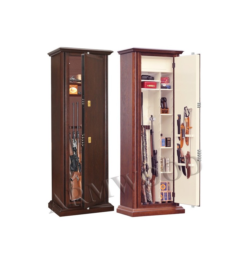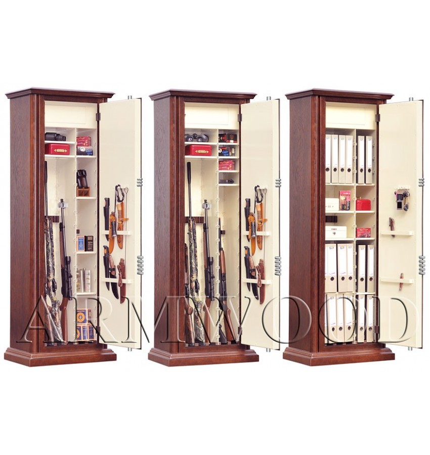 Элитный оружейный сейф с отделкой натуральным деревом. Сейфы полностью удовлетворяют требованиям МВД к хранению оружия. Универсальный сейф, может использоваться как оружейный сейф либо как личный (офисный) сейф. Замок Сейф оборудован двумя сертифицированными ключевыми замками: замок 4-го класса!!! повышенной взломостойкости и секретности (1,5 миллиона комбинаций) плюс замок 3 класса. Замки разработаны совместно с Cisa (Италия). По желанию заказчика возможна поставка сейфов с замками производства Германии: Mauer или Wittkopp. Сейф имеет мощную вертикальную и горизонтальную ригельную систему с запиранием по всем сторонам. Защита Дверь сейфа имеет коробчатую конструкцию для дополнительного усиления. Петли внутренние из стали 6мм. Усиленный корпус. Внутреннее устройство Внутри сейфа запираемое (патронное) отделение и вертикальная перегородка, которая делит внутреннее пространство сейфа на два отделения. Внутри широкого отделения пять съёмных полок и съёмные деревянные ложементы на четыре ствола. Также в широком отделении имеется съёмный боковой роликовый ложемент-зажим (производства Германии) с регулируемой высотой установки (для хранения в широком отделении 5-го ствола, либо для дополнительной фиксации оружия с оптикой). Внутри узкого отделения пять коротких съёмных полок и съёмные деревянные ложементы на два ствола. Все полки с регулируемой высотой установки. По желанию заказчика возможна поставка с дополнительными полками. На внутренней поверхности двери сейфа имеются крючки, а так же держатели для удобного хранения ножей. Ружья можно хранить как в широком, так и в узком отделениях сейфа. Внутренняя отделка Для сейфов ARMWOOD модификации PRIMARY имеется возможность выбрать различные варианты полимерно-порошковых покрытий. Имеются покрытия различных цветов и структур. Некоторые варианты полимерно-порошковых покрытий представлены на дополнительном фото. Установка Предусмотрена возможность крепления сейфа к стене. По желанию заказчика возможна поставка в исполнении, предусматривающем также крепление к полу. Модификации В зависимости от типа внутренней отделки имеются пять модификаций этих оружейных сейфов. Модификация Primary (базовая) имеет деревянные ложементы, отделанные бархатом либо винилискожей либо ложементы «премиум». Модификации Lux и Lux+ имеют дополнительно к базовой - мягкую полную внутреннюю отделку винилискожей или бархатом. Различные варианты цвета бархата и винилискожи по нашему каталогу. Модификация Lux+ отличается от модификации Lux следующим: дополнительная отделка фасадов внутренних запираемых отделений деревом. Модификации Flock и Flock+ - имеют полную внутреннюю мягкую отделку флокированием бархатом (различных цветов по нашему каталогу) и ложементы «премиум». Модификация Flock+ отличается от модификации Flock следующим: 1) дополнительная отделка фасадов внутренних запираемых отделений деревом, 2) перегородка и полки – деревянные (в модификации Flock – они металлические флокированные). Полная внутренняя мягкая отделка защищает Ваше оружие от контакта с металлом, царапин, повреждений и т.п. Металлические детали сейфа имеют гигиенически безопасное износо- и коррозионно-устойчивое полимерно-порошковое покрытие на основе материалов производства Италии или Франции. Имеются покрытия различных цветов и структур: металл