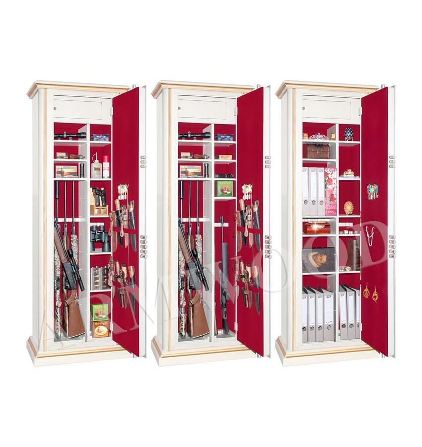 Элитный универсальный оружейный и личный (офисный) сейф с отделкой натуральным деревом. Окрашенное дерево (по каталогу RAL) с патинированием. Возможны различные цвета окраски и патинирования. Сейфы полностью удовлетворяют требованиям МВД к хранению оружия. Может использоваться как оружейный либо личный сейф. Замок Сейф оборудован двумя сертифицированными ключевыми замками: замок 4-го класса!!! повышенной взломостойкости и секретности (1,5 миллиона комбинаций) плюс замок 3 класса. Замки разработаны Cisa (Италия). По желанию заказчика возможна поставка сейфов с замками производства Германии: Mauer или Wittkopp. Сейф имеет мощную вертикальную и горизонтальную ригельную систему с запиранием по всем сторонам. Защита Дверь сейфа имеет коробчатую конструкцию для дополнительного усиления. Петли внутренние из стали 6мм. Усиленный корпус. Внутреннее устройство Внутри сейфа запираемое (патронное) отделение и вертикальная перегородка, которая делит внутреннее пространство сейфа на два отделения. Внутри широкого отделения пять съёмных полок и съёмные деревянные ложементы на четыре ствола. Также в широком отделении имеется съёмный боковой роликовый ложемент-зажим (производства Германии) с регулируемой высотой установки (для хранения в широком отделении 5-го ствола, либо для дополнительной фиксации оружия с оптикой). Внутри узкого отделения пять коротких съёмных полок и съёмные деревянные ложементы на два ствола. Все полки с регулируемой высотой установки. По желанию заказчика возможна поставка с дополнительными полками. На внутренней поверхности двери сейфа имеются крючки, а так же держатели для удобного хранения ножей. Ружья можно хранить как в широком, так и в узком отделениях сейфа. По желанию заказчика возможна поставка с дополнительными полками. Внутренняя отделка Сейфы ARMWOOD модификации FLOCK+ имеют престижную полную внутреннюю мягкую отделку флокированием бархатом (различных цветов по нашему каталогу), например на фото – флок бордо. Полная внутренняя мягкая отделка защищает Ваше оружие от контакта с металлом, царапин повреждений и т.п. Некоторые варианты флока представлены на дополнительном фото. В модификации FLOCK+ фасады внутренних запираемых отделений имеют отделку деревом. Внутренняя перегородка и полки также выполнены из дерева. Установка Предусмотрена возможность крепления сейфа к стене. По желанию заказчика возможна поставка в исполнении, предусматривающем также крепление к полу. Модификации В зависимости от типа внутренней отделки имеются пять модификаций этих оружейных сейфов. Модификация Primary (базовая) имеет деревянные ложементы, отделанные бархатом либо винилискожей либо ложементы «премиум». Модификации Lux и Lux+ имеют дополнительно к базовой - мягкую полную внутреннюю отделку винилискожей или бархатом. Различные варианты цвета бархата и винилискожи по нашему каталогу. Модификация Lux+ отличается от модификации Lux следующим: дополнительная отделка фасадов внутренних запираемых отделений деревом. Модификации Flock и Flock+ - имеют полную внутреннюю мягкую отделку флокированием бархатом (различных цветов по нашему каталогу) и ложементы «премиум». Модификация Flock+ отличается от модификации Flock следующим: 1) дополнительная отделка фасадов внутренних запираемых отделений деревом, 2) перегородка и полки – деревянные (в модиф