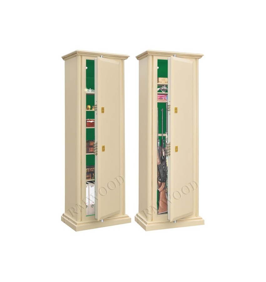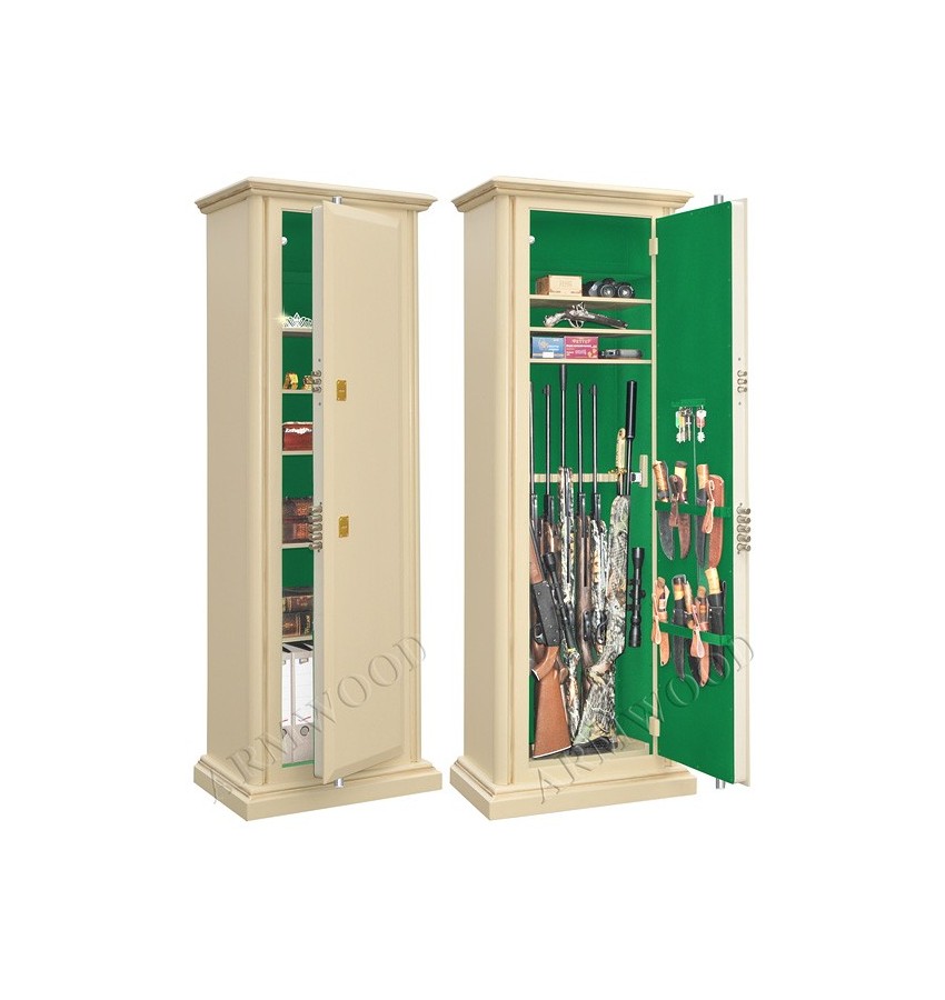 Элитный универсальный оружейный и личный (офисный) сейф с отделкой натуральным деревом. Окрашенное дерево (по каталогу RAL) с патинированием. Сейфы полностью удовлетворяют требованиям МВД к хранению оружия. Может использоваться как оружейный либо личный сейф. Замок Сейф оборудован двумя сертифицированными ключевыми замками: замок 4-го класса!!! повышенной взломостойкости и секретности (1,5 миллиона комбинаций) плюс замок 3 класса. Замки разработаны Cisa (Италия). По желанию заказчика возможна поставка сейфов с замками производства Германии: Mauer или Wittkopp. Сейф имеет мощную вертикальную и горизонтальную ригельную систему с запиранием по всем сторонам. Защита Дверь сейфа имеет коробчатую конструкцию для дополнительного усиления. Петли внутренние из стали 6мм. Усиленный корпус. Внутреннее устройство Внутри сейфа запираемое (патронное) отделение, 5 съёмных полок с регулируемой высотой установки и съёмные деревянные ложементы. Также на боковых стенках имеются два съёмных роликовых зажима (производства Германии) с регулируемой высотой установки. Эти зажимы используются в том числе и для удобного хранения оружия с оптикой. На внутренней поверхности двери сейфа имеются держатели для ножей и крючки для хранения шомполов, ключей и прочего. По желанию заказчика возможна поставка с дополнительными полками. На внутренней поверхности одной из дверей сейфа имеются удобные крючки и два держателя для хранения ножей и пр. Внутренняя отделка Сейфы ARMWOOD модификации FLOCK имеют престижную полную внутреннюю мягкую отделку флокированием бархатом (различных цветов по нашему каталогу), например на фото – флок бордо. Полная внутренняя мягкая отделка защищает Ваше оружие от контакта с металлом, царапин повреждений и т.п. Некоторые варианты флока представлены на дополнительном фото. Установка Предусмотрена возможность крепления сейфа к стене. По желанию заказчика возможна поставка в исполнении, предусматривающем также крепление к полу. Модификации В зависимости от типа внутренней отделки имеются четыре модификации этих оружейных сейфов. Модификация Primary (базовая) имеет деревянные ложементы, отделанные бархатом либо винилискожей либо ложементы «премиум». Модификации Lux и Lux+ имеют дополнительно к базовой - мягкую полную внутреннюю отделку винилискожей или бархатом. Различные варианты цвета бархата и винилискожи по нашему каталогу. Модификация Lux+ отличается от модификации Lux следующим: дополнительная отделка фасадов внутренних запираемых отделений деревом. Модификация Flock - имеет полную внутреннюю мягкую отделку флокированием бархатом (различных цветов по нашему каталогу) и ложементы «премиум». На основном фото – пример сейфа в модификации Flock, цвет флока – зеленый. Полная внутренняя мягкая отделка защищает Ваше оружие от контакта с металлом, царапин, повреждений и т.п. Металлические детали сейфа имеют гигиенически безопасное износо- и коррозионно-устойчивое полимерно-порошковое покрытие на основе материалов производства Италии или Франции. Имеются покрытия различных цветов и структур: металлики, антики и д.р. По желанию заказчика возможно изменение размеров, конструкции, внутреннего устройства и т.п. Возможна замена верхних деревянных ложементов на ложементы других типов (роликовые ложементы-зажимы производства Германии, специальные 