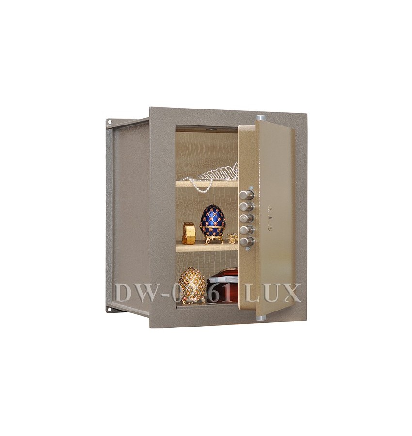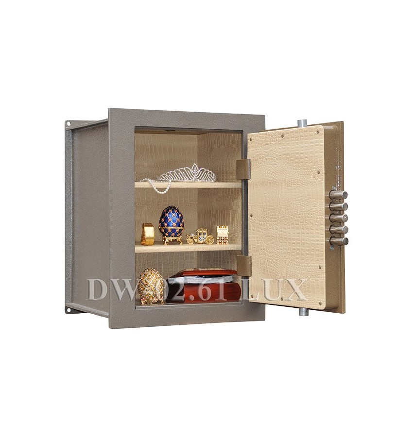 Предназначен для встраивания в стену. Сейф имеет гигиенически безопасное износо- и коррозионно-устойчивое полимерное покрытие на основе материалов производства Италии. Имеются покрытия различных цветов и структур: металлики, антики и д.р. Различные варианты цветового дизайна, например: корпус и двери имеют одинаковое покрытие, либо корпус и двери имеют покрытия разного цвета - выбирайте. Внутренняя поверхность сейфа, а так же полки - имеют мягкую отделку бархатом или искусственной кожей различных цветов по нашему каталогу. New! Поступила искусственная кожа, имитирующая кожу крокодилов, змей и т.п. Тоже различных цветов! На фото сейф с покрытием №38/34 и с внутренней отделкой искусственной кожей тип СR-BEIGE. Замок Сейф оборудован мощной многосторонней многоригельной запирающей системой с сертифицированным ключевым замком 4-го класса!!! повышенной секретности (1,5 млн. комбинаций) и взломостойкости. Замок имеет защиту от высверливания опорной планки. Один из ригелей замка имеет вращающиеся закаленные элементы, затрудняющие перепиливание. Замок изготовлен совместно с Cisa (Италия). Зона замка имеет дополнительную защиту от высверливания специальной фасонной закаленной пластиной. Защита Фасад корпуса и передний лист двери изготовлены из стальной плиты толщиной 10мм. Коробчатое строение двери для дополнительного усиления. Фасад корпуса дополнительно усилен квадратной трубой. Внутреннее устройство Внутри сейфа две съемные полки. Установка Оказываем услуги по профессиональной установке сейфов в стену. Установка осуществляется по желанию клиента за дополнительную плату. Модификации Для данной модели доступен новый дополнительный вариант полной внутренней отделки – флокирование бархатом различных цветов. Существует модификация данного сейфа с повышенной огнестойкостью, за счет специального наполнителя внутри короба двери сейфа. По желанию заказчика возможно изменение размеров, толщины металла, внутреннего устройства и т.п. Возможно изготовление встраиваемых сейфов этой серии с электронными замками Mauer (Германия).