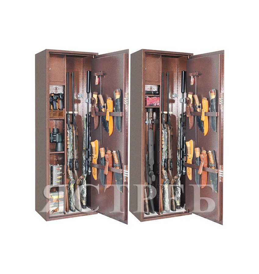 ОписаниеПолностью удовлетворяет требованиям МВД к хранению оружия физическими лицами. Металический шкаф имеет коррозионно- и износо-стойкое, гигиенически-безопасное полимернопорошковое покрытие на основе материалов производства Италии. Замок Оружейный шкаф оборудован двумя сертифицированными трёхригельными замками третьего класса. Защита Дверь имеет коробчатую конструкцию для дополнительного усиления.Петли-внутренние. Внутреннее устройство Внутреннее устройство оружейного шкафа: запираемое (патронное) отделение и 3 съемные регулируемые по высоте полки. На внутренней стороне двери этого оружейного шкафа есть держатели для хранения ножей и крючки для хранения шомполов, ключей и т.п. Ружья можно хранить как по одну сторону от перегородки, так и по обе стороны от перегородки. Дно оружейного шкафа отделано ковролином. Этот шкаф уже укомплектован удобными мягкими ложементами, рассчитанными на хранение 3 стволов. Ложементы изготовлены из экологически чистого эластичного и влагостойкого полимерного материала, устойчивого к деформации и разрыву. Ложементы легко устанавливаются в любое нужное место сейфа при помощи специальной клеевой основы на обратной стороне, и надежно фиксируют оружие внутри сейфа. Установка Предусмотрена возможность крепления сейфа к стене. По желанию заказчика возможна так же поставка в исполнении, предусматривающем крепление и к полу.