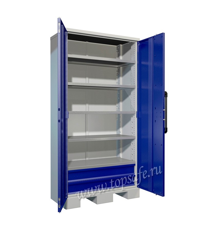 Корпус окрашен в серый полуматовый цвет (RAL 7038), двери - в синий (RAL 5002). Шкаф имеет порошковое покрытие.