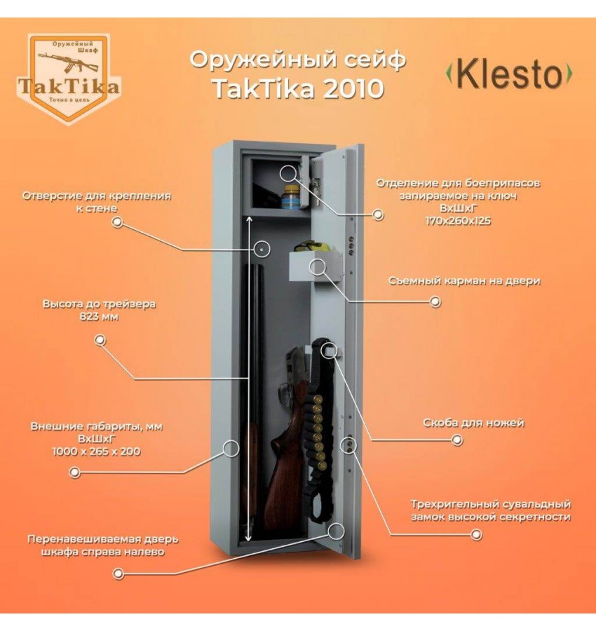 ОписаниеОруженый шкаф TakTika 2010 полностью соответствует требованиям извложенным в статье 59 Постановлениия Правительства России от 21 июля 1998 г. № 814 «О мерах по регулированию оборота гражданского и служебного оружия и патронов к нему на территории Российской Федерации» и приказу МВД ПРИКАЗ от 12 апреля 1999 г. N 288 ДоставкаСтоимость доставки по Москве в пределах МКАД: при заказе от 20 000 рублей бесплатно, менее 20000 руб - 1200 рублей Доставка возможна на 14.12.2025 или на 15.12.2025 Доставка по РФ и СНГ: по тарифам транспортных компаний Стоимость разгрузки: 50 руб СамовывозСамовывоз: со склада, после после подтверждения заказа ОплатаОплата: наличными при получении товара, безналичный расчет ( 100% предоплата) Шкаф Klesto Taktika 2010 |