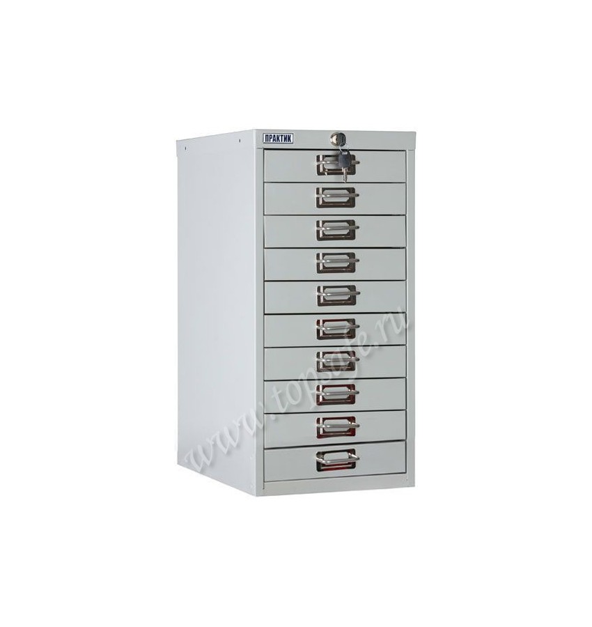 ОписаниеШкаф Практик MDC-A4/650/10 имеет 10 ящиков, каждый из которых оснащен информационной табличкой. Ящики выдвигаются полностью при любой загрузке. Шкаф оснащен центральным ключевым замком. Окрашен в серый полуматовый цвет (RAL 7038).