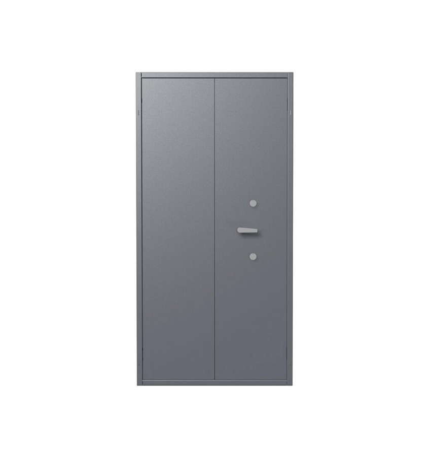 Комплектуются двумя ключевыми сувальдными замками класс 2 ГОСТ 5089-2011 (по 2 ключа от каждого замка в комплекте) с опечатывающими устройствами. Поворотная ручка для удобства открывания и закрывания. Левая створка двери оборудована двумя подпружиненными самозапирающимися защелками (вверх и вниз) с приводом от ручки находящейся на внутренней стороне створки двери