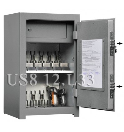 Универсальный сейф, может использоваться как личный, офисный или бухгалтерский сейф, а также как сейф для хранения пистолетов, боеприпасов и т.п. Полностью удовлетворяет требованиям МВД для юридических и физических лиц. Сейф имеет гигиенически безопасное износо- и коррозионно-устойчивое полимерно-порошковое покрытие на основе материалов производства Италии и Франции. Имеются покрытия различных цветов и структур: металлики, антики и д.р. Различные варианты цветового дизайна, например: корпус и двери имеют одинаковое покрытие, либо корпус и двери имеют покрытия разного цвета. Замок В модификации .L33 наружная дверь сейфа оборудована двумя сертифицированными трехригельными сувальдными ключевыми замками третьего класса. Замки разработанны компанией CISA (Италия). Сейф оборудован опломбирующим устройством. Возможна установка дополнительных опломбирующих устройств либо опломбирующих устройств других типов. Защита Изготовлен из стали толщиной 3мм. Дверь усиленная коробчатая. Петли внутренние из стали 6 мм., усиленный корпус. Внутреннее устройство Внутреннее запираемое отделение и съемная полка с регулируемой высотой установки. На внутренней стороне двери сейфа имеется рамка под список личного состава, либо опись. Установка Предусмотрена возможность крепления сейфа к стене (уточнять при заказе). Возможно изготовление в варианте предусматривающем также крепление к полу. Модификации По желанию заказчика сейф дополнительно может комплектоваться пистолетными ложементами (пластиковыми либо деревянными) и колодками под патроны. Возможно изменение габаритов, конструкции и внутреннего устройства изделий, а также изготовление несерийных изделий. Возможна поставка сейфов этой серии с установленным датчиком охранной системы для дальнейшего подключения сирен, ревунов, оповещателей и других охранных систем. Имеются различные цвета