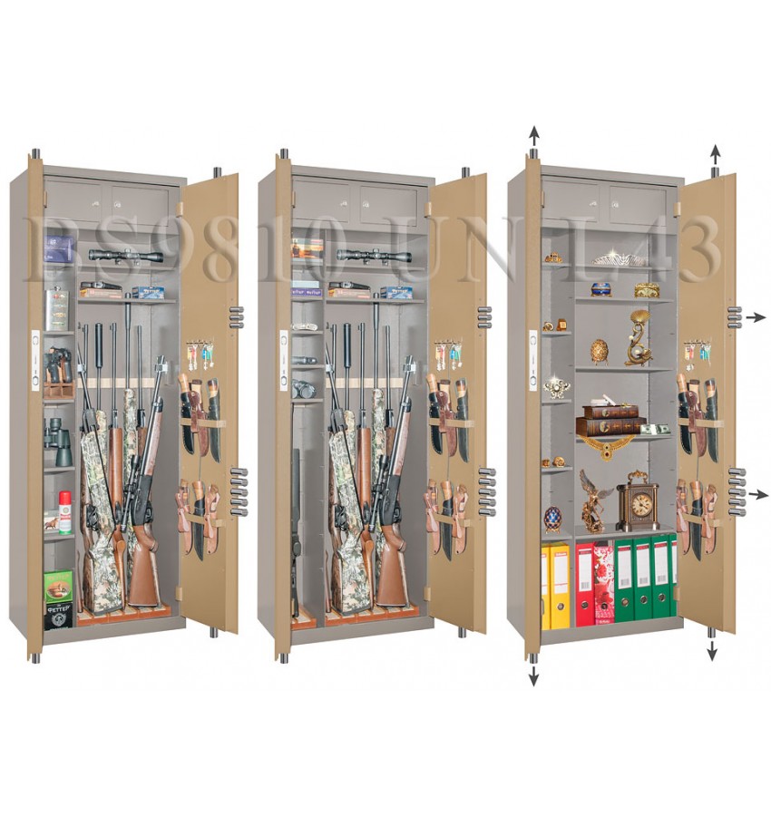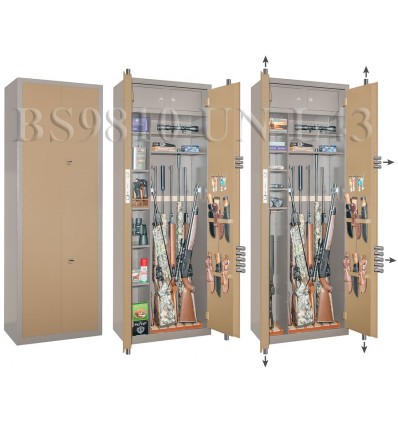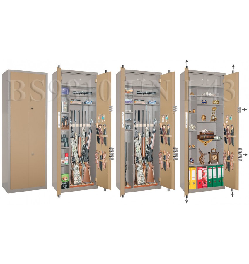 Универсальный сейф, может использоваться как оружейный сейф либо как личный (офисный) сейф. Полностью удовлетворяет требованиям МВД для физических и юридических лиц. Сейф имеет гигиенически безопасное износо- и коррозионно-устойчивое полимерное порошковое покрытие на основе материалов производства Италии и Франции. Имеются покрытия различных цветов и структур: металики, антики и д.р. Различные варианты цветового дизайна, например: корпус и двери имеют одинаковое покрытие, либо корпус и двери имеют покрытия разного цвета. Замок Сейф оборудован двумя сертифицированными ключевыми замками: пятиригельный замок 4-го класса!!! повышенной секретности (1,5 миллиона комбинаций) и взломостойкости плюс трёхригельный замок 2 класса. Замки произведены совместно с Cisa (Италия). Также сейф оборудован двумя вертикальными (на каждой двери) ригельными системами с запиранием по всем сторонам. Защита Изготовлен из стали толщиной 3 и 4 мм. Петли – внутренние из стали 6мм. Двери сейфа имеют коробчатую конструкцию для дополнительного усиления. Внутреннее устройство Сейф имеет два внутренних запираемых (патронных) отделения и вертикальную перегородку, которая делит внутреннее пространства сейфа на две области. Внутри широкой области 5 съёмные полки с регулируемой высотой установки, а также нижние и верхние деревянные (c отделкой искусственной кожей) фигурные ложементы на 6 стволов. Также в широкой области имеются 2 роликовых ложемента-зажима (производства Германии) с регулируемой высотой установки. Эти ложементы могут быть использованы для хранения в широкой области седьмого и восьмого стволов либо для дополнительной боковой фиксации оружия с оптикой. Внутри узкой области 5 съёмных полок с регулируемой высотой установки, а также нижние и верхние деревянные (c отделкой искусственной кожей) ложементы на 2 ствола. По желанию заказчика возможна замена верхних деревянных ложементов на роликовые ложементы-зажимы производства Германии либо дополнительная комплектация такими ложементами (например для боковой фиксации оружия с оптикой). Ружья в сейфе можно хранить как в широкой, так и в узкой области. Сейф дополнительно может быть укомплектован пистолетными ложементами (деревянными либо пластиковыми). Внутренняя поверхность одной из дверей сейфа позволяет хранить на ней ножи, шомпола, связки ключей и т.п. Установка Предусмотрена возможность крепления сейфа к стене. По желанию заказчика возможна поставка в исполнении, предусматривающем также крепление и к полу. Модификации Высота хранимых стволов 1445 либо 1640мм., в зависимости от модификации - уточняйте это при заказе. Возможно изготовление модели с фасадом из стального листа толщиной 6мм, стоимость данной модификации выше на 20%. Существует также модель BS9810.L43 Lux, имеющая дополнительно полную внутреннюю мягкую отделку искусственной кожей различных цветов по нашему каталогу. Стоимость такой модели выше на 15%. Полная внутренняя мягкая отделка защищает Ваше оружие от контакта с металлом, царапин, повреждений и т.п. New! Поступила искусственная кожа, имитирующая кожу крокодилов, змей и т.п. Тоже различных цветов! По желанию заказчика сейф дополнительно может быть оборудован опломбирующими устройствами. По желанию заказчика возможно изменение размеров, толщины металла, внутреннего устройства, типа и кол