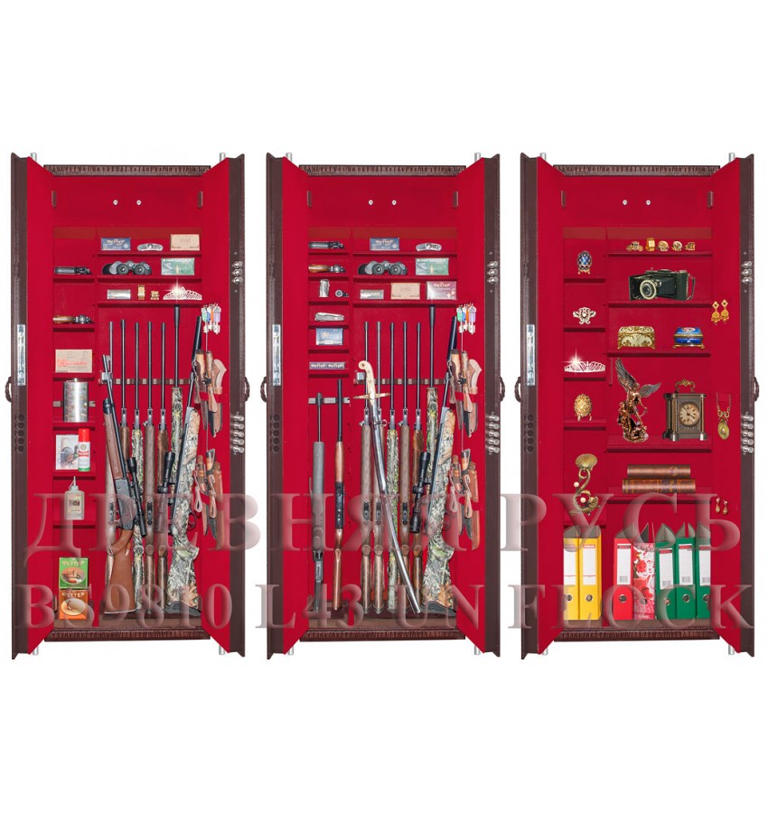Полностью удовлетворяют требованиям МВД для физических и юридических лиц. Сейф имеет гигиенически безопасное износо- и коррозионно-устойчивое полимерно-порошковое покрытие на основе материалов производства Италии и Франции. Имеются покрытия различных цветов и структур: металлики, антики и д.р. Возможно патинирование различных цветов. Размеры даны с учётом выступающей фурнитуры. Замок Сейф оборудован двумя сертифицированными ключевыми замками: пятиригельный замок 4-го класса!!! повышенной секретности (1,5 миллиона комбинаций) и взломостойкости плюс трёхригельный замок 3 класса. Замки произведены совместно с Cisa (Италия). По желанию заказчика возможна поставка сейфов с замками производства Германии: Mauer или Wittkopp. Сейф имеет две мощные вертикальные (для каждой двери) и горизонтальную ригельные системы с запиранием по всем сторонам. Защита Изготовлен из стали толщиной 3 и 4 мм. Петли – внутренние из стали 6мм. Двери сейфа имеют коробчатую конструкцию для дополнительного усиления. Усиленный корпус. Данная кованная инкрустация выполнена в виде мощных стальных полос. Такая инкрустация кроме декоративной функции служит также для дополнительного усиления дверей и фасада корпуса сейфа. Внутреннее устройство Внутри сейфа два запираемых (патронных) отделения и вертикальная перегородка которая делит внутреннее пространство сейфа на две области. Внутри «широкой» области 5 съёмных полок и деревянные ложементы на шесть стволов. Также в «широкой» области имеются два боковых роликовых зажима с регулируемой высотой установки (для хранения в широкой области седьмого и восьмого ствола либо для дополнительной фиксации оружия с оптикой). Внутри «узкой» области 5 съёмных полок и деревянные ложементы на два ствола. Все полки с регулируемой высотой установки. Ружья можно хранить как по одну сторону от перегородки, так и по обе стороны от перегородки. По желанию заказчика возможна поставка с дополнительными полками. На внутренней поверхности одной из дверей сейфа имеются два держателя для хранения ножей и крючки для хранения шомполов, ключей и прочего. Установка Предусмотрена возможность крепления сейфа к стене. По желанию заказчика возможна поставка в исполнении, предусматривающем также крепление и к полу. Модификации В зависимости от типа внутренней отделки имеются три модификации этих оружейных сейфов. Модификация Primary имеет деревянные ложементы отделанные искусственной кожей. Модификация Lux имеет дополнительную мягкую полную внутреннюю отделку искусственной кожей. Различные варианты цвета бархата и искусственной кожи по нашему каталогу. Модификация Flock имеет полную внутреннюю мягкую отделку флокированием бархатом (различных цветов по нашему каталогу), а также другие (премиум) ложементы. На фотографиях в открытом виде приведён пример сейфа, выполненного в модификации Flock. В данном случае флок – красный. Полная внутренняя мягкая отделка защищает Ваше оружие от контакта с металлом, царапин, повреждений и т.п. По желанию заказчика возможно изменение размеров, толщины металла, внутреннего устройства и т.п. Возможно изготовление кованой инкрустации по эскизу заказчика. Высота хранимых стволов 1440 либо 1655мм., в зависимости от модификации - уточняйте это при заказе. Возможна поставка сейфов не только с ключевыми замками, но так же и с э