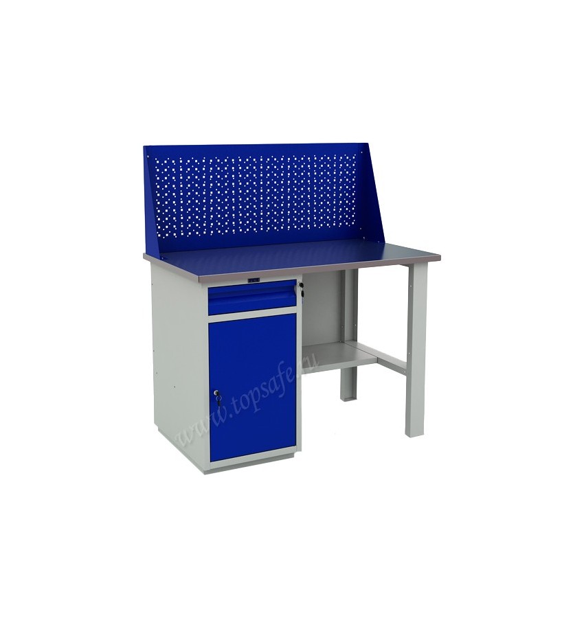 Верстак состоит из столешницы WT-120, опоры WF-1, полки и стенки WSh-120/1, тумбы WD2, перфорированного экрана. Указанная высота не учитывает высоту экрана.