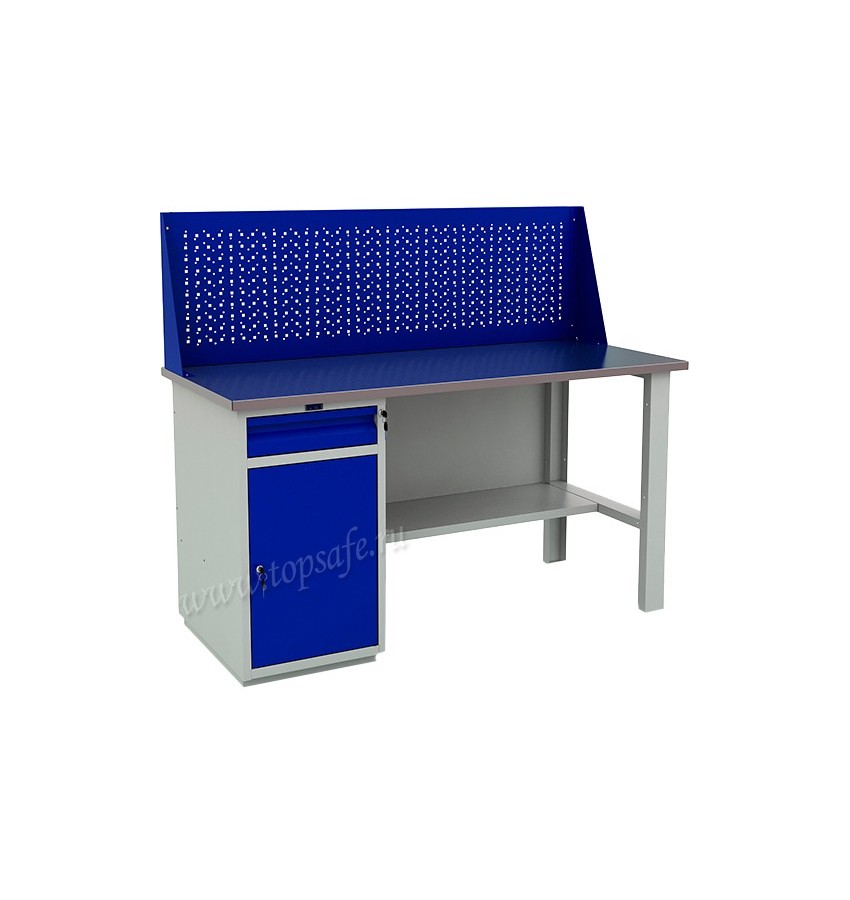 Верстак оснащен тумбой с двумя съемными полками и выдвижным ящиком на телескопических направляющих. Два ключевых замка позволяют порознь запирать ящик и основное отделение тумбы.