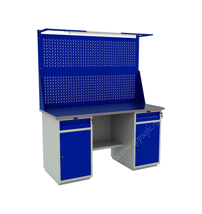 Верстак состоит из столешницы WT-160, полки и стенки WSh-160/2, двух тумб WD-2, двух перфорированных экранов и комплекта светодиодного освещения.