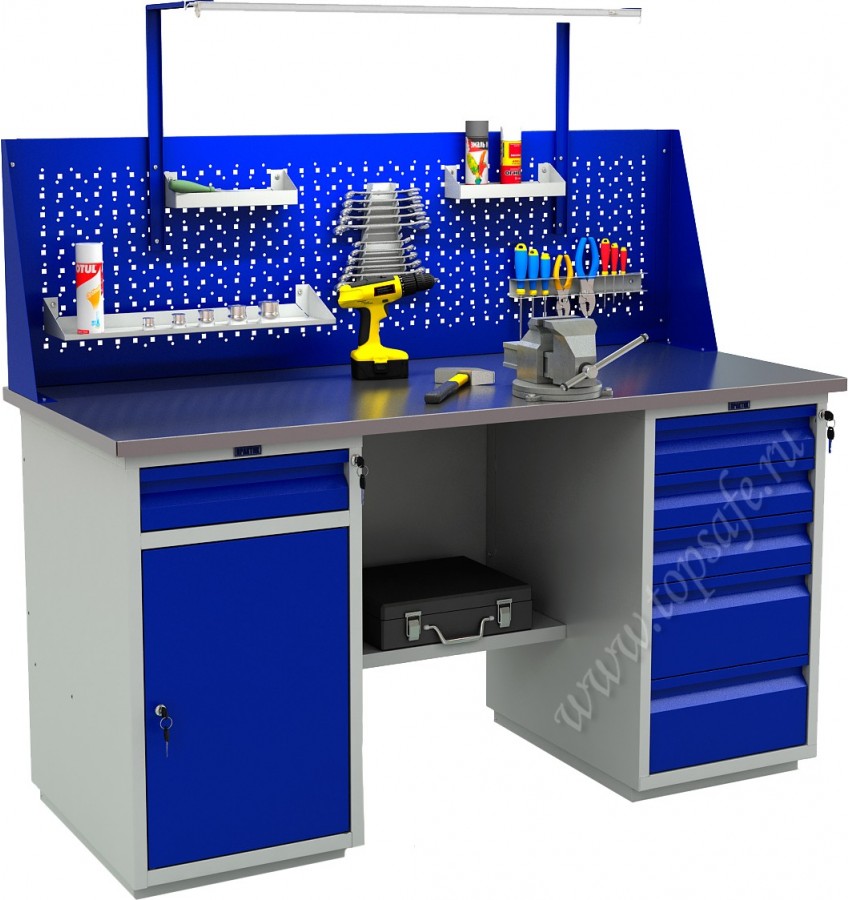 ОписаниеВерстак Практик WT 160.WD2/WD5.011 подходит для обустройства комфортного рабочего места на предприятиях и различных заведениях. Оснащен двумя тумбами и перфорированным экраном, позволяющими удобно разместить необходимые инструменты. Тумбы оборудованы ключевыми замками, регулируемыми полками и выдвижными ящиками. Количество ящиков: 5 (тумба WD5) + 1 (тумба WD2). Максимальная нагрузка на полку/ящик - 30 кг.