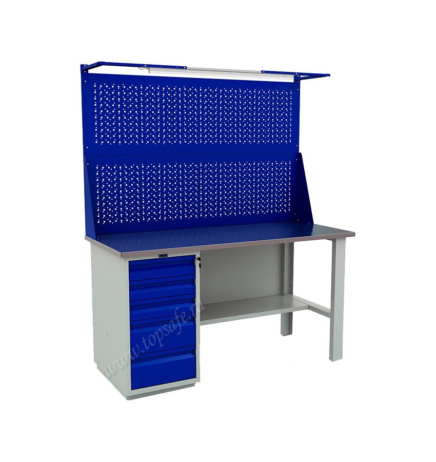 ОписаниеМеталлический верстак Практик WT 160.WD5/F1.021 - удобный "стол" для обустройства комфортного рабочего места. Столешница модели выполнена из фанеры (24 мм) и оцинкованной стали толщиной 1.5 мм. Тумба оснащена пятью выдвижными ящиками на телескопических направляющих. Центральный ключевой замок позволяет запирать все ящики одновременно. Нагрузка на ящик - до 30 кг.
