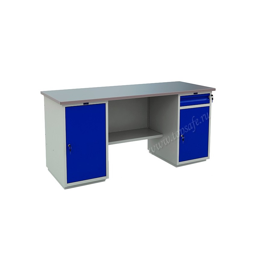 Верстак оборудован двумя тумбами: одна имеет две съемные полки, а вторая - 2 полки и выдвижной ящик. Возможная нагрузка на ящик/полку - 30 кг. Тумбы запираются на ключ.