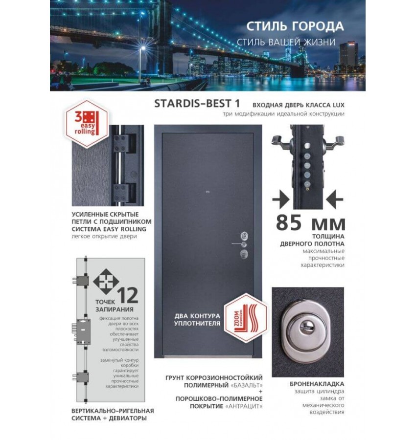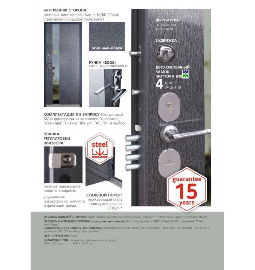 Внешняя отделка (складская программа): Грунт коррозионностойкий полимерный “Базальт” + порошковый окрас “Антрацит” (№21). Внутренняя отделка (складская программа): Лист металла 1мм + МДФ (10мм) №100 с зеркалом “Огни Нью-Йорка”. (комплектация по запросу, без доплаты): МДФ фрезеровка из коллекции “Классика”, “Авангард” (на выбор). Пленка ПВХ категории “А”, “В” на выбор (без доплаты). Замок: Двухсистемный MOTTURA 939 (класс защиты 4). Фурнитура: Броненакладка BD-16; Ручка EDGE; Ручка к задвижке замка; Ответная планка для регулировки притвора; Глазок широкоугольный. Цвет фурнитуры: хром. Размерный ряд (может быть расширен по запросу): 900 х 2050 мм 960 х 2050 мм ДоставкаСтоимость доставки по Москве в пределах МКАД: при заказе от 20 000 рублей бесплатно, менее 20000 руб - 1200 рублей Доставка возможна на 13.12.2025 или на 14.12.2025 Доставка по РФ и СНГ: по тарифам транспортных компаний Стоимость разгрузки: нет данных СамовывозСамовывоз: со склада, после после подтверждения заказа ОплатаОплата: наличными при получении товара, безналичный расчет ( 100% предоплата) Входная дверь Stardis Best 1 |