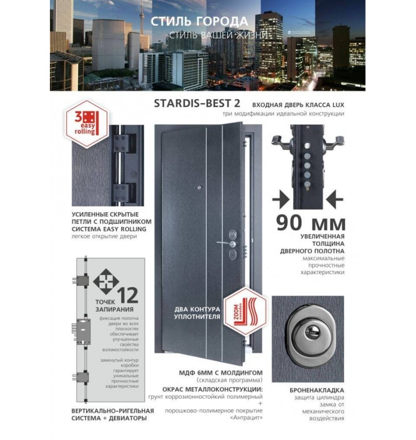 ОписаниеТехнические характеристики: - Увеличенная толщина дверного полотна 90мм. - Вертикально-ригельная система + девиаторы (2шт.) - Усиленные скрытые петли с подшипником по системе «easy rolling» - 3шт. - Два контура уплотнителя (на дверном полотне и коробке). - Заполнение дверного полотна - минеральная вата URSA в два слоя. - Два противосъемных штыря. - Планка регулировки притвора. - Гарантия 15 лет. Внешняя отделка (складская программа): ГМДФ (6мм) с молдингом “Хром”, с пленкой ПВХ “Огни Нью-Йорка” на клей (комплектация по запросу, без доплаты): МДФ фрезеровка из коллекции “Классика”, “Авангард” (на выбор). Пленка ПВХ категории “А”, “В” на выбор (без доплаты). Внутренняя отделка (складская программа): Лист металла 1мм + МДФ (10мм) №100 с зеркалом “Огни Нью-Йорка”. (комплектация по запросу, без доплаты): МДФ фрезеровка из коллекции “Классика”, “Авангард” (на выбор). Пленка ПВХ категории “А”, “В” на выбор (без доплаты). Замок: Двухсистемный MOTTURA 939 (класс защиты 4). Фурнитура: Броненакладка BD-16; Ручка EDGE; Ручка к задвижке замка; Ответная планка для регулировки притвора; Глазок широкоугольный. Цвет фурнитуры: хром. Размерный ряд (может быть расширен по запросу): 900 х 2050 мм 960 х 2050 мм ДоставкаСтоимость доставки по Москве в пределах МКАД: при заказе от 20 000 рублей бесплатно, менее 20000 руб - 1200 рублей Доставка возможна на 06.12.2025 или на 07.12.2025 Доставка по РФ и СНГ: по тарифам транспортных компаний Стоимость разгрузки: нет данных СамовывозСамовывоз: со склада, после после подтверждения заказа ОплатаОплата: наличными при получении товара, безналичный расчет ( 100% предоплата) Входная дверь Stardis Best 2 |