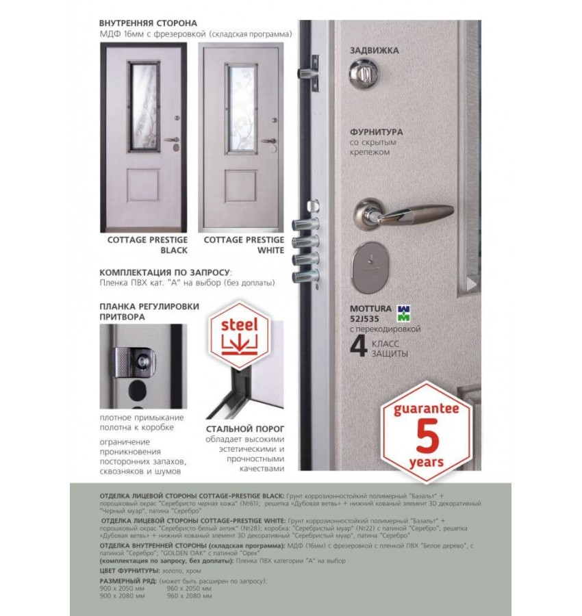 ОписаниеТехнические характеристики: - Увеличенная толщина дверного полотна 90мм. - Усиленные скрытые петли с подшипником по системе «easy rolling» - 3шт. - Два контура уплотнителя (на дверном полотне и коробке). - Заполнение дверного полотна - минеральная вата URSA в два слоя. - Стеклопакет в оконный проем – двухкамерный. - Накладка на порог («нержавейка», латунь – в зависимости от цвета фурнитуры). - Два противосъемных штыря. - Планка регулировки притвора. - Гарантия 5 лет. Внешняя отделка COTTAGE-PRESTIGE BLACK: Грунт коррозионностойкий полимерный “Базальт” + порошковый окрас “Серебристо черная кожа” (№61); решетка «Дубовая ветвь» + нижний кованый элемент 3D декоративный “Черный муар”, патина “Серебро“.. Внешняя отделка COTTAGE-PRESTIGE WHITE: Грунт коррозионностойкий полимерный “Базальт” + порошковый окрас “Серебристо-белый антик” (№28); коробка: “Серебристый муар” (№22) с патиной “Серебро“, решетка «Дубовая ветвь» + нижний кованый элемент 3D декоративный “Серебристый муар”, патина “Серебро“. Внутренняя отделка (складская программа): МДФ (16мм) с фрезеровкой с пленкой ПВХ “Белое дерево“, с патиной “Серебро“; “GOLDEN OAK” с патиной “Орех“.. (комплектация по запросу, без доплаты): Пленка ПВХ категории “А” на выбор. Отделка: Решетка «Дубовая ветвь» + нижний кованый элемент 3D декоративный - “Медный муар” (№25), патина “Золото“. Замок: Врезной замок MOTTURA 52J535 (класс защиты 4) с перекодировкой. Фурнитура: Ручка SFERA; Ручка к задвижке замка; Ответная планка для регулировки притвора. Цвет фурнитуры: золото, хром. Размерный ряд (может быть расширен по запросу): 900 х 2050 мм 960 х 2050 мм 900 х 2080 мм 960 х 2080 мм ДоставкаСтоимость доставки по Москве в пределах МКАД: при заказе от 20 000 рублей бесплатно, менее 20000 руб - 1200 рублей Доставка возможна на 15.12.2025 или на 16.12.2025 Доставка по РФ и СНГ: по тарифам транспортных компаний Стоимость разгрузки: нет данных СамовывозСамовывоз: со склада, после после подтверждения заказа ОплатаОплата: наличными при получении товара, безналичный расчет ( 100% предоплата) Входная дверь Stardis Cottage Prestige Black |