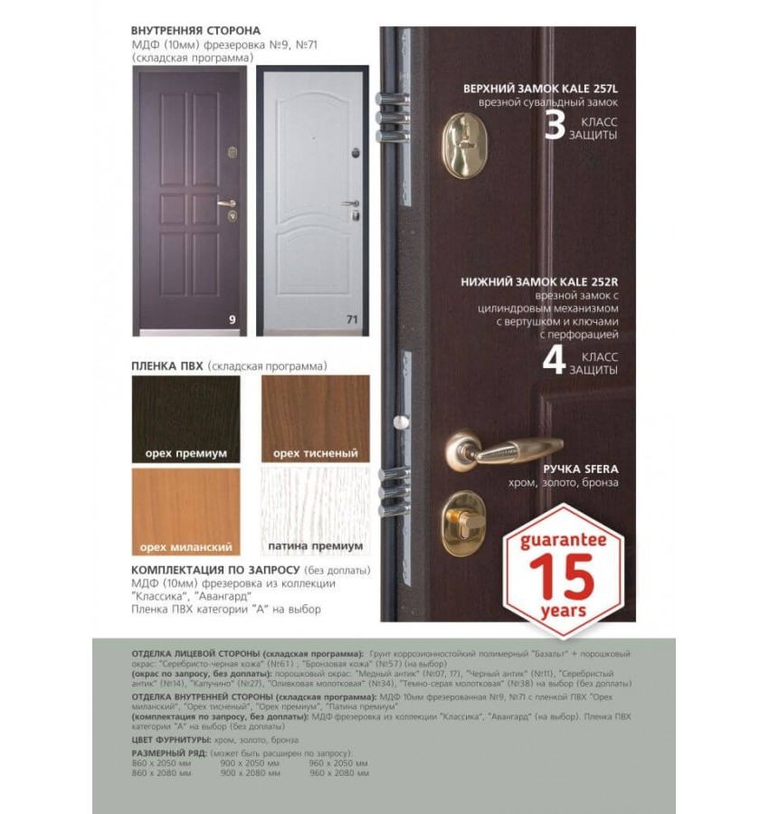 Фурнитура>: Броненакладка BD-16 на цилиндровый механизм; Ручка SFERA; Ответная планка для регулировки притвора; Глазок широкоугольный.
