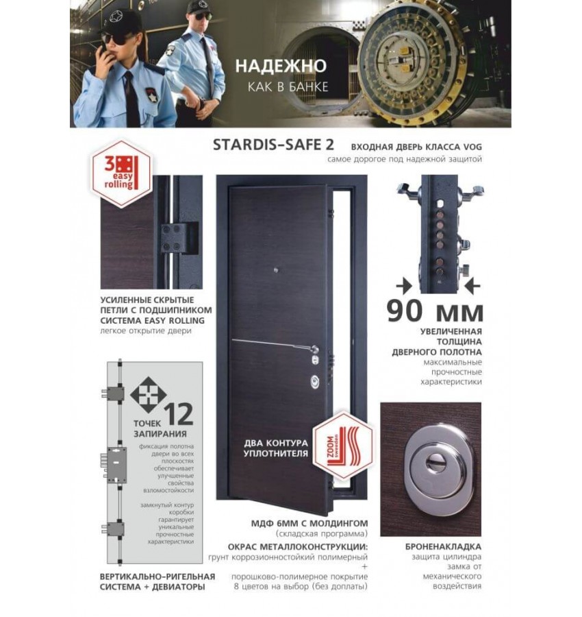 ОписаниеТехнические характеристики: - Увеличенная толщина дверного полотна 90мм. - Вертикально-ригельная система + девиаторы (2шт.) - Усиленные скрытые петли с подшипником по системе «easy rolling» - 3шт. - Два контура уплотнителя (на дверном полотне и коробке). - Заполнение дверного полотна - минеральная вата URSA в два слоя. - Два противосъемных штыря. - Планка регулировки притвора. - Гарантия 15 лет. Окрас металлоконструкции: Грунт коррозионностойкий полимерный “Базальт” + порошковый окрас: “Медный антик” (№07, 17), “Черный антик” (№11), “Серебристый антик” (№14), “Капучино” (№27), “Оливковая молотковая” (№34), “Темно-серая молотковая” (№38) на выбор (без доплаты). Внешняя отделка (складская программа): МДФ 6мм с молдингом “Хром” с пленкой ПВХ “Венге Горизонт” на клей. (комплектация по запросу, без доплаты): МДФ фрезеровка из коллекции “Классика”, “Авангард” (на выбор). Пленка ПВХ категории “А” на выбор (без доплаты). Внутренняя отделка (складская программа): МДФ 6мм с молдингом “Хром” с пленкой ПВХ “Венге Горизонт”. (комплектация по запросу, без доплаты): МДФ фрезеровка из коллекции “Классика”, “Авангард” (на выбор). Пленка ПВХ категории “А” на выбор (без доплаты). Замок: Трехсистемный METTEM 3B13-174 (класс защиты 4). Фурнитура: Броненакладка BD-16; Ручка EDGE; Ручка к задвижке замка; Ответная планка для регулировки притвора; Глазок широкоугольный. Цвет фурнитуры: хром. Размерный ряд (может быть расширен по запросу): 860 х 2050 мм 960 х 2050 мм ДоставкаСтоимость доставки по Москве в пределах МКАД: при заказе от 20 000 рублей бесплатно, менее 20000 руб - 1200 рублей Доставка возможна на 06.12.2025 или на 07.12.2025 Доставка по РФ и СНГ: по тарифам транспортных компаний Стоимость разгрузки: нет данных СамовывозСамовывоз: со склада, после после подтверждения заказа ОплатаОплата: наличными при получении товара, безналичный расчет ( 100% предоплата) Входная дверь Stardis Safe 2 |