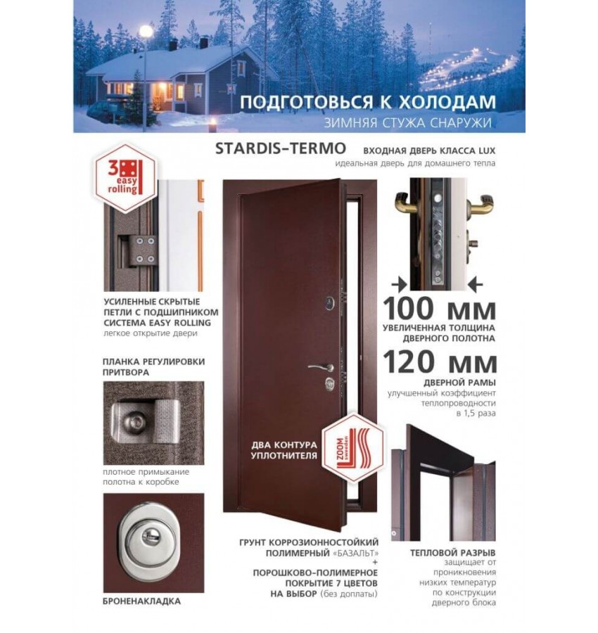 ОписаниеТехнические характеристики: - Увеличенная толщина дверного полотна 100мм. - Толщина дверной рамы 120мм. - Усиленные скрытые петли с подшипником по системе «easy rolling» - 3шт. - Два контура уплотнителя (на дверном полотне и коробке). - Контур пробкового материала. - Заполнение дверного полотна - минеральная вата URSA в два слоя. - Два противосъемных штыря. - Планка регулировки притвора. - Гарантия 5 лет. Внешняя отделка: Грунт коррозионностойкий полимерный “Базальт”+ порошковый окрас: “Медный антик” (№07, 17), “Черный антик” (№11), “Серебристый антик” (№14), “Капучино” (№27), “Оливковая молотковая” (№34), “Темно-серая молотковая” (№38) на выбор. Внутренняя отделка: МДФ 6мм ламинированная “Венге“, “Вишня Оксфорд“, “Штрих лак“, “Орех итальянский“, “Орех Миланский“, “Дуб Ардеш“ на выбор (без доплаты). Верхний замок: Врезной замок KALE 257 (класс защиты 4). Нижний замок: Врезной замок MOTTURA 52J535 (класс защиты 4) с перекодировкой. Фурнитура: Броненакладка BD-16; Ручка «Сарагоса»; Ответная планка для регулировки притвора. Цвет фурнитуры: хром, латунь, бронза. Размерный ряд (может быть расширен по запросу): ширина до 1000мм высота до 2150мм ДоставкаСтоимость доставки по Москве в пределах МКАД: при заказе от 20 000 рублей бесплатно, менее 20000 руб - 1200 рублей Доставка возможна на 06.12.2025 или на 07.12.2025 Доставка по РФ и СНГ: по тарифам транспортных компаний Стоимость разгрузки: нет данных СамовывозСамовывоз: со склада, после после подтверждения заказа ОплатаОплата: наличными при получении товара, безналичный расчет ( 100% предоплата) Входная дверь Stardis Termo Lux |